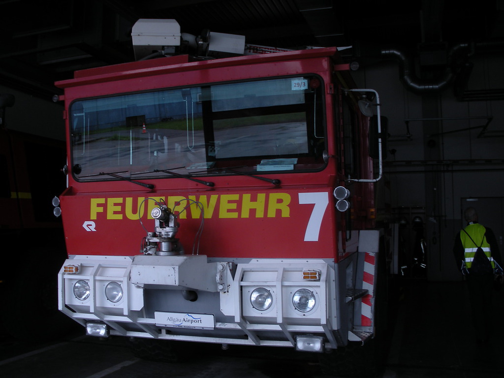 Wann sieht man als Normalsterblicher schon einmal aus nächster Nähe ein Löschfahrzeug, das nahezu eine Million € kostet, in 3 Minuten einsatzbereit ist und 10.000 Liter Löschmittel in 3 Minuten über einem brennenden Objekt ausgießen kann? Der Leiter der Flughafenfeuerwehr Memmingen machte diesen Teil der Führung zu einem spannenden Frage- und Antwortspiel und gerne nahm der eine oder andere die Gelegenheit wahr, in das Führerhaus dieser Löschgiganten zu klettern - einfach grandios!