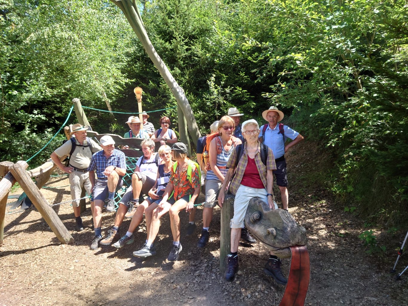 Am Ende des Tobels, nach einem wiederum steilen Aufstieg, erfreute uns im Schatten, ein kleiner Senioren-Kinder-Spielplatz mit einer Riesen-Holzschlange und anderen Attraktionen. Ein letzter Schluck aus der Pulle bereitete uns auf den heißen Rückweg zum Parkplatz hin. Wohlbehalten und verschwitzt kamen wir an und begaben uns sogleich in unser Terrassen-Kaffee im Schatten eines Landgasthofs und verwöhnten uns mit Eis, Kaffee und Kuchen.