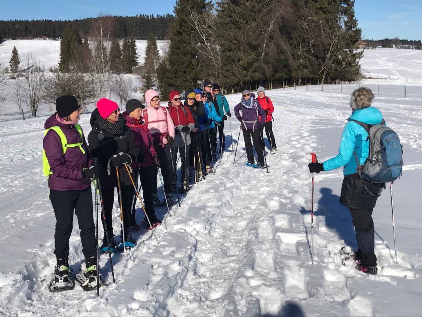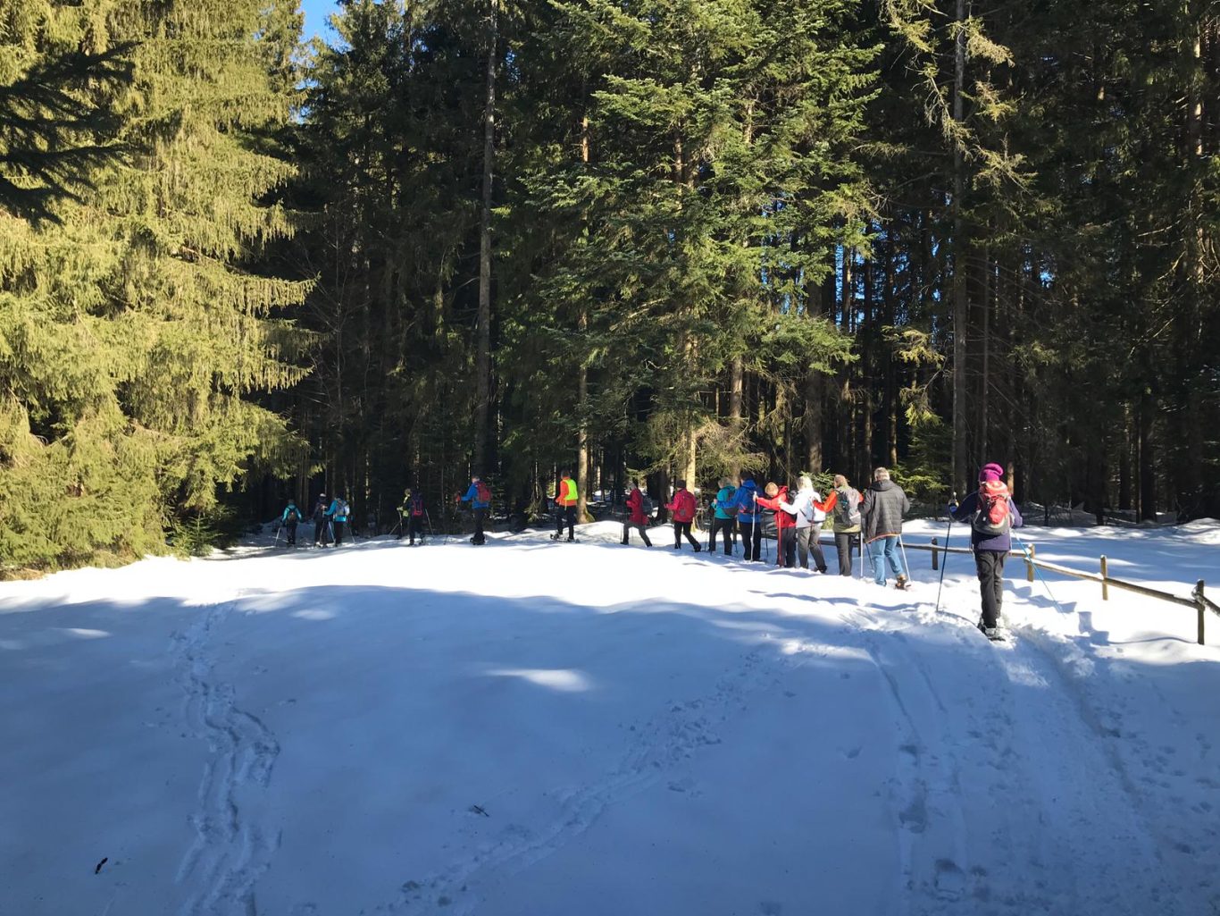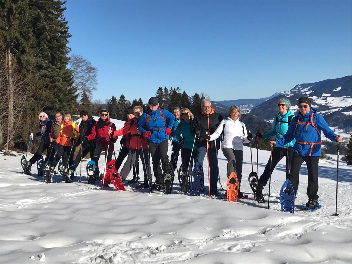 Am Mi 09.02.22 trafen sich trotz vorverlegtem Abfahrtstermin 16 schneeschuh-begeisterte TN am Sportheim. Bereits um 9 Uhr schien die Sonne! Die Fahrt nach Sulzberg verlief ohne Probleme. Schon beim Aussteigen sahen wir die mächtige Bergkette der Nagelfluh und die Berge des Bregenzer Waldes vor strahlend blauem Himmel. Am Startpunkt angekommen halfen die erfahrenen Schneeschuhgeher den weniger Geübten beim Anlegen der Schneeschuhe und bald machten wir uns in der verschneiten Landschaft auf den Weg. Manchmal konnten wir vorhandene Spuren nutzen und sonst gingen versierte Spurwechsler voran! Bald mussten wir Jacken, Pullover, … ablegen, da die Sonne uns angenehm wärmte. Die Tour verlief auch durch ein Naturschutzgebiet, das Wildrosenmoos, das wir im Gänsemarsch durchquerten, um die Landschaft zu schonen. Zur Mittagszeit erreichten wir das ehemalige Grenzerhäuschen zwischen Oberreute und Sulzberg. Nach einer ausgiebigen Vesperpause in froher Runde machten wir uns auf den Rückweg. Dieser verlief nach Westen über offenes Gelände, sodass wir der Sonne entgegen wanderten und immer die verschneiten Berggipfel vor uns sahen. Die Freude über dieses Geschenk der Natur spiegelte sich in den strahlenden Gesichtern der TN. Ein herrlicher Wintertag, den wir in heiterer Stimmung zusammen genießen durften!