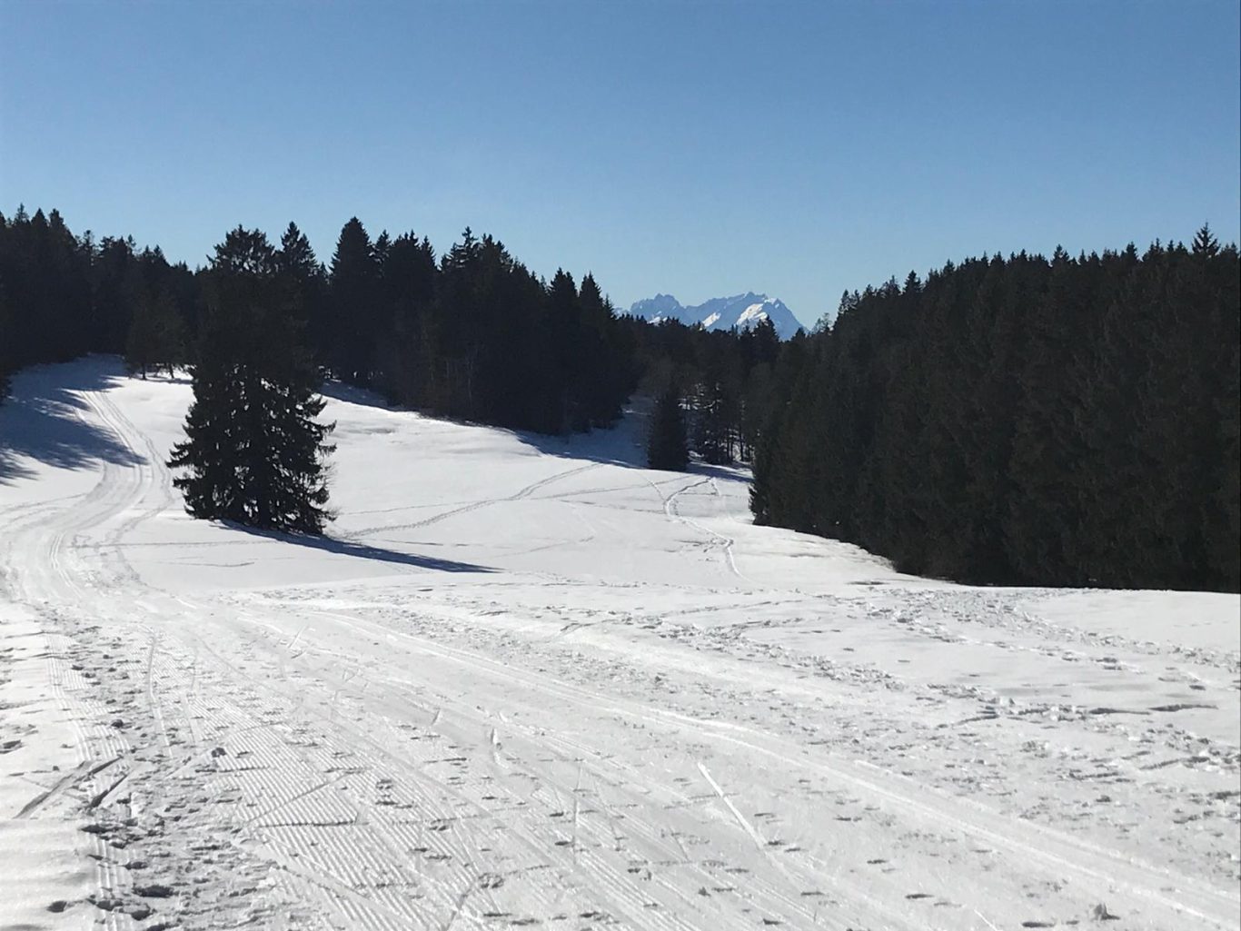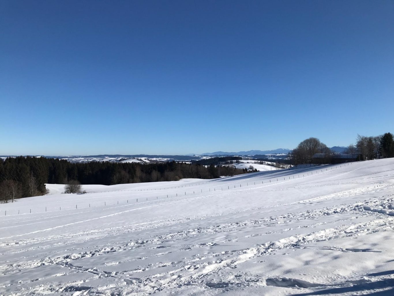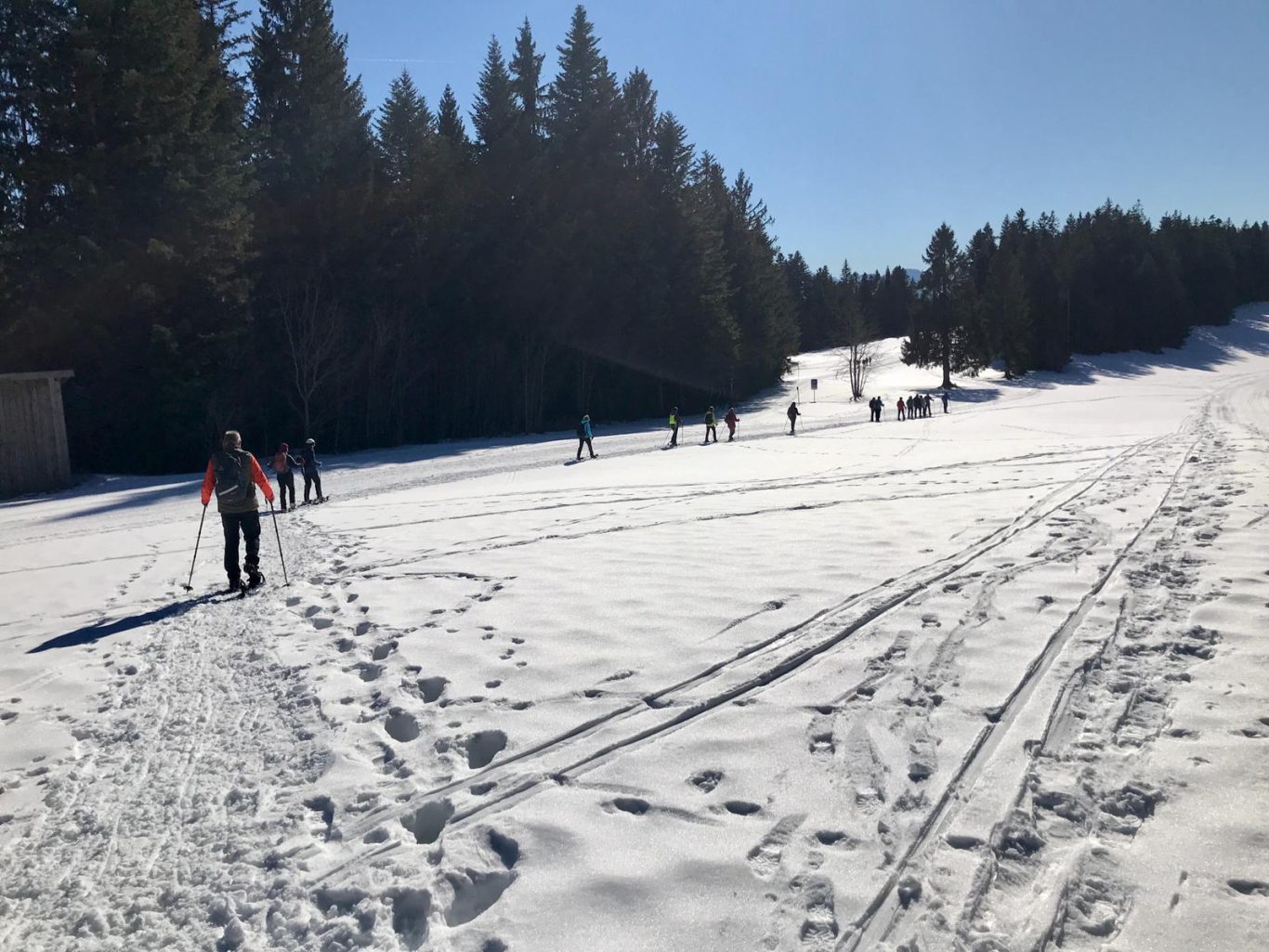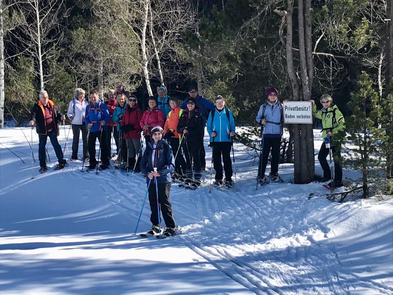 Am Mi 09.02.22 trafen sich trotz vorverlegtem Abfahrtstermin 16 schneeschuh-begeisterte TN am Sportheim. Bereits um 9 Uhr schien die Sonne! Die Fahrt nach Sulzberg verlief ohne Probleme. Schon beim Aussteigen sahen wir die mächtige Bergkette der Nagelfluh und die Berge des Bregenzer Waldes vor strahlend blauem Himmel. Am Startpunkt angekommen halfen die erfahrenen Schneeschuhgeher den weniger Geübten beim Anlegen der Schneeschuhe und bald machten wir uns in der verschneiten Landschaft auf den Weg. Manchmal konnten wir vorhandene Spuren nutzen und sonst gingen versierte Spurwechsler voran! Bald mussten wir Jacken, Pullover, … ablegen, da die Sonne uns angenehm wärmte. Die Tour verlief auch durch ein Naturschutzgebiet, das Wildrosenmoos, das wir im Gänsemarsch durchquerten, um die Landschaft zu schonen. Zur Mittagszeit erreichten wir das ehemalige Grenzerhäuschen zwischen Oberreute und Sulzberg. Nach einer ausgiebigen Vesperpause in froher Runde machten wir uns auf den Rückweg. Dieser verlief nach Westen über offenes Gelände, sodass wir der Sonne entgegen wanderten und immer die verschneiten Berggipfel vor uns sahen. Die Freude über dieses Geschenk der Natur spiegelte sich in den strahlenden Gesichtern der TN. Ein herrlicher Wintertag, den wir in heiterer Stimmung zusammen genießen durften!