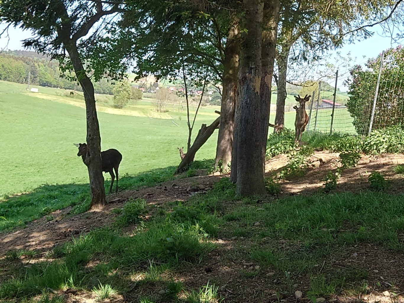 Über die Wiese gings auf den Weg, der zum St. Annahof führt, am Werdich-Haus vorbei. Hier waren zu unserer Überraschung die Hirsche mit ihren Hirschkühen im Schatten versammelt und wir konnten sie aus der Nähe bestaunen. Die Herren hatten vor ein paar Tagen ihre Geweihe abgeworfen und man sah schon das neue Geweih sprießen.