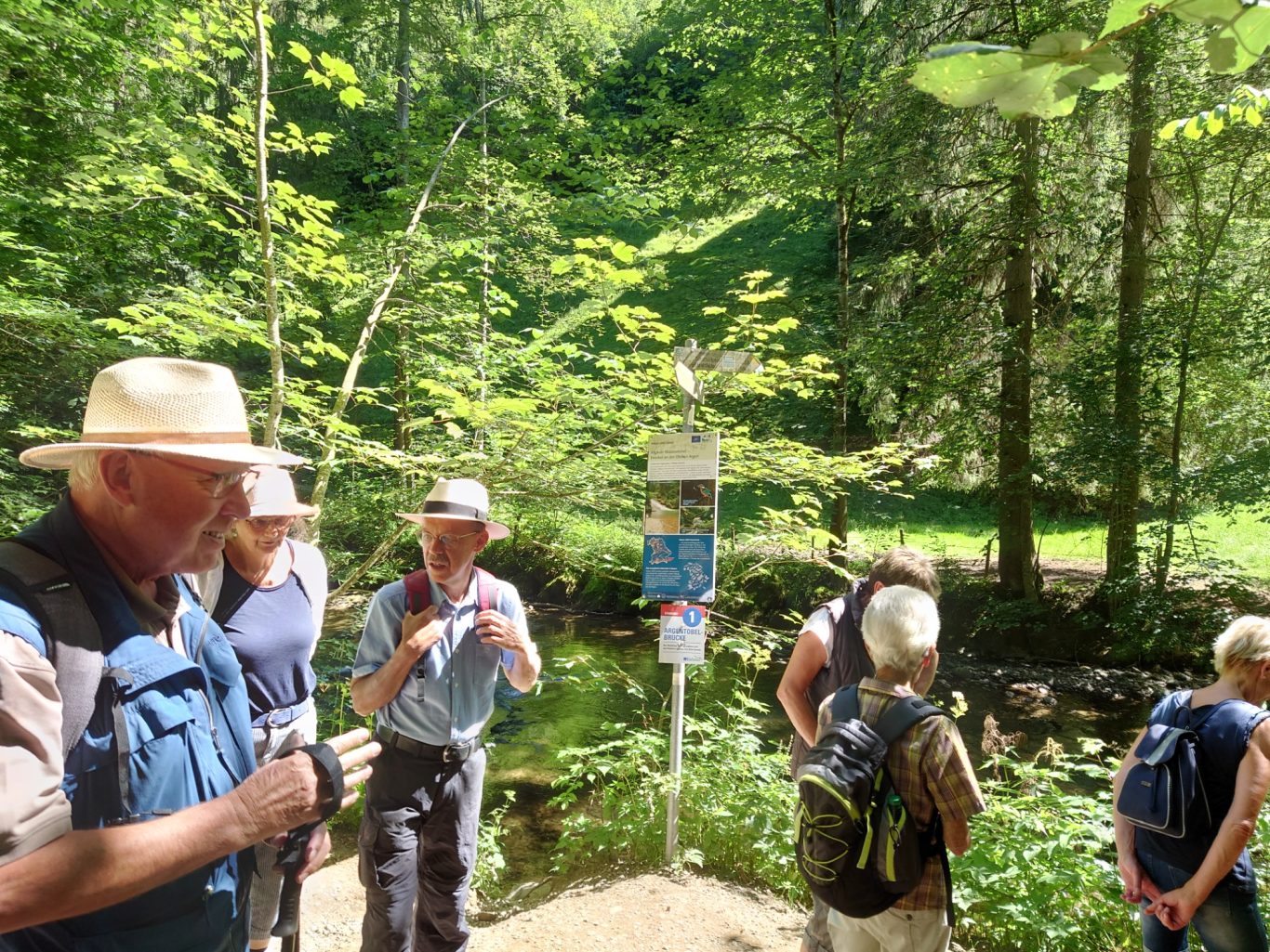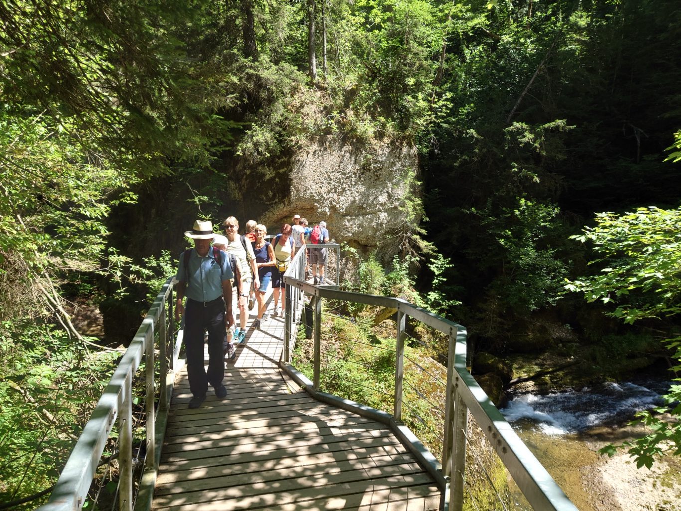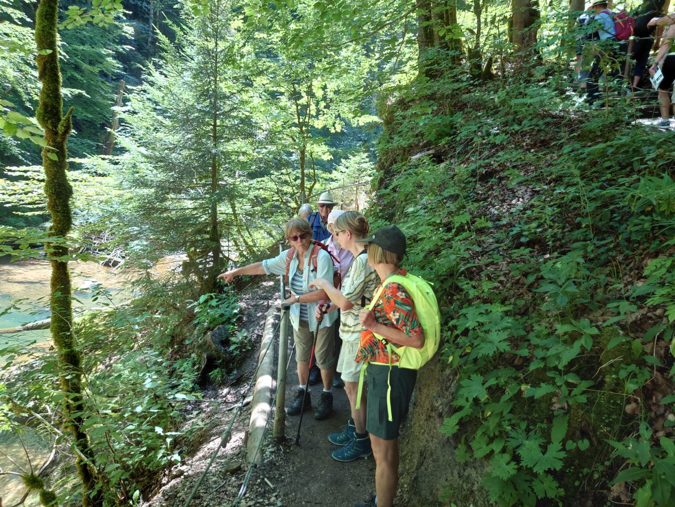 Eine nette Gruppe Spurwechsler wanderte am vergangenen, heißen Mittwoch unter der 54 m hohen Argentobelbrücke hindurch, und im weiteren Weg durch den Eistobel bei Isny-Maierhöfen und genoss die Kühle am Wasser.