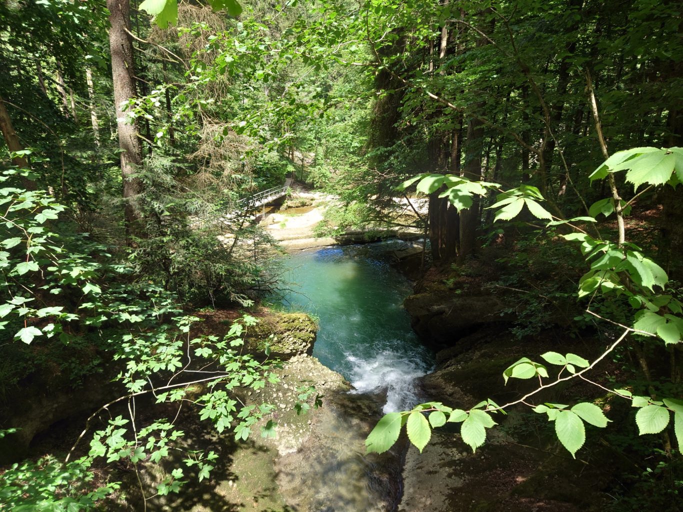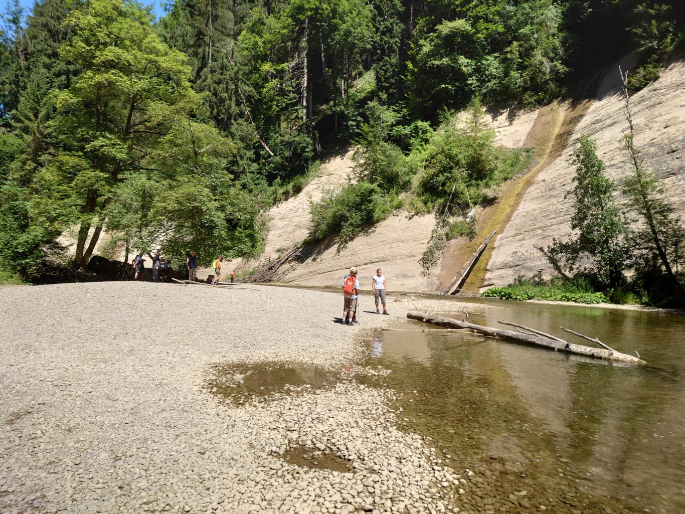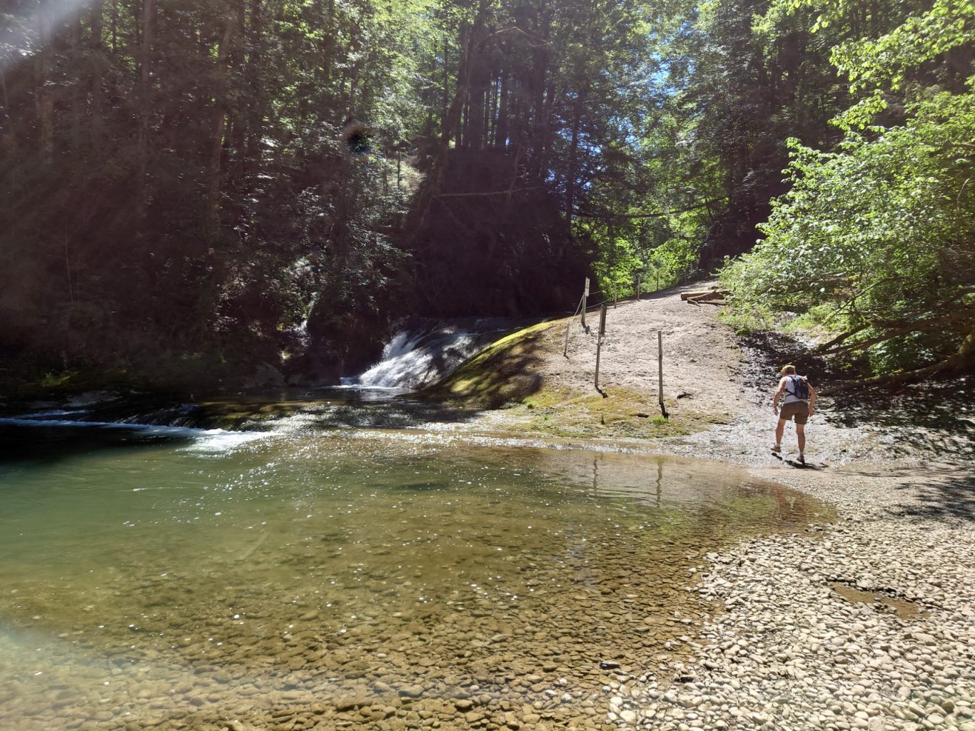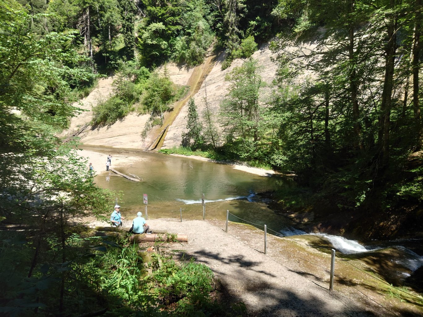 Eine nette Gruppe Spurwechsler wanderte am vergangenen, heißen Mittwoch unter der 54 m hohen Argentobelbrücke hindurch, und im weiteren Weg durch den Eistobel bei Isny-Maierhöfen und genoss die Kühle am Wasser.