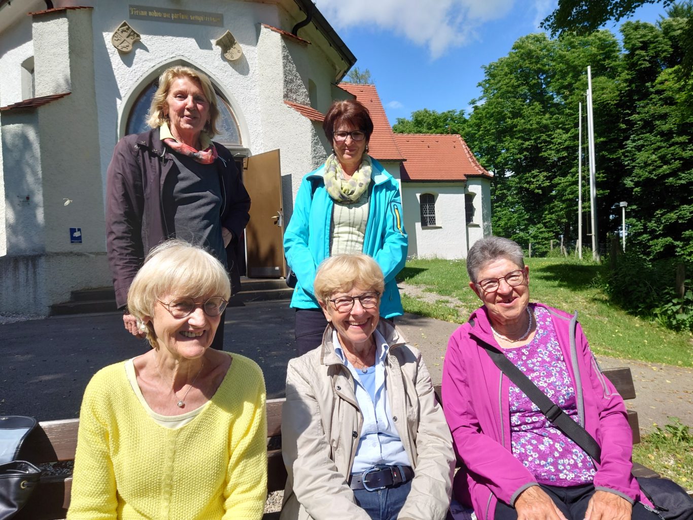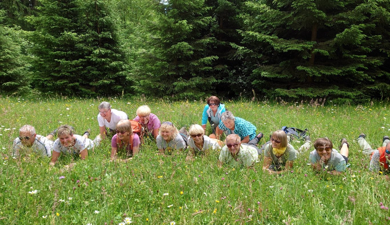 Die Wettervorhersage war gut für Mittwoch, 08.06.2022. Da bei der Ankunft bereits die Sonne schien, machten sich 31 wanderbegeisterte „Spurwechsler“ gut gelaunt auf den Weg. Schon der Parkplatz liegt auf einer aussichtsreichen Anhöhe bei Wiggensbach. In gemächlichem Tempo ging es zunächst sanft ansteigend in Richtung Blender. Die Aussicht auf die Bergkette öffnete sich immer mehr, obwohl die weiter entfernten Gipfel immer wieder in Wolken verhüllt waren. Eine am Weg liegende Kapelle zog unsere Aufmerksamkeit auf sich. Vom Türmchen der Kapelle führte ein dünnes Drahtseil hinüber zu einem Hof bis zum Schlafzimmerfenster. Von dort aus wird zum Angelusgebet geläutet (s.Foto). Auf unserer weiteren Wanderstrecke hörten wir um 12 Uhr das Mittagsläuten. Auf dem Rauenstein -einem Naturschutzgebiet- gingen wir im Gänsemarsch durch blühende Wiesen. Am Blender angekommen hielten wir gemütlich Mittagsrast im „Schatten“ eines mächtigen Sendeturms. Es war recht warm geworden und manche legten sich voll Übermut in die Blumenwiese. Auf dem Rückweg waren die Berggipfel deutlicher zu sehen und wir konnten diese von der Zugspitze bis zum Hochgrat bestaunen. Eifrig plaudernd wanderten wir weiter in Richtung Parkplatz. Im hübschen Glasmacherdorf Schmidsfelden kehrten wir im Burgcafe ein. Die Schattenplätze unter den Bäumen waren begehrt. Die Kunsthandwerker und der Glasbläser hatten ihre Werkstätten und Läden geöffnet und luden zu einem Besuch ein. So ging ein angenehmer Wandertag zu Ende. Die Fotos haben die frohe Stimmung gut eingefangen. Dank an die Fotografen! Vielen Dank auch an Christine und Uli Mebus für die Unterstützung bei der Organisation.