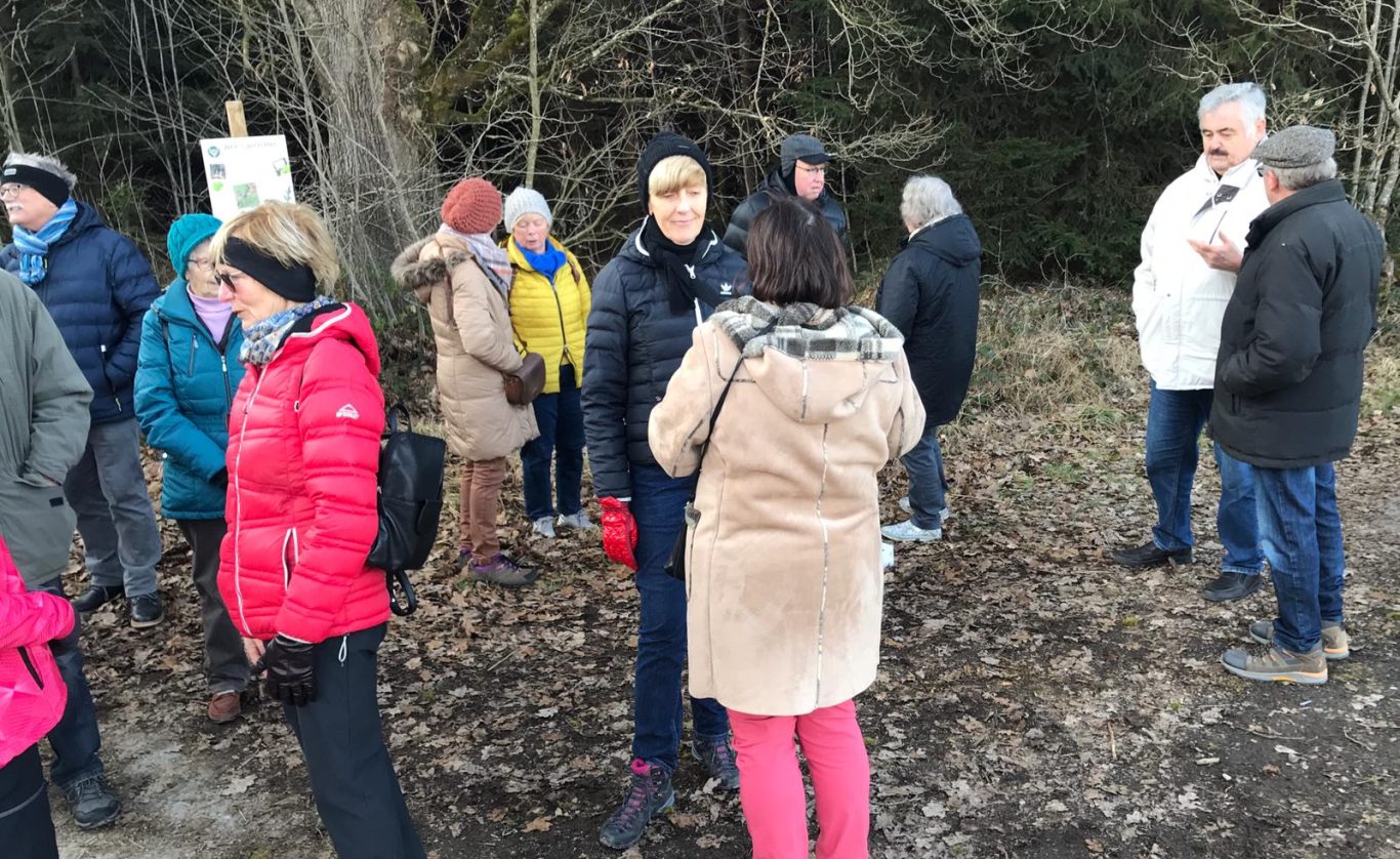 Für die Gruppe ging es zuerst einmal aufwärts durch das Neubaugebiet Burghalde und weiter in die „Säue“. Die Wandergruppe bog dann rechts in einen Feldweg ein. Über dem freien Gelände blies der Wind kräftigt. Auf der Ebene hatte man einen guten Überblick wie zukünftig die Ortsumfahrung von Ochsenhausen verlaufen wird. Bis es soweit ist, vergeht aber sicher noch einige Zeit. Der weitere Weg führte durch Waldabschnitte und freies Feld in stetigem auf und ab. Immer wieder gab es Ausblicke auf Wasenburg, Reinstetten, Goppertshofen und Ochsenhausen. Nach eineinhalb Stunden wurden die Wanderer am Waldrand von Martha und Fritz Weiß erwartet. Sie hatten zur Stärkung Glühwein, Teepunsch und süße Leckereien mitgebracht. Alles wurde von den Wanderern gerne angenommen. Nach der Pause ging es nur noch bergab ins Rottumtal und zurück nach Ochsenhausen.