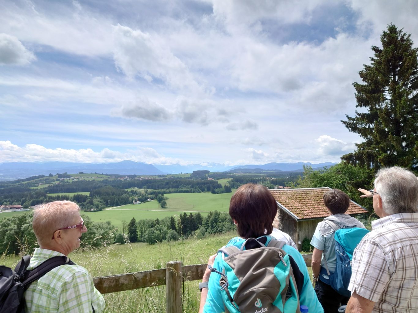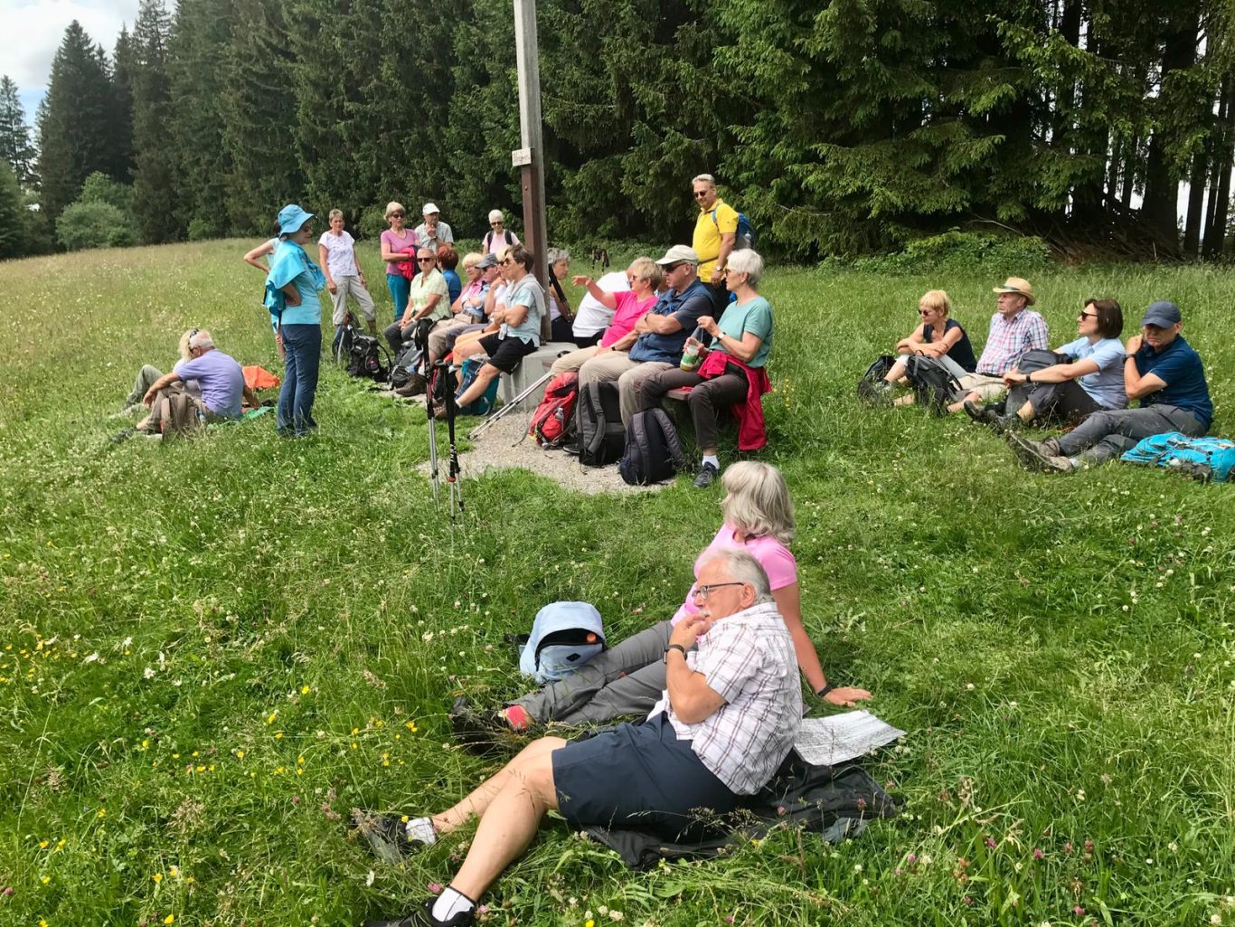 Weiter gings nun stetig leicht bergan, meist durch einen Wald, in Richtung Siedelalpe. Dort bog die Gruppe zum „Köpfle“ ab, mit 1024 m der höchste Punkt der Wanderung. Hier wurde eine längere Mittagspause eingelegt und die herrliche Aussicht über den Alpsee und die angrenzende Landschaft genossen. Anschließend wanderten die Spurwechsler immer bergab, zunächst entlang eines Panoramawegs und dann durch eine Kuhweide hindurch zur Alpe Schönesreuth, in der die Gruppe bei Kaffee und Kuchen, verbunden mit einer wunderschönen Aussicht, unter einer schattigen Eiche ebenfalls eine längere Pause einlegte.
