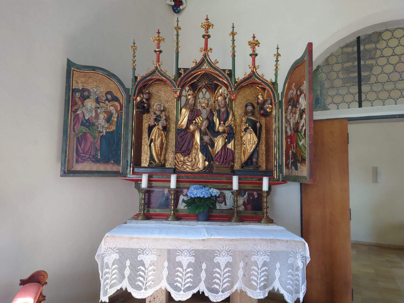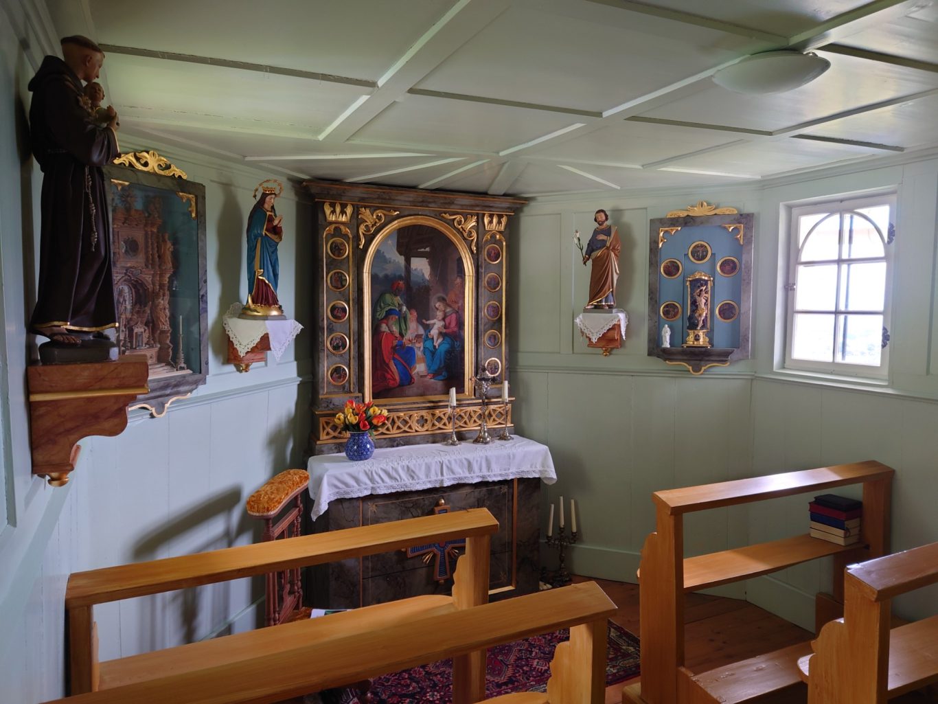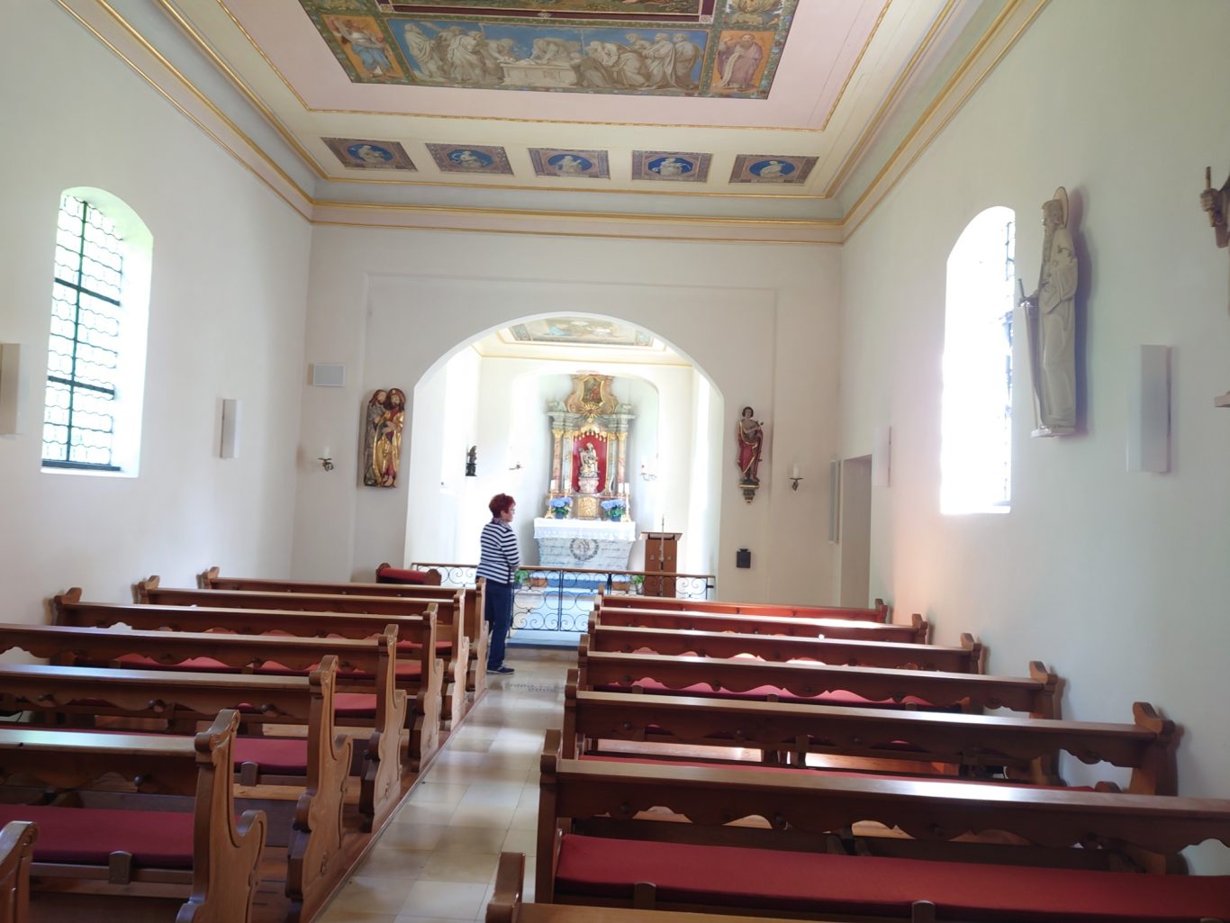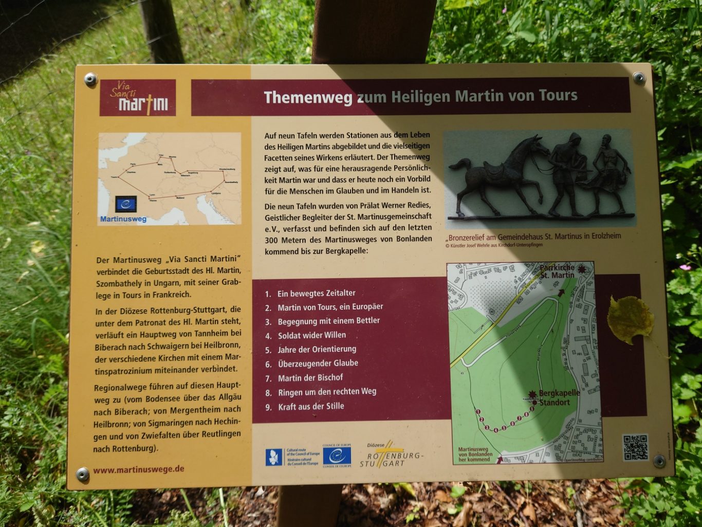 Am 25.5.2022 wanderte eine Gruppe von 15 Teilnehmern vom Kloster Bonlanden zur Bergkapelle auf dem Frohberg (630 m ü. NN). Am Ortsrand von Erolzheim beginnt der etwas steile Aufstieg zur Kapelle. Auf halber Höhe erreichten wir den angelegten Martiniweg mit vielen Info-Tafeln, welcher mit einem Gottesdienst in 2011 in der Bergkapelle von Bischof Gebhard Fürst eingeweiht wurde. Der Martiniweg (auch Martinusweg genannt) führt vom Geburtsort des Heiligen Martin (geb. 316, gest. 397) im ungarischen Szombathely zu seiner Grablege im französischen Tours. Mit etwa 1200 Streckenkilometern gehört der Martiniweg zu den längsten zusammenhängenden Pilger- und Wanderwegen in Deutschland.