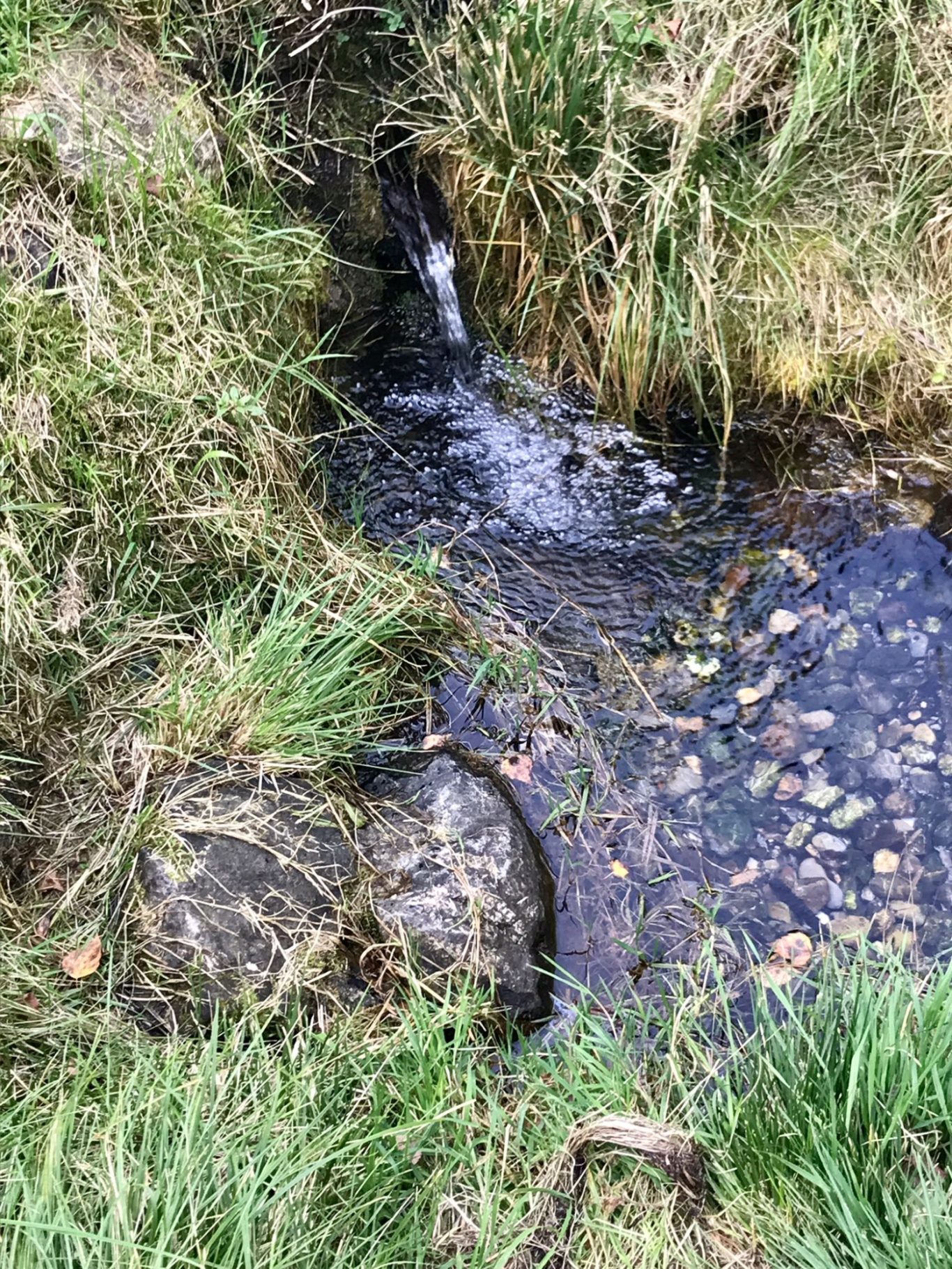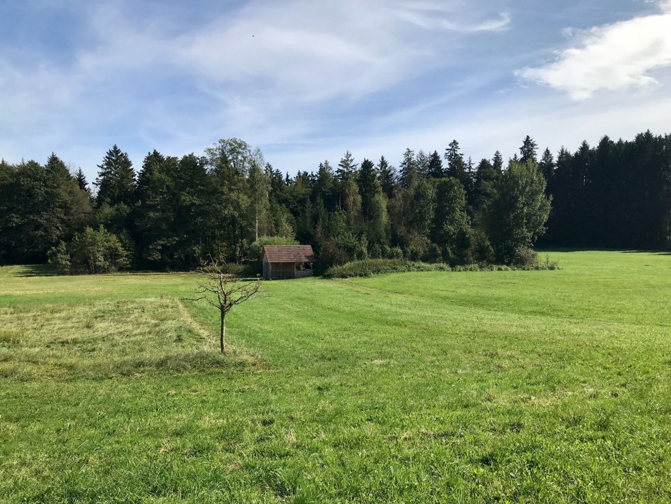 Rechts am Wald entlang und nach 100 m geht ein Feldweg durch das schöne Tal Richtung St. Annahof und wir sehen erst im letzten Moment diesen kleinen, schönen, wilden Weiher auf der rechten Seite. Wir hätten fast ein Bad genommen, wenn uns der grüne Schaumbelag auf der Oberfläche nicht gestört hätte.