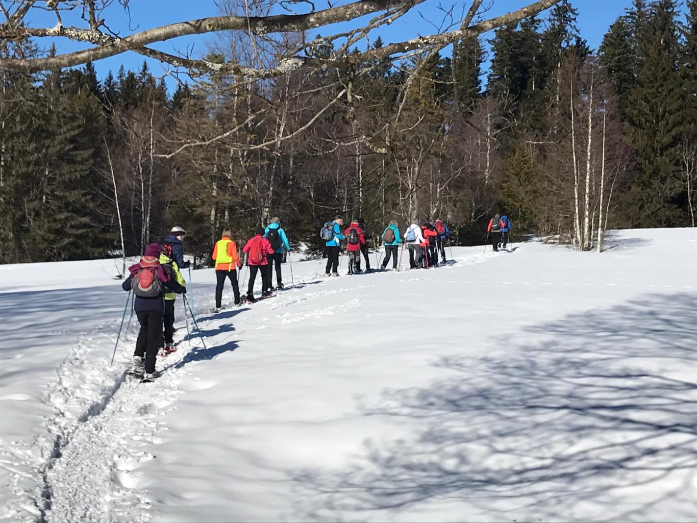 Bei frostigen Temperaturen machte sich eine Gruppe mit 14 TN auf den Weg ins Allgäu zum Schneeschuhlaufen am Eschacher Weiher. Die Sonne empfing uns bereits am Parkplatz. Da alle TN Anfänger waren, dauerte das Anlegen der Schuhschuhe geraume Zeit. Nach einer kurzen Einweisung machten sich alle mit ersten vorsichtigen Schritten auf den Weg. Unterwegs gab es immer wieder Hinweise und Tipps für sicheres und kräfteschonendes Gehen mit Schneeschuhen. Es ist faszinierend zu sehen, wie schnell alle mit mehr Sicherheit und Geschick in unterschiedlichen Schneequalitäten unterwegs sind und damit zurecht-kommen. Das herrliche Winterwetter mit strahlender Sonne begleitete uns den ganzen Tag. So konnten wir in aller Ruhe unsere Vesperpause, gemütlich auf Baumstämmen sitzend mit Blick auf die Allgäuer Berge, genießen. Den Rückweg legten wir schon zügiger zurück, indem zwei Männer die Spur vorlegten. Alle TN freuten sich über den gelungenen Start ins Schneeschuhlaufen und über die frohe Runde, die sich da getroffen hat. Zum Gelingen haben Christine und Uli tatkräftig mit beigetragen. Danke euch!