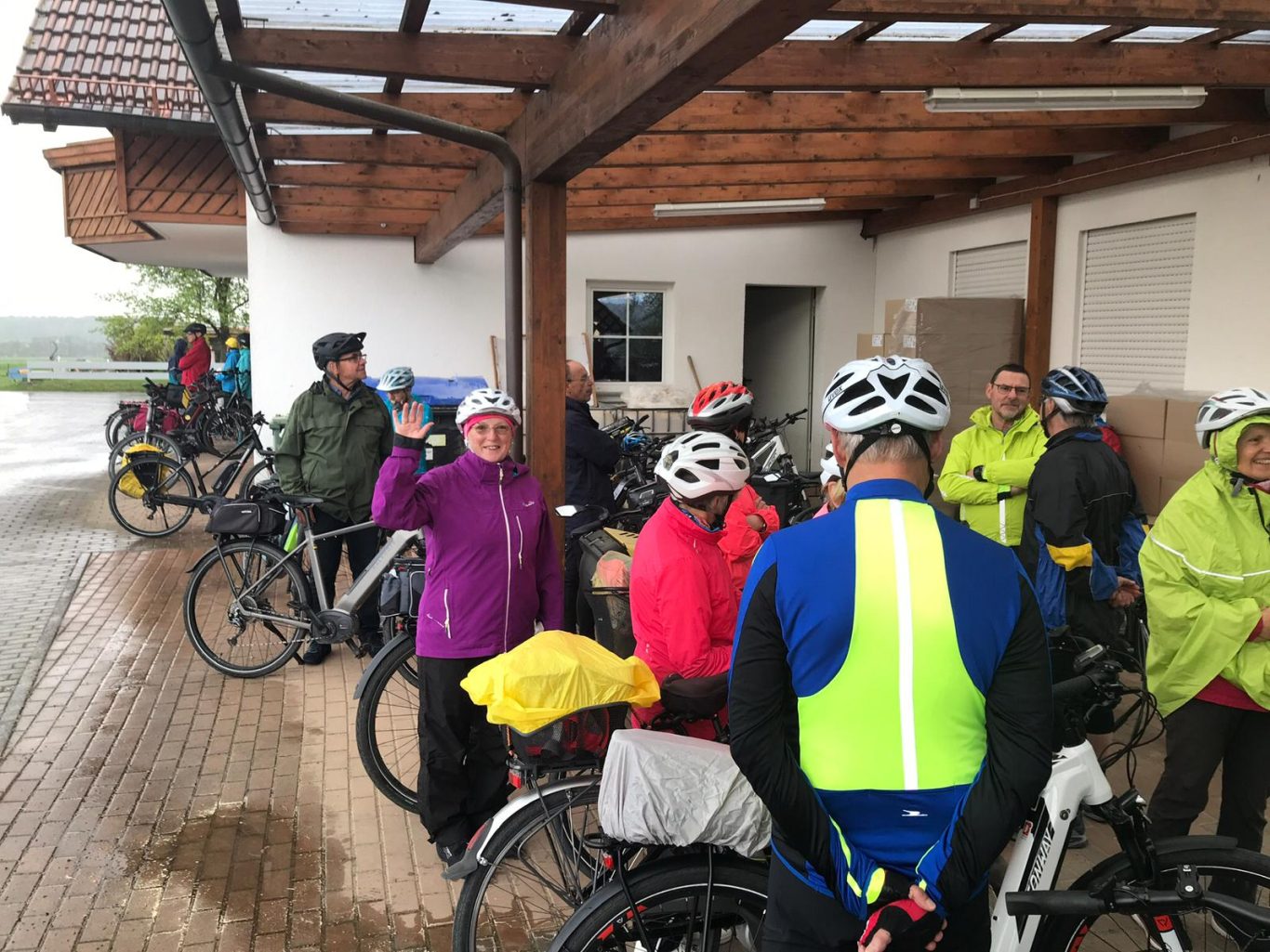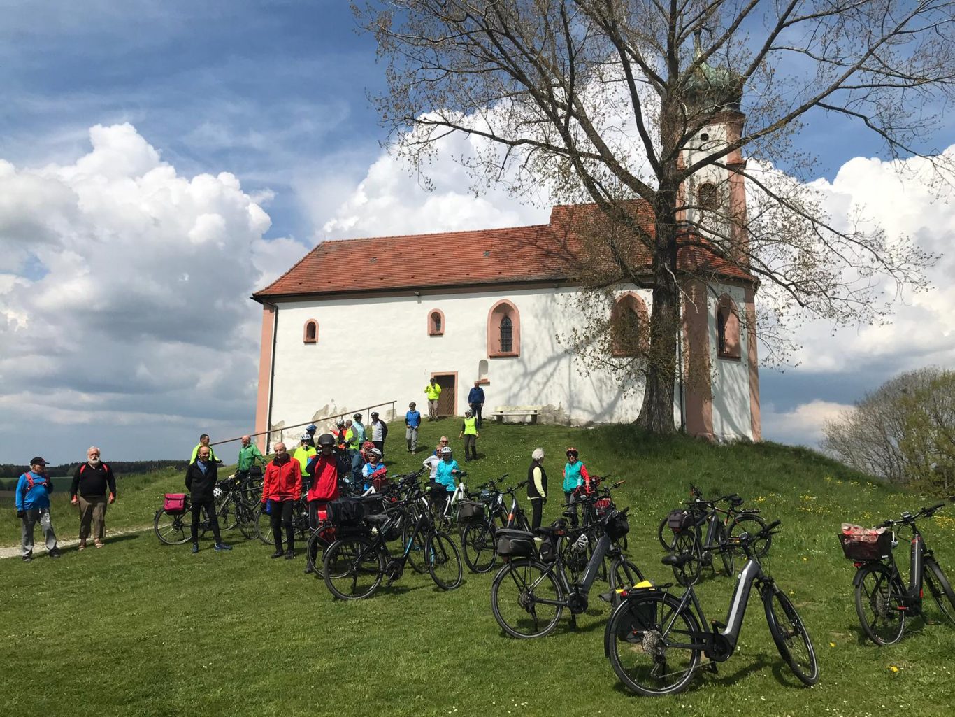 Mit einer Rundtour von Bad Waldsee nach Wolfegg wurde die diesjährige Radsaison eröffnet. Obwohl die Wetteraussichten etwas zweifelhaft waren, trafen sich 26 „Optimistinnen und Optimisten“ auf dem Parkplatz des Hymer-Museums (vielen Dank an die Firma Hymer!), um die Tour entlang des herrlich gelegenen Golfplatzes und vorbei an der 1889 von der Fürstin Sophie zu Waldburg-Wolfegg auf der Weltausstellung in Paris erworbenen Kapelle (Fürstin-Sophie-Kapelle) zu beginnen. Nachdem Bad Waldsee nur kurz tangiert worden war, radelte die Gruppe durch eine wunderschöne Allgäu-Landschaft über Arisheim und Ankenreute zur Kapelle St. Mauritius in Volkertshaus, die auf einem Moränenhügel liegt und schon von weitem sichtbar ist. Da der Besuch der Kapelle angekündigt war, war die Kapelle mit ihren mittelalterlichen Fresken offen und konnte von der Gruppe besichtigt werden, auch wurde das Ochsenhauser Friedensgebet gesprochen. Die Aussicht vom Kapellenhügel auf die umliegende Landschaft war beeindruckend! Danach fuhr die Gruppe weiter über Abetsweiler und Alttann nach Wolfegg, wo die Kaffee-Einkehr bei noch gutem Wetter im Garten des Cafés stattfinden konnte. Anschließend führte die Strecke bergab in Richtung Höll und Neutann (mit dem Alten- und Pflegeheim der Stiftung Liebenau) und anschließend gings steil bergauf nach Bergatreute. Der Blick am Ende des Aufstiegs reichte bis zum Kloster Reute und zum Bussen! Die Fahrt führte weiter über Bergatreute nach Gwigg. Da es nun zu regnen begann, wurde ein Unterstand gesucht und Gotteseidank auch schnell gefunden. Als der Regen etwas schwächer wurde, radelte die Gruppe eine Abkürzung nach Bad Waldsee zurück. Der Parkplatz wurde bei wieder gutem Wetter erreicht. Der zwischenzeitliche Regen tat der guten Stimmung der Teilnehmer keinen Abbruch!