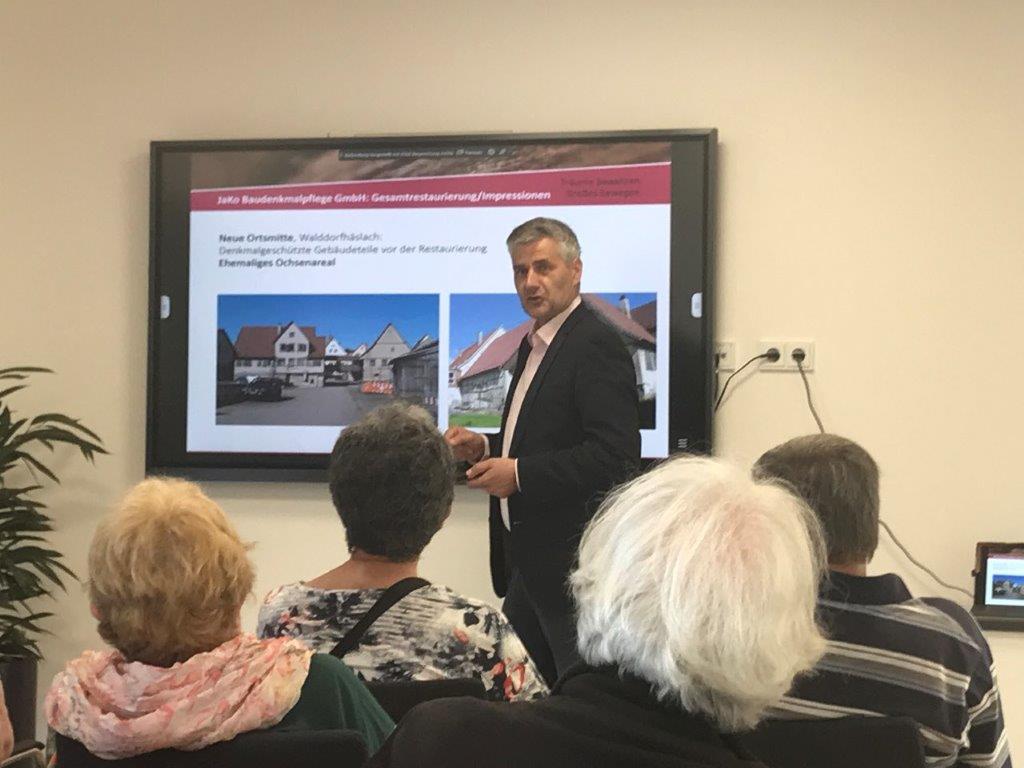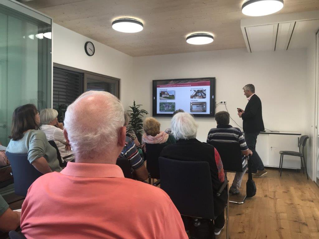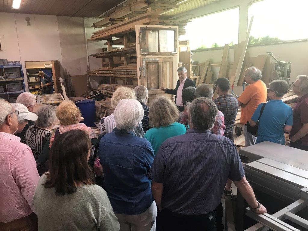 Herr Jäger, Chef und Mitgesellschafter der Jako- Baudenkmalpflege mit Sitz in Emishalden empfing am 17. Mai 2022 die interessierten Teilnehmer von Spurwechsel – junges Senioren Ochsenhausen zu einem hochinteressanten Betriebsrundgang!