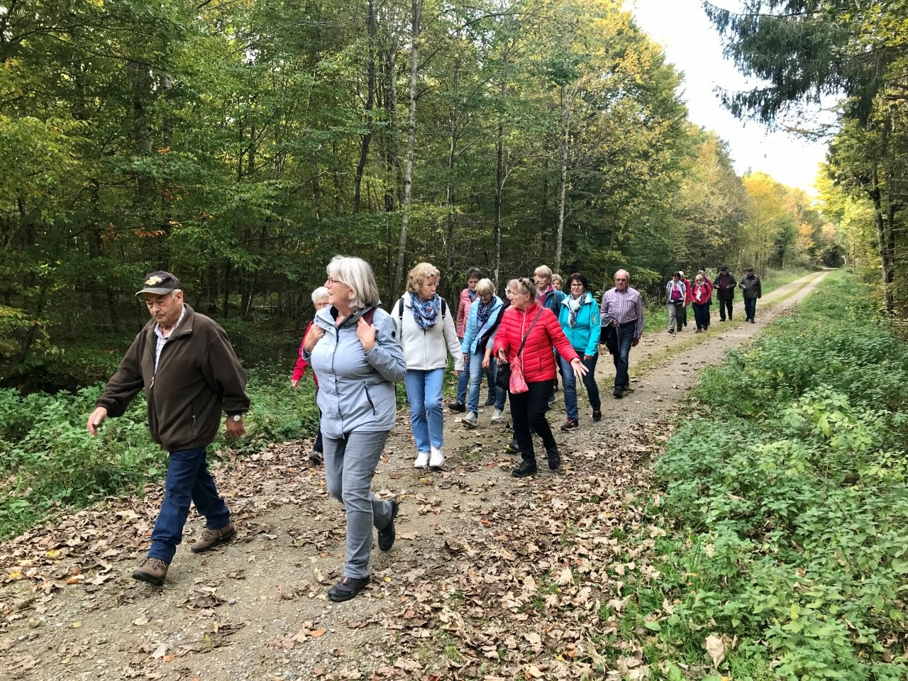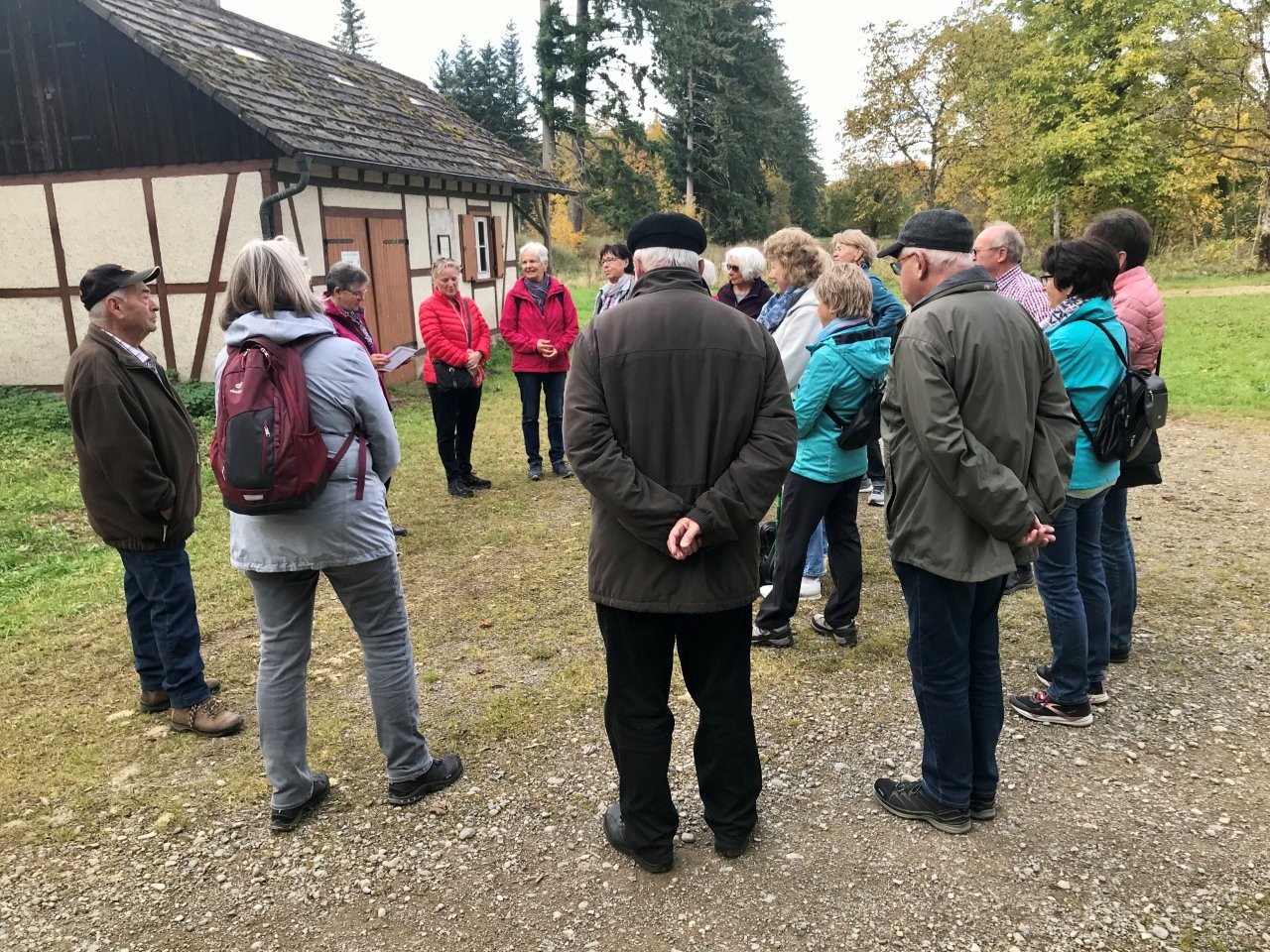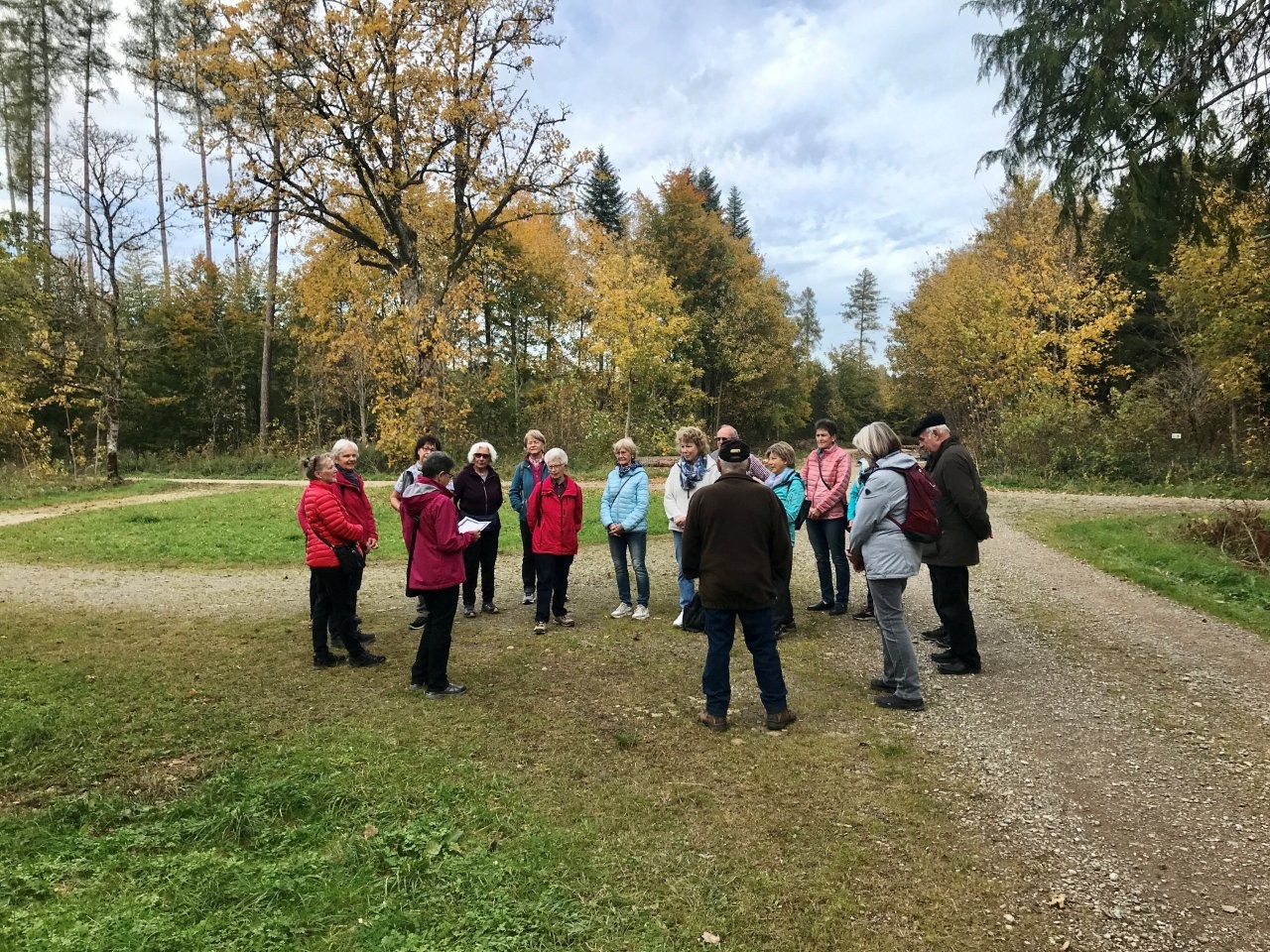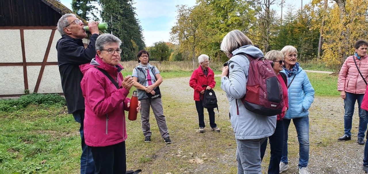 Bei schönem Herbstwetter trafen sich 19 Spurwechslerinnen und Spurwechsler am Sportheim, um eine Herbstwanderung im Fürstenwald zu unternehmen. Nach einem Hinweis auf den Hubschrauberbau im Fruchtkasten („Focke“, benannt nach dem Hubschrauberkonstrukteur Henrich Focke) gegen Ende des Zweiten Weltkrieges führte der Weg am Hofgut Holland vorbei zum „Franzosengrab“. Dort gab es einen kurzen geschichtlichen Hintergrund zur Entstehung des „Franzosengrabs“: Ein französischer Soldat namens Joseph Hahn, der in ein Ochsenhauser Mädchen verliebt war, wurde wegen „Fahnenflucht“ im August 1797 von den eigenen Kameraden erschossen. Diese tragische Geschichte wurde vor Jahren vom inzwischen verstorbenen Ochsenhauser Mundartdichter Wolfgang Schlecht auf schwäbisch geschrieben. Dieser Text wurde von Christine vorgelesen. Weiter gings zur Fürstenwaldhütte, an der das schwäbisch geschriebene Gedicht „Dr‘ Bomm“ (von August Mohn aus Daugendorf) ebenfalls von Christine vorgelesen wurde. Am Wendepunkt des Weges erinnerte Uli an den „Rottumer Rank“, an dem das „Rankenweible“ ihre Untaten verübt haben soll. Am ehemaligen Arboretum wurde kurz Halt gemacht, um in absoluter Stille eine Minute lang in den Wald hineinzuhören. Danach wanderte die Gruppe an den Kohlweihern vorbei und kurz vor dem Ziegelweiher zweigte der Weg in Richtung Hofgut Holland ab. Die ca. 6,8 km lange Wanderung fand ihren Abschluss mit der gemütlichen Einkehr im Café Schäfers.
