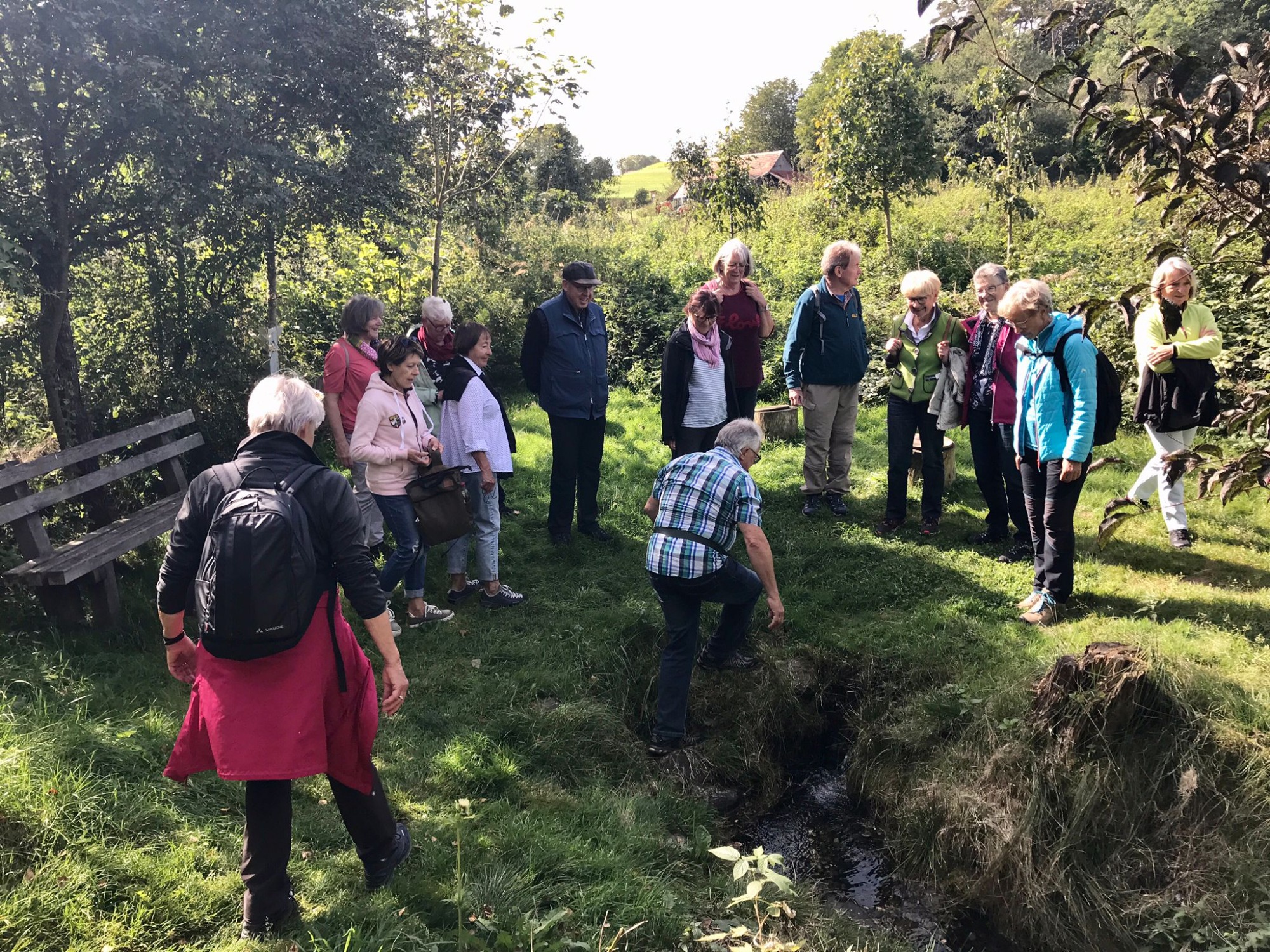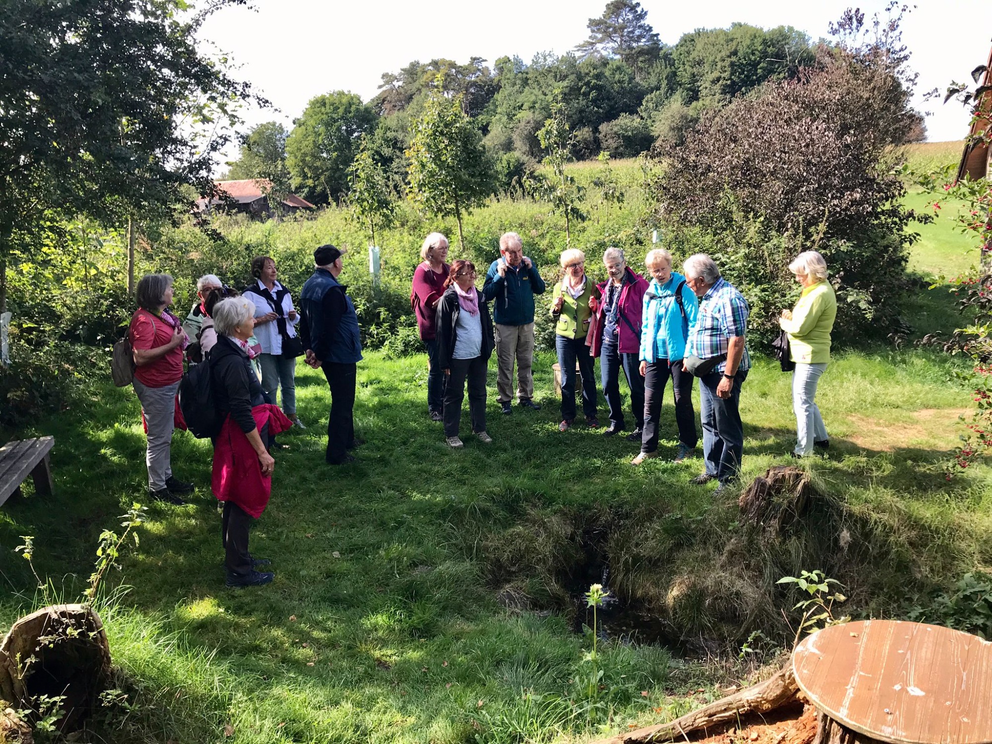 Am Mittwoch 22.09.21 trafen sich 15 Personen bei herrlichem Wetter in Michelwinnaden und wanderten zum Ursprung der Riß. Gleich zu Beginn staunten die Teilnehmenden über die große Kirche des kleinen Ortes (~ 650 Einw.). Noch überraschender war der Eindruck der „Burg“. Dieses mächtige Gebäude war einst Sommersitz und Fruchtschütte der Prämonstratenser des Klosters Schussenried. Später war es Rathaus und Schule. Heute sind hier die Ortsverwaltung und verschiedene Vereine untergebracht. Auch der schön angelegte Dorfweiher beeindruckte die Wanderer. Nach einer gemütlichen Wanderstrecke erreichten wir den fast versteckt liegenden Rißursprung: eine kleine Quelle in idyllischer Umgebung, die zu einer Ruhepause einlud. Eine aufwendig gestaltete Karte zeigt den Verlauf der Riß vom Ursprung bis zur Mündung in die Donau zwischen Rißtissen und Öpfingen. Den Wandertag ließen wir in der Besenwirtschaft „Mostbauer“ in froher Runde ausklingen.