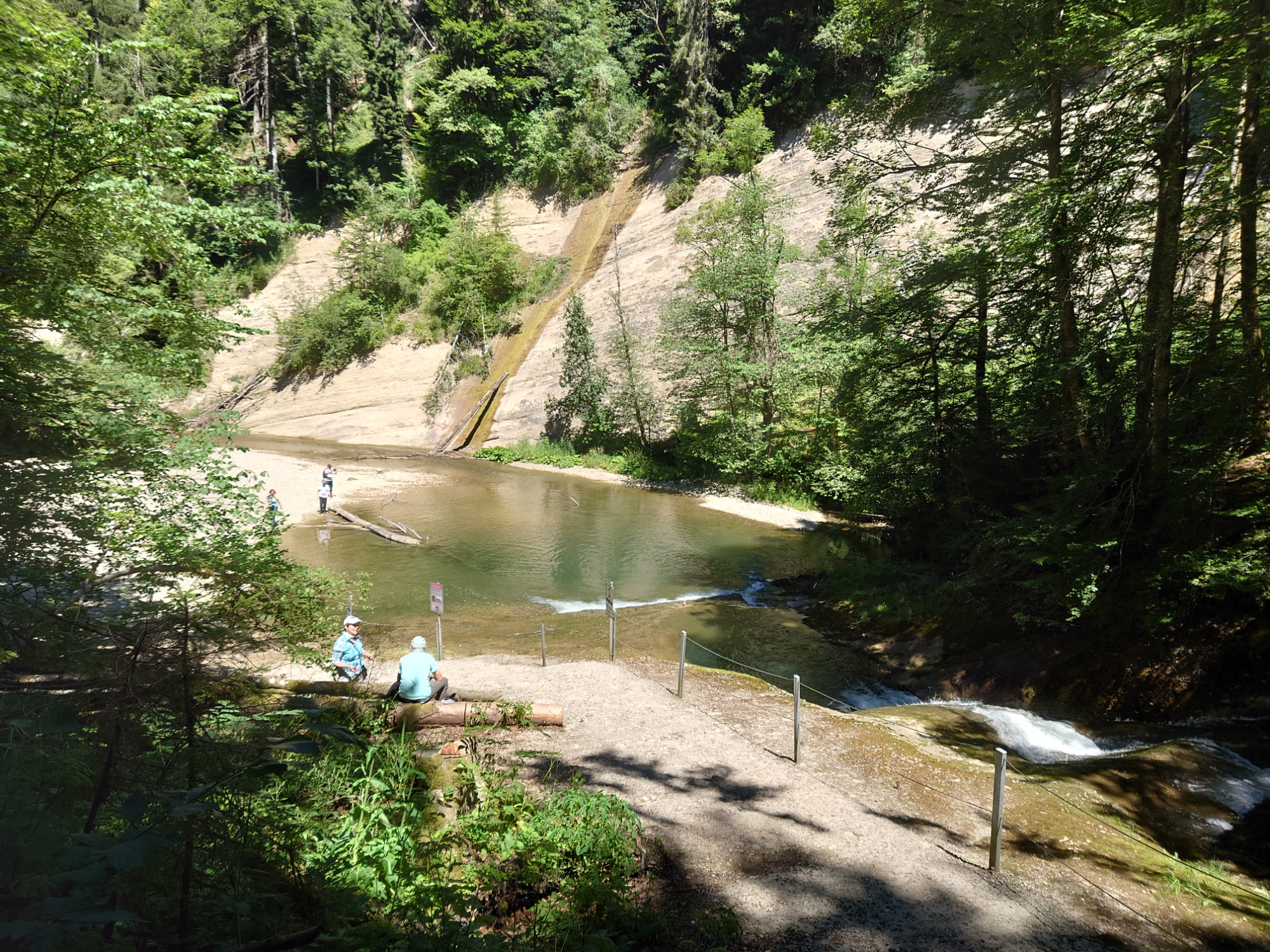 Rauschende Wasserfälle und tiefe Strudellöcher, riesige Gesteinsblöcke und gewaltige Felswände beeindruckten die Wanderer auf dem etwa 3,5 km langen Weg. Eingerahmt von bis zu 130 m hohen Felswänden stürzt das Wasser der oberen Argen über mehrere Geländestufen talwärts. Hubert Wiest erfreute uns bei der Vesperpause mit seinen Albhornweisen, die auch im Tobel herrlich erklangen und mancher kühlte seine heißgelaufenen Füße im kühlen Wasser der Argen.