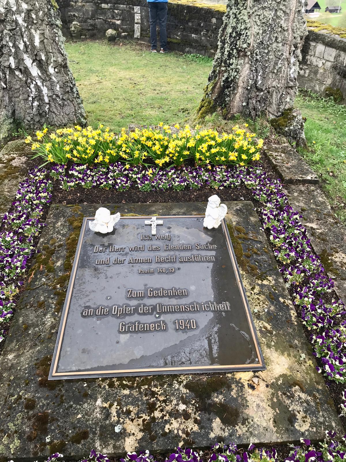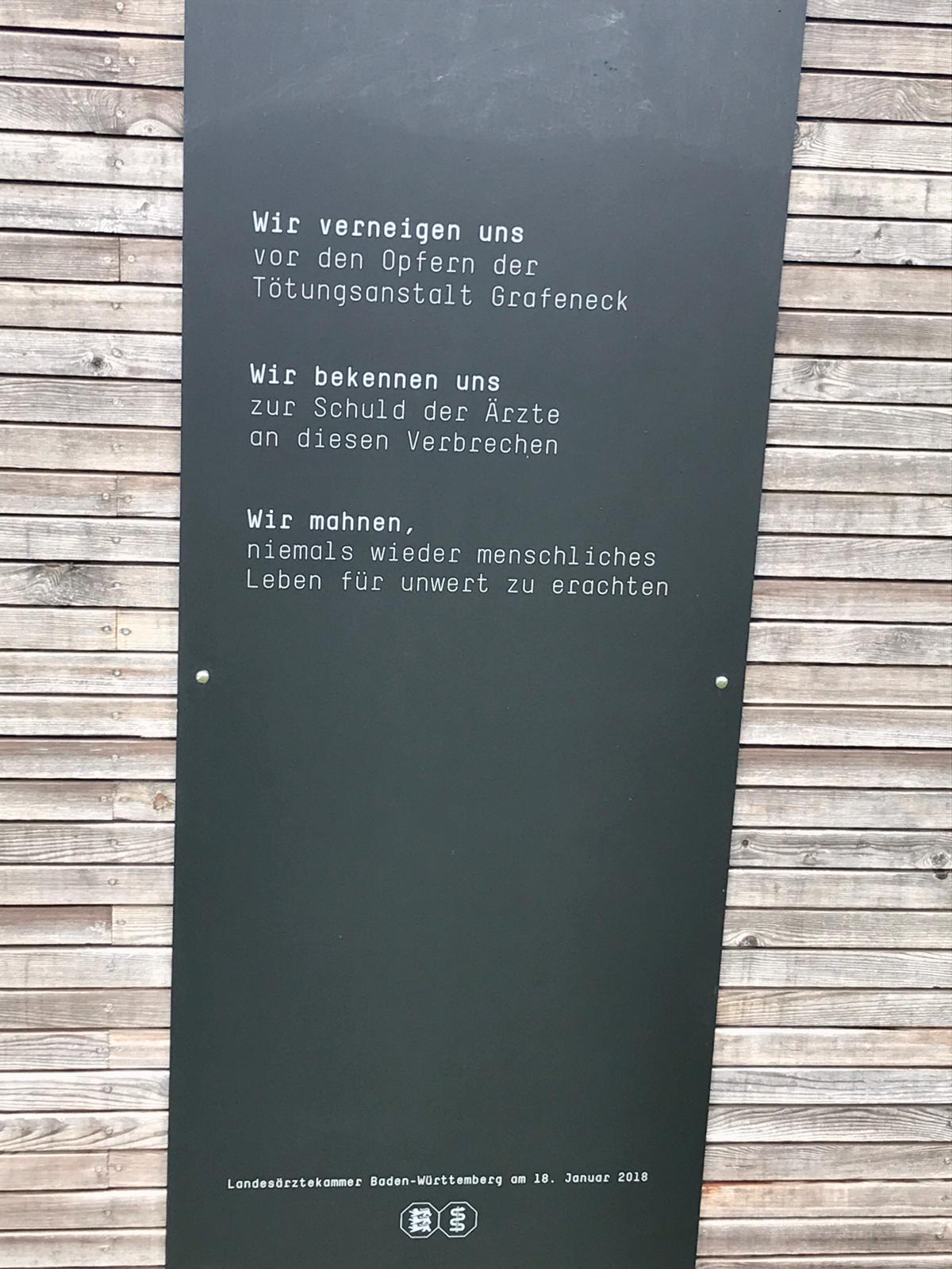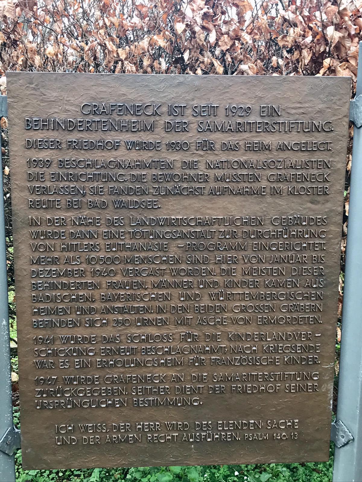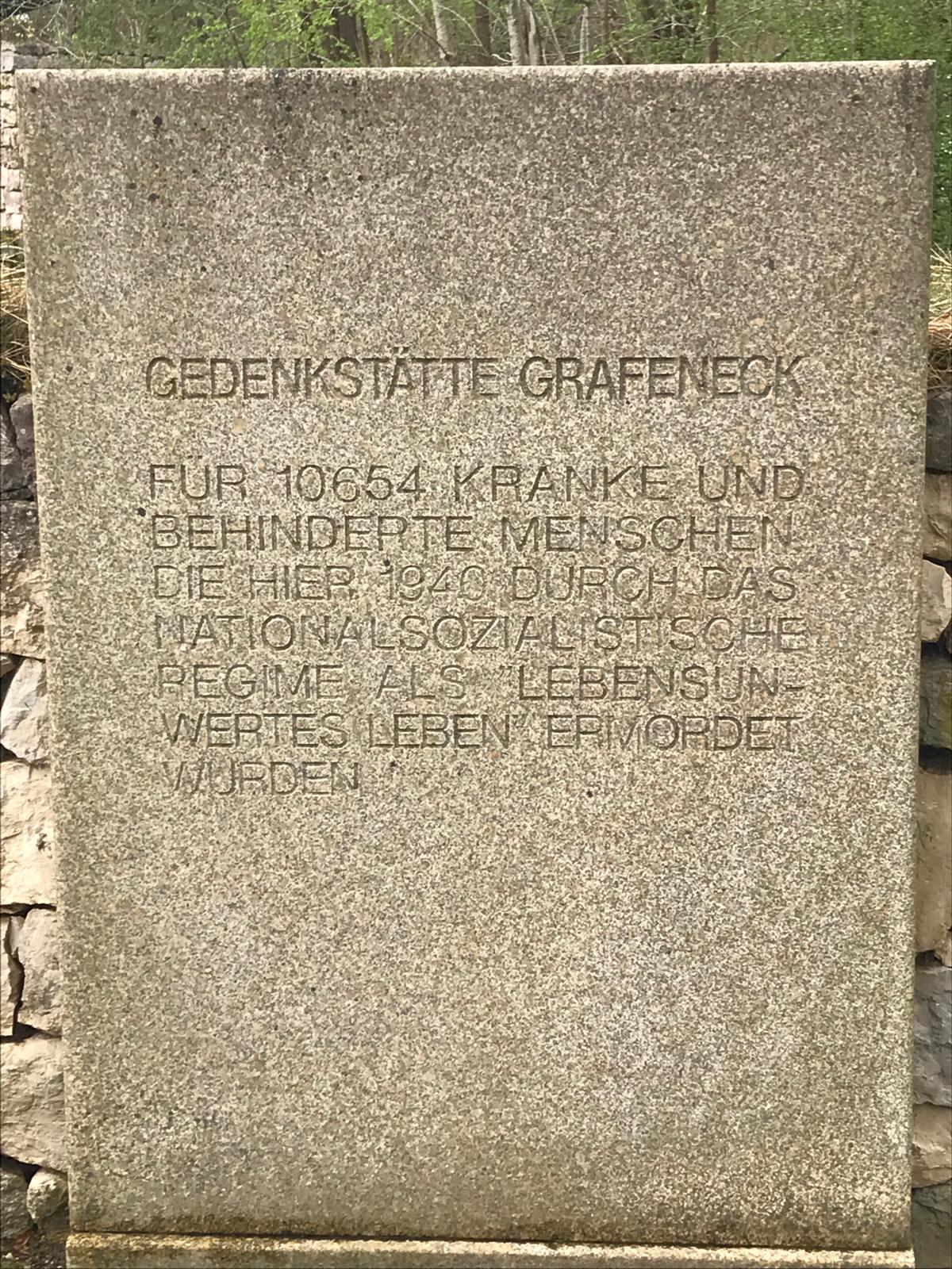 Die Nazis haben im Laufe des Jahres 1940 in einer umgebauten Scheune 10 654 behinderte oder depressive Menschen, Frauen, Männer und Kinder vergast und anschließend verbrannt. Aus betreuten Einrichtungen aus Baden-Württemberg, Bayern und Hessen wurden die Opfer in Bussen nach Grafeneck gebracht und dort noch am selben Tag getötet. Die Angehörigen erhielten einige Wochen später eine Todesnachricht mit einer erfundenen Todesursache.