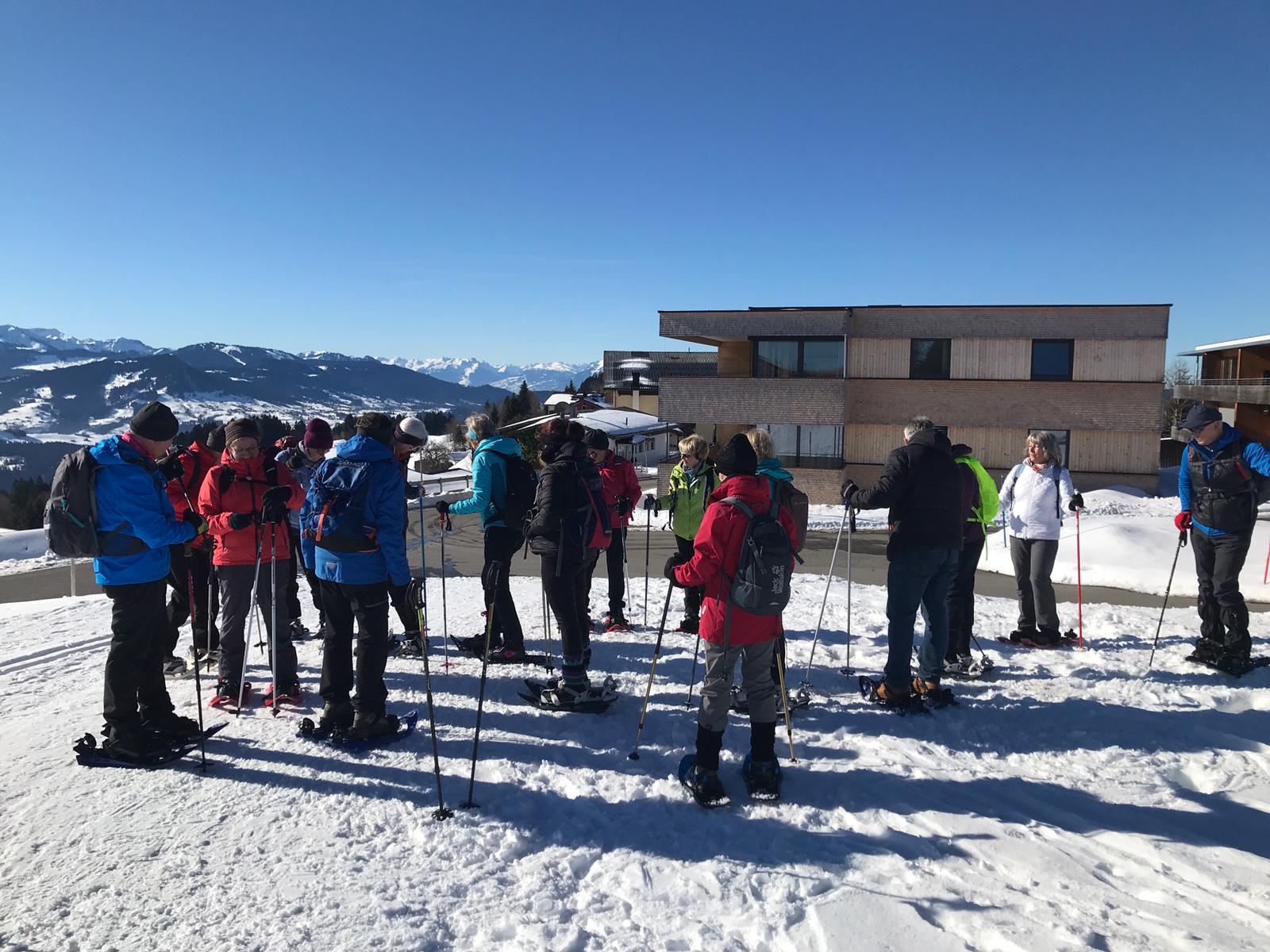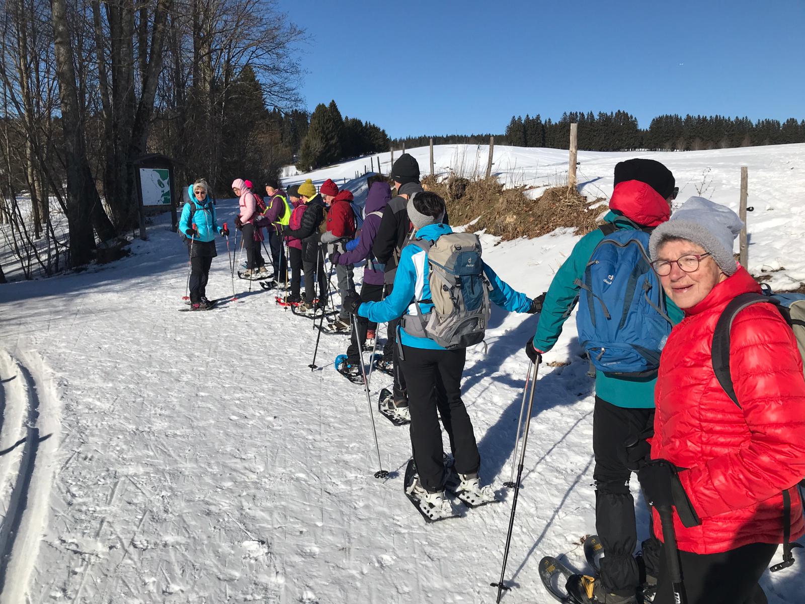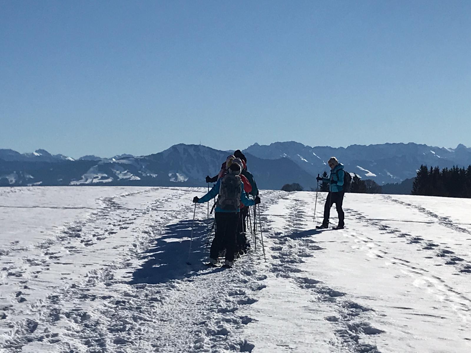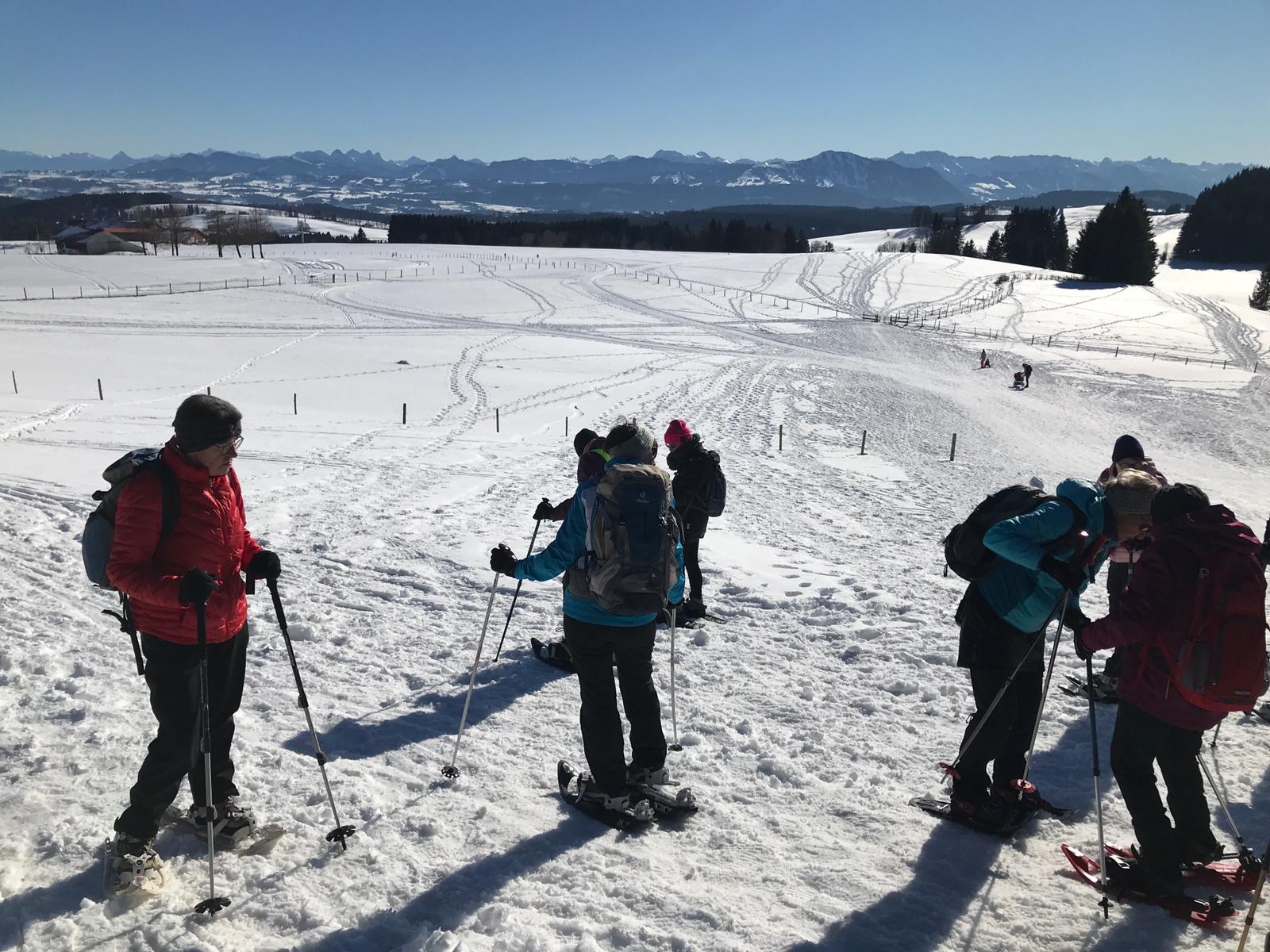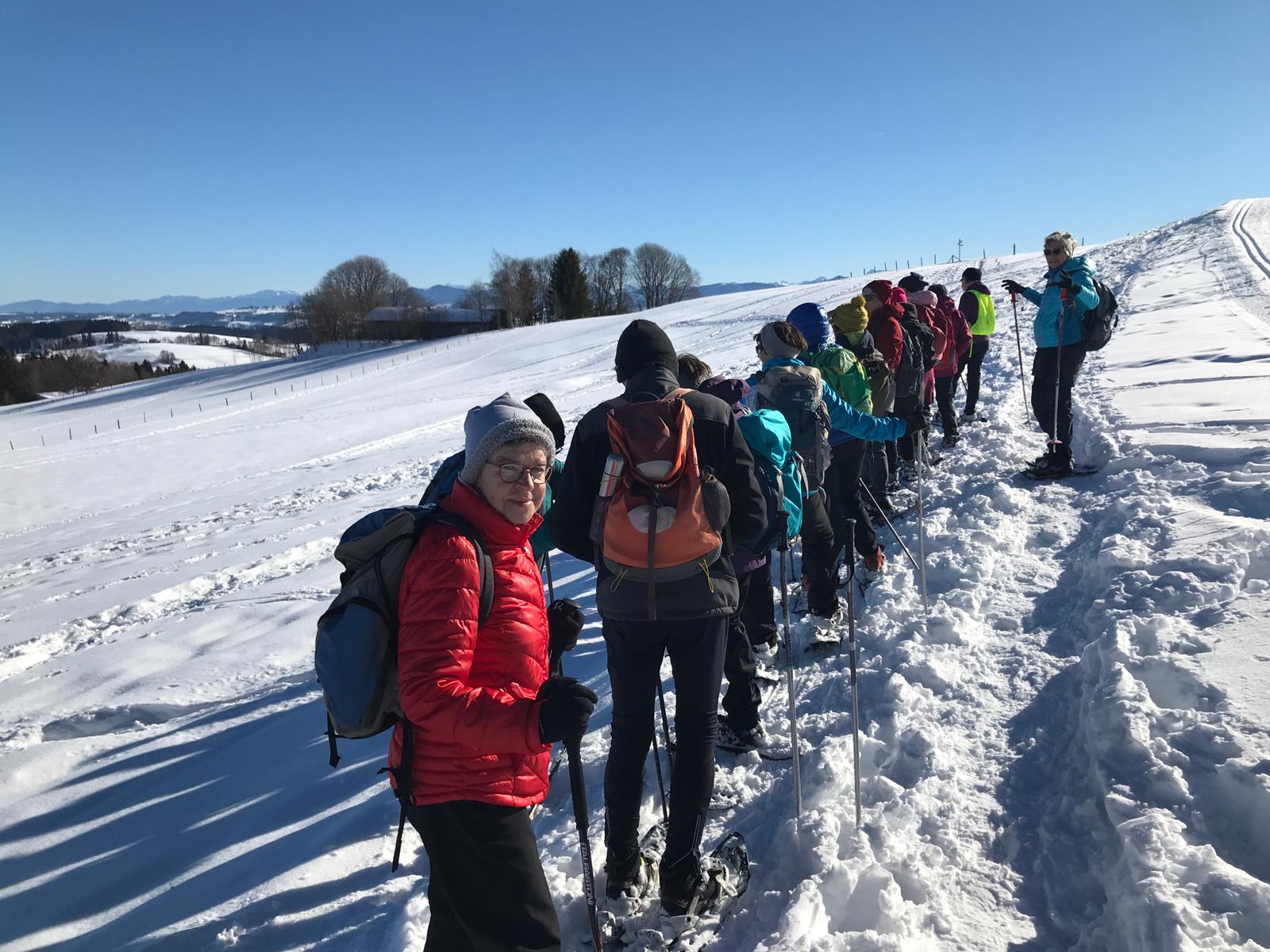 Am Mi 09.02.22 trafen sich trotz vorverlegtem Abfahrtstermin 16 schneeschuh-begeisterte TN am Sportheim. Bereits um 9 Uhr schien die Sonne! Die Fahrt nach Sulzberg verlief ohne Probleme. Schon beim Aussteigen sahen wir die mächtige Bergkette der Nagelfluh und die Berge des Bregenzer Waldes vor strahlend blauem Himmel. Am Startpunkt angekommen halfen die erfahrenen Schneeschuhgeher den weniger Geübten beim Anlegen der Schneeschuhe und bald machten wir uns in der verschneiten Landschaft auf den Weg. Manchmal konnten wir vorhandene Spuren nutzen und sonst gingen versierte Spurwechsler voran! Bald mussten wir Jacken, Pullover, … ablegen, da die Sonne uns angenehm wärmte. Die Tour verlief auch durch ein Naturschutzgebiet, das Wildrosenmoos, das wir im Gänsemarsch durchquerten, um die Landschaft zu schonen. Zur Mittagszeit erreichten wir das ehemalige Grenzerhäuschen zwischen Oberreute und Sulzberg. Nach einer ausgiebigen Vesperpause in froher Runde machten wir uns auf den Rückweg. Dieser verlief nach Westen über offenes Gelände, sodass wir der Sonne entgegen wanderten und immer die verschneiten Berggipfel vor uns sahen. Die Freude über dieses Geschenk der Natur spiegelte sich in den strahlenden Gesichtern der TN. Ein herrlicher Wintertag, den wir in heiterer Stimmung zusammen genießen durften!