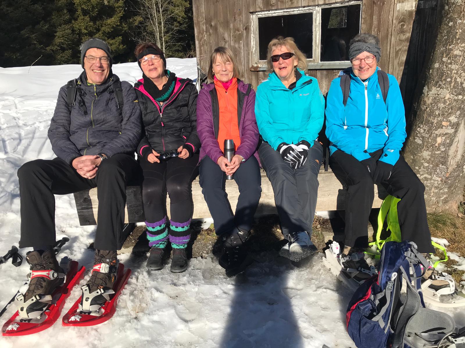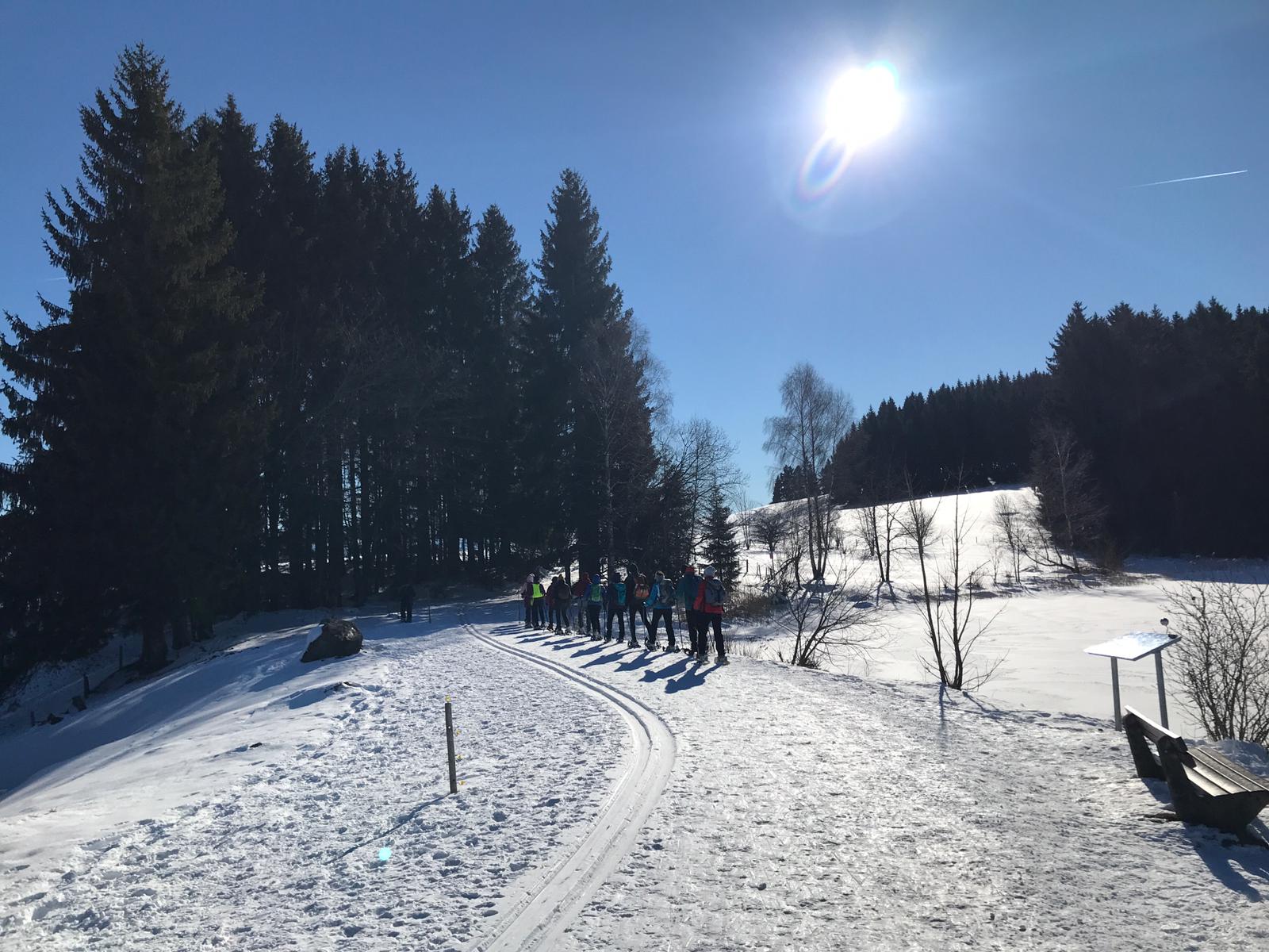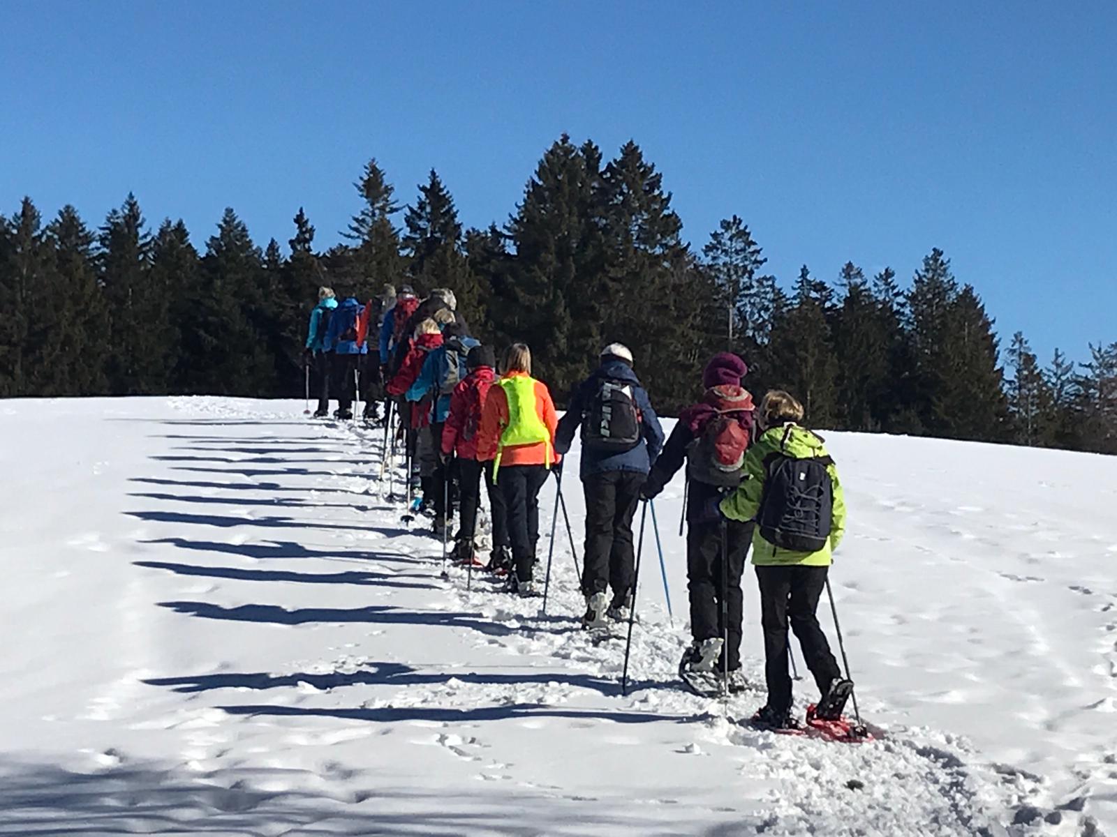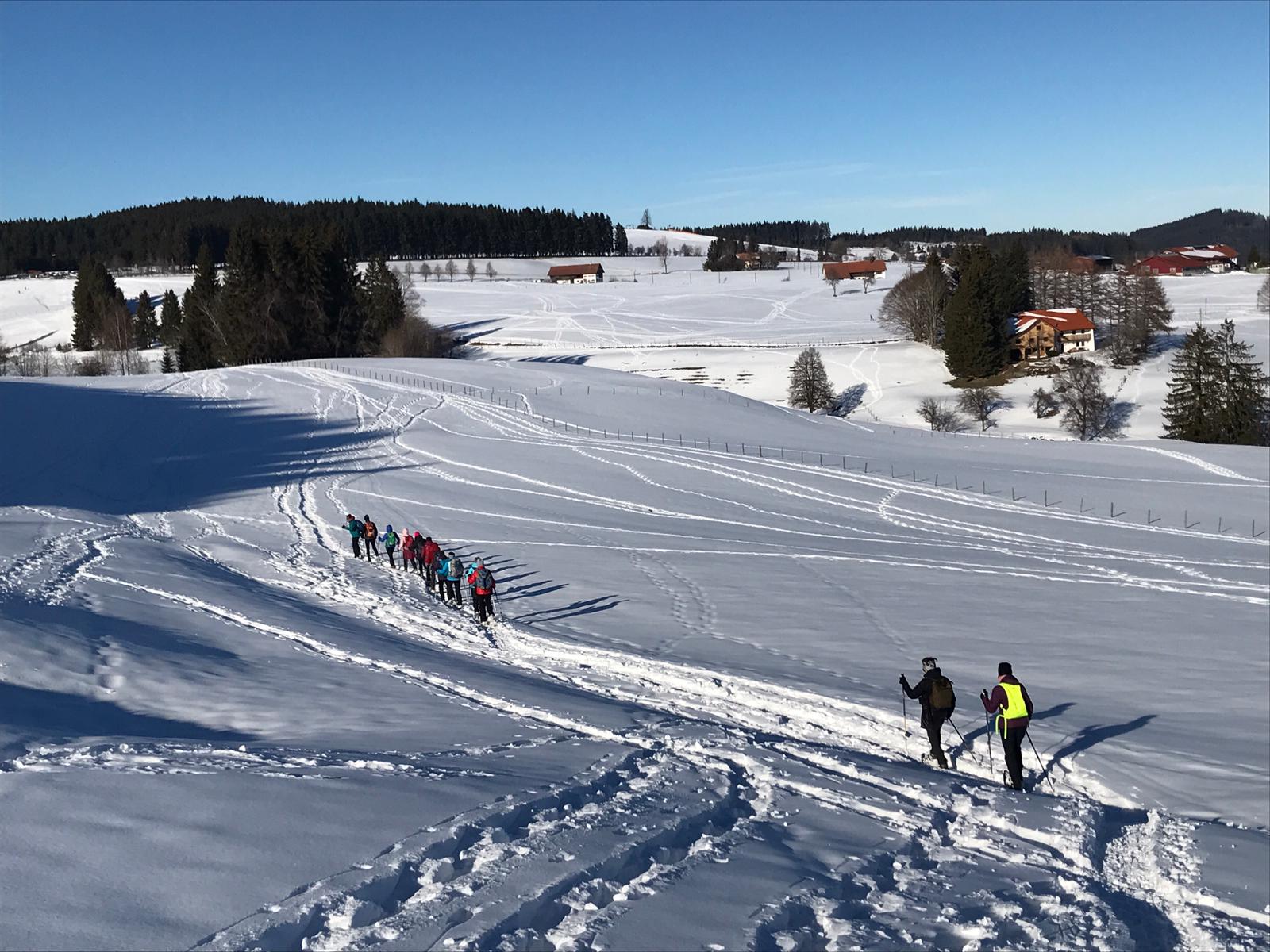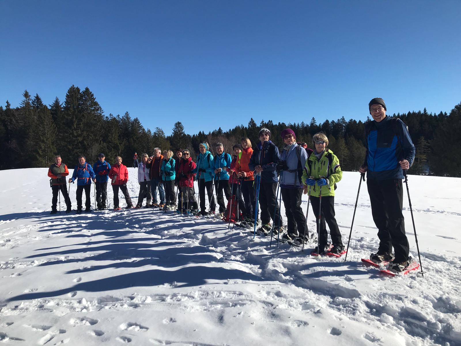 Am Mi 09.02.22 trafen sich trotz vorverlegtem Abfahrtstermin 16 schneeschuh-begeisterte TN am Sportheim. Bereits um 9 Uhr schien die Sonne! Die Fahrt nach Sulzberg verlief ohne Probleme. Schon beim Aussteigen sahen wir die mächtige Bergkette der Nagelfluh und die Berge des Bregenzer Waldes vor strahlend blauem Himmel. Am Startpunkt angekommen halfen die erfahrenen Schneeschuhgeher den weniger Geübten beim Anlegen der Schneeschuhe und bald machten wir uns in der verschneiten Landschaft auf den Weg. Manchmal konnten wir vorhandene Spuren nutzen und sonst gingen versierte Spurwechsler voran! Bald mussten wir Jacken, Pullover, … ablegen, da die Sonne uns angenehm wärmte. Die Tour verlief auch durch ein Naturschutzgebiet, das Wildrosenmoos, das wir im Gänsemarsch durchquerten, um die Landschaft zu schonen. Zur Mittagszeit erreichten wir das ehemalige Grenzerhäuschen zwischen Oberreute und Sulzberg. Nach einer ausgiebigen Vesperpause in froher Runde machten wir uns auf den Rückweg. Dieser verlief nach Westen über offenes Gelände, sodass wir der Sonne entgegen wanderten und immer die verschneiten Berggipfel vor uns sahen. Die Freude über dieses Geschenk der Natur spiegelte sich in den strahlenden Gesichtern der TN. Ein herrlicher Wintertag, den wir in heiterer Stimmung zusammen genießen durften!