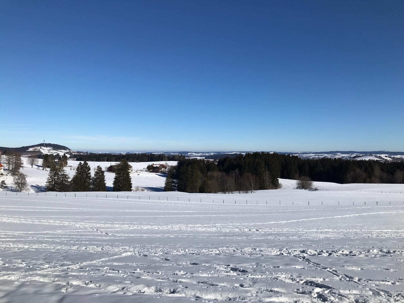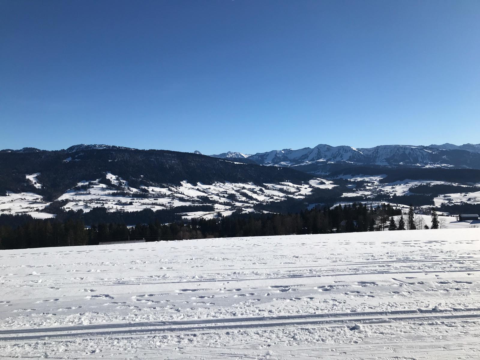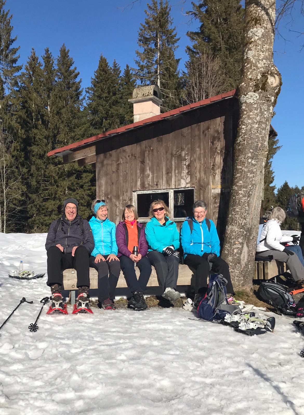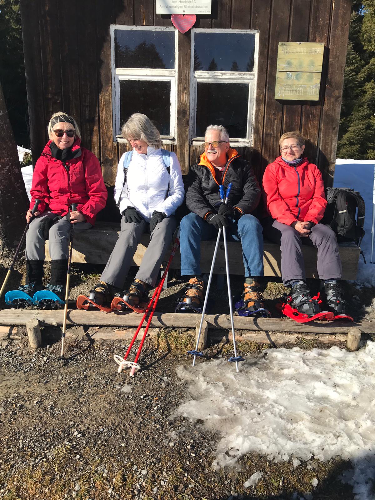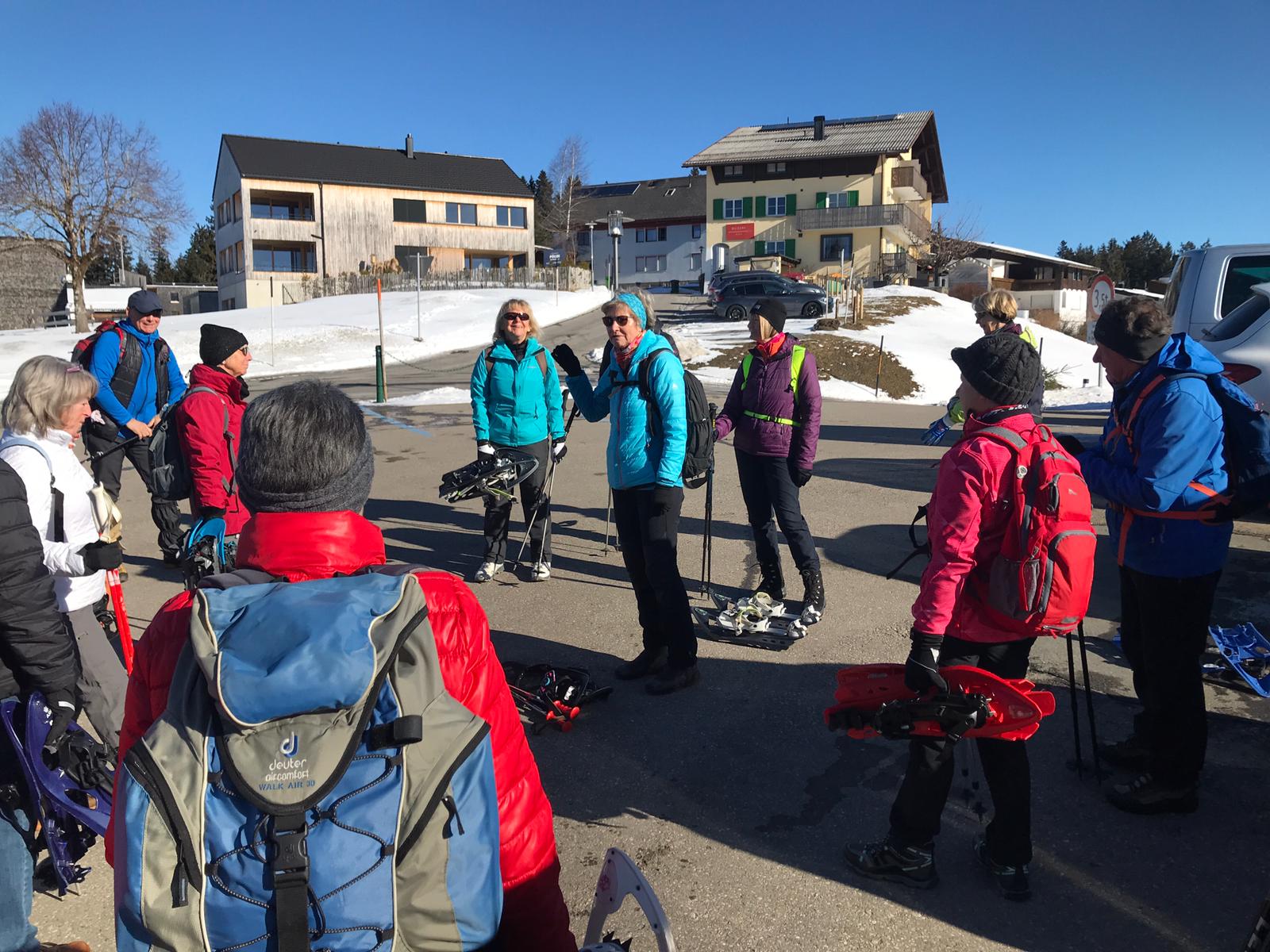 Am Mi 09.02.22 trafen sich trotz vorverlegtem Abfahrtstermin 16 schneeschuh-begeisterte TN am Sportheim. Bereits um 9 Uhr schien die Sonne! Die Fahrt nach Sulzberg verlief ohne Probleme. Schon beim Aussteigen sahen wir die mächtige Bergkette der Nagelfluh und die Berge des Bregenzer Waldes vor strahlend blauem Himmel. Am Startpunkt angekommen halfen die erfahrenen Schneeschuhgeher den weniger Geübten beim Anlegen der Schneeschuhe und bald machten wir uns in der verschneiten Landschaft auf den Weg. Manchmal konnten wir vorhandene Spuren nutzen und sonst gingen versierte Spurwechsler voran! Bald mussten wir Jacken, Pullover, … ablegen, da die Sonne uns angenehm wärmte. Die Tour verlief auch durch ein Naturschutzgebiet, das Wildrosenmoos, das wir im Gänsemarsch durchquerten, um die Landschaft zu schonen. Zur Mittagszeit erreichten wir das ehemalige Grenzerhäuschen zwischen Oberreute und Sulzberg. Nach einer ausgiebigen Vesperpause in froher Runde machten wir uns auf den Rückweg. Dieser verlief nach Westen über offenes Gelände, sodass wir der Sonne entgegen wanderten und immer die verschneiten Berggipfel vor uns sahen. Die Freude über dieses Geschenk der Natur spiegelte sich in den strahlenden Gesichtern der TN. Ein herrlicher Wintertag, den wir in heiterer Stimmung zusammen genießen durften!
