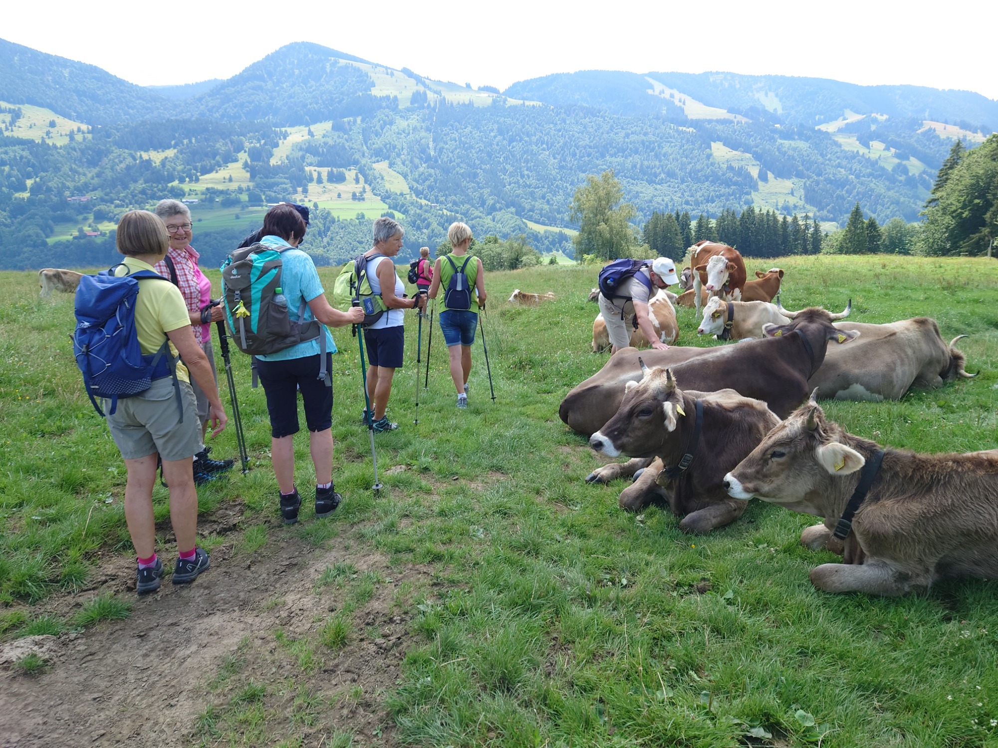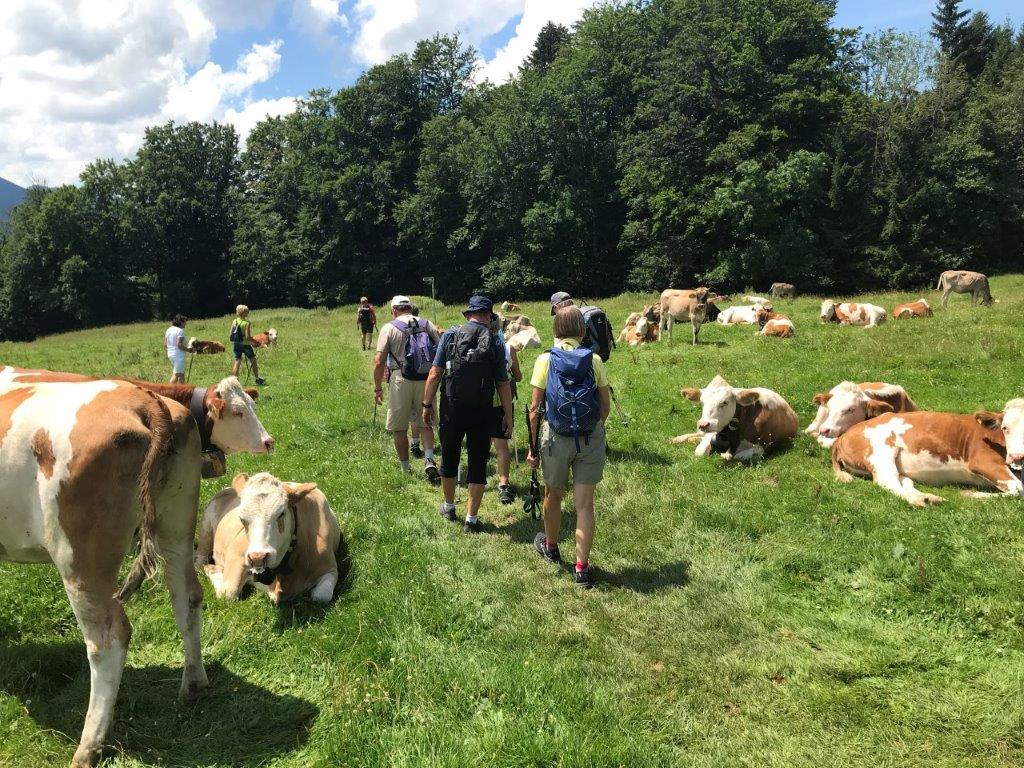 Der erste Anstieg, voll in der Sonne, trieb manchem den Schweiß ins Gesicht. Aber bald kam Schatten und man wanderte flach über das Hühnermoos (eine kleine Moorwiese) erholte sich einigermaßen, bevor man den Hauptanstieg teils über Stufen, fast senkrecht hinauf zum Sonnenkopf-Kamm bewältigte. Dort erwartete uns eine Herde prächtiger Allgäuer Kühe mit Hörnern, die eifrig damit beschäftigt waren, mit ihren Ohren die vielen lästigen Mücken zu vertreiben.