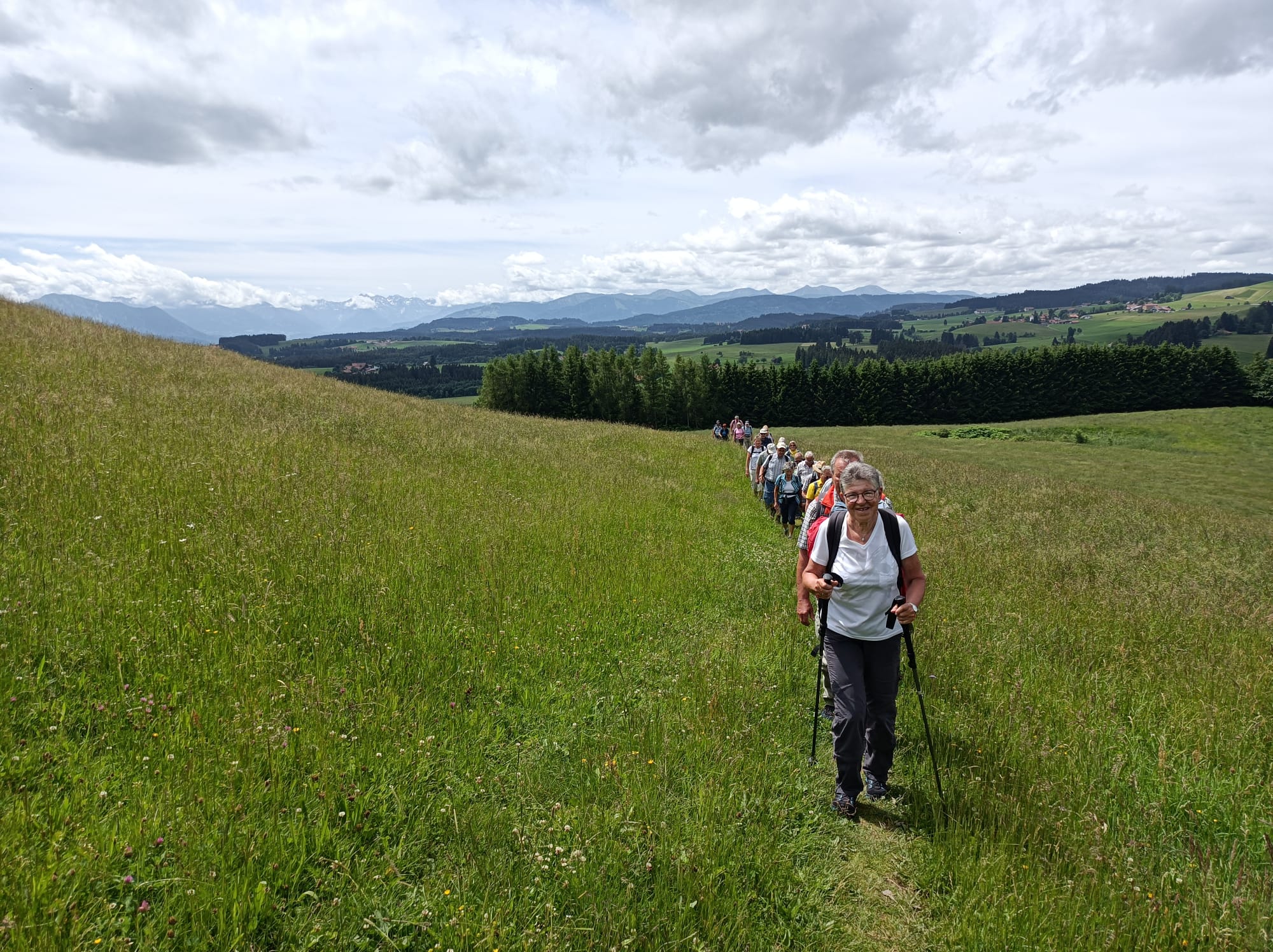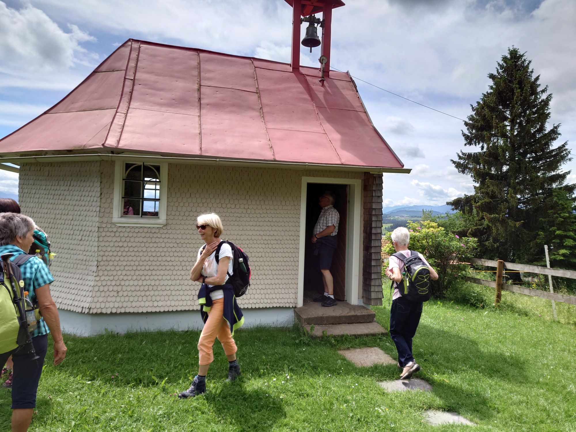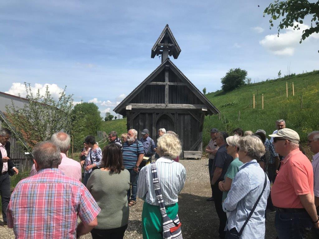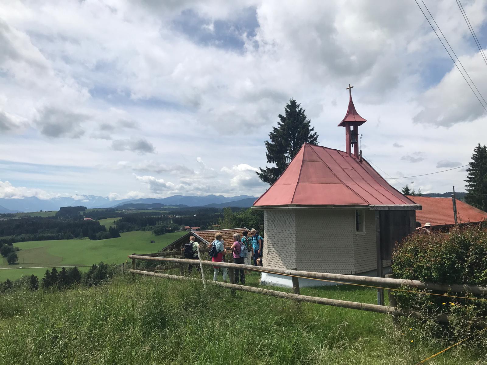 Die Wettervorhersage war gut für Mittwoch, 08.06.2022. Da bei der Ankunft bereits die Sonne schien, machten sich 31 wanderbegeisterte „Spurwechsler“ gut gelaunt auf den Weg. Schon der Parkplatz liegt auf einer aussichtsreichen Anhöhe bei Wiggensbach. In gemächlichem Tempo ging es zunächst sanft ansteigend in Richtung Blender. Die Aussicht auf die Bergkette öffnete sich immer mehr, obwohl die weiter entfernten Gipfel immer wieder in Wolken verhüllt waren. Eine am Weg liegende Kapelle zog unsere Aufmerksamkeit auf sich. Vom Türmchen der Kapelle führte ein dünnes Drahtseil hinüber zu einem Hof bis zum Schlafzimmerfenster. Von dort aus wird zum Angelusgebet geläutet (s.Foto). Auf unserer weiteren Wanderstrecke hörten wir um 12 Uhr das Mittagsläuten. Auf dem Rauenstein -einem Naturschutzgebiet- gingen wir im Gänsemarsch durch blühende Wiesen. Am Blender angekommen hielten wir gemütlich Mittagsrast im „Schatten“ eines mächtigen Sendeturms. Es war recht warm geworden und manche legten sich voll Übermut in die Blumenwiese. Auf dem Rückweg waren die Berggipfel deutlicher zu sehen und wir konnten diese von der Zugspitze bis zum Hochgrat bestaunen. Eifrig plaudernd wanderten wir weiter in Richtung Parkplatz. Im hübschen Glasmacherdorf Schmidsfelden kehrten wir im Burgcafe ein. Die Schattenplätze unter den Bäumen waren begehrt. Die Kunsthandwerker und der Glasbläser hatten ihre Werkstätten und Läden geöffnet und luden zu einem Besuch ein. So ging ein angenehmer Wandertag zu Ende. Die Fotos haben die frohe Stimmung gut eingefangen. Dank an die Fotografen! Vielen Dank auch an Christine und Uli Mebus für die Unterstützung bei der Organisation.
