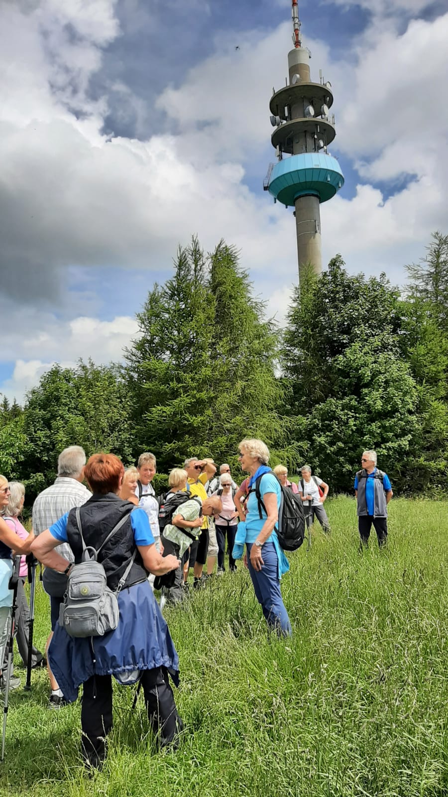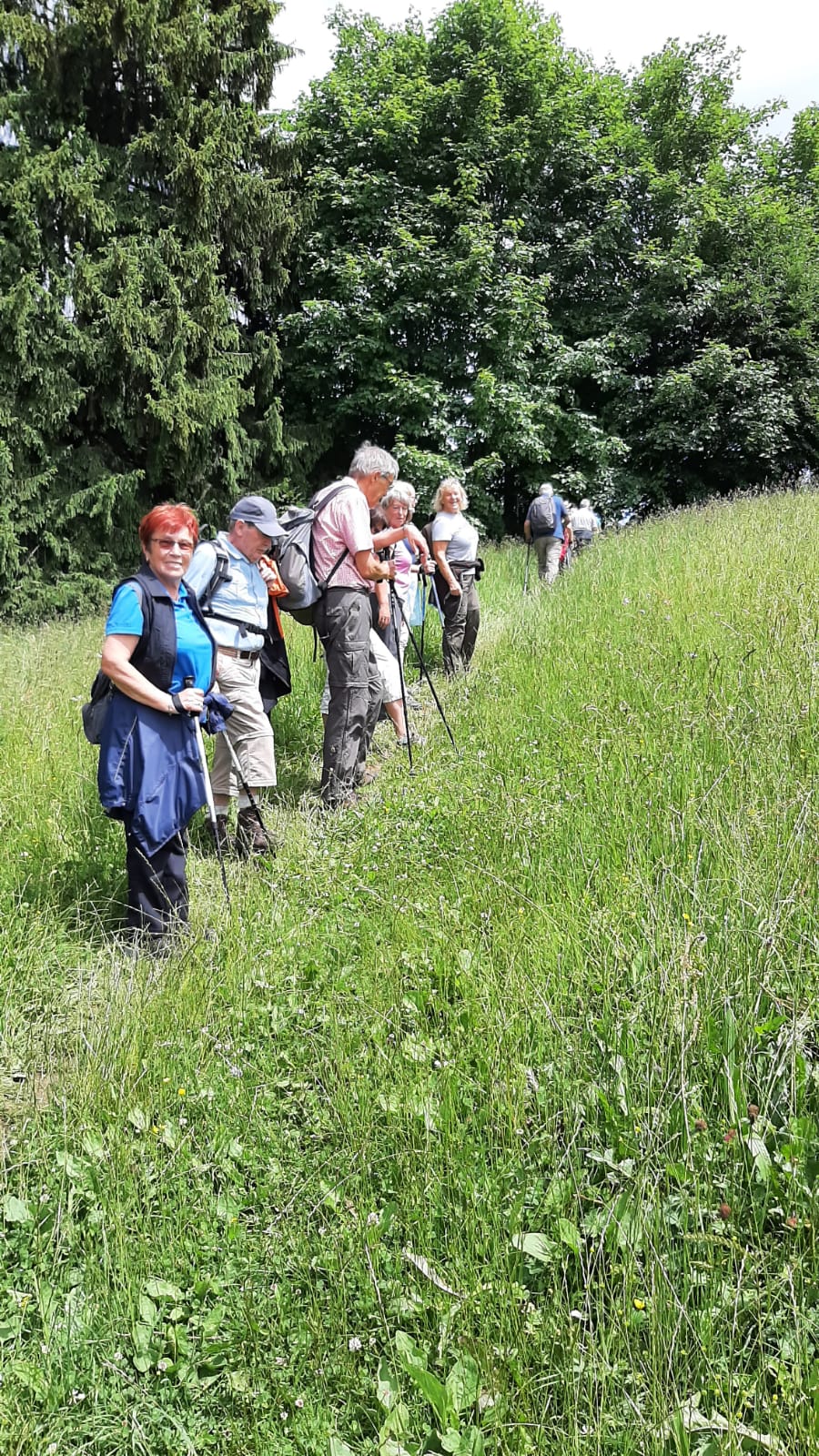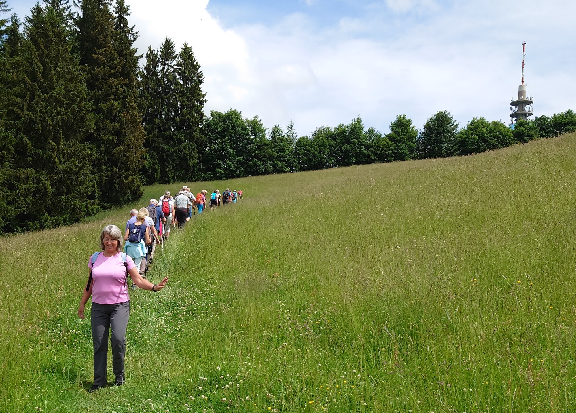 Die Wettervorhersage war gut für Mittwoch, 08.06.2022. Da bei der Ankunft bereits die Sonne schien, machten sich 31 wanderbegeisterte „Spurwechsler“ gut gelaunt auf den Weg. Schon der Parkplatz liegt auf einer aussichtsreichen Anhöhe bei Wiggensbach. In gemächlichem Tempo ging es zunächst sanft ansteigend in Richtung Blender. Die Aussicht auf die Bergkette öffnete sich immer mehr, obwohl die weiter entfernten Gipfel immer wieder in Wolken verhüllt waren. Eine am Weg liegende Kapelle zog unsere Aufmerksamkeit auf sich. Vom Türmchen der Kapelle führte ein dünnes Drahtseil hinüber zu einem Hof bis zum Schlafzimmerfenster. Von dort aus wird zum Angelusgebet geläutet (s.Foto). Auf unserer weiteren Wanderstrecke hörten wir um 12 Uhr das Mittagsläuten. Auf dem Rauenstein -einem Naturschutzgebiet- gingen wir im Gänsemarsch durch blühende Wiesen. Am Blender angekommen hielten wir gemütlich Mittagsrast im „Schatten“ eines mächtigen Sendeturms. Es war recht warm geworden und manche legten sich voll Übermut in die Blumenwiese. Auf dem Rückweg waren die Berggipfel deutlicher zu sehen und wir konnten diese von der Zugspitze bis zum Hochgrat bestaunen. Eifrig plaudernd wanderten wir weiter in Richtung Parkplatz. Im hübschen Glasmacherdorf Schmidsfelden kehrten wir im Burgcafe ein. Die Schattenplätze unter den Bäumen waren begehrt. Die Kunsthandwerker und der Glasbläser hatten ihre Werkstätten und Läden geöffnet und luden zu einem Besuch ein. So ging ein angenehmer Wandertag zu Ende. Die Fotos haben die frohe Stimmung gut eingefangen. Dank an die Fotografen! Vielen Dank auch an Christine und Uli Mebus für die Unterstützung bei der Organisation.