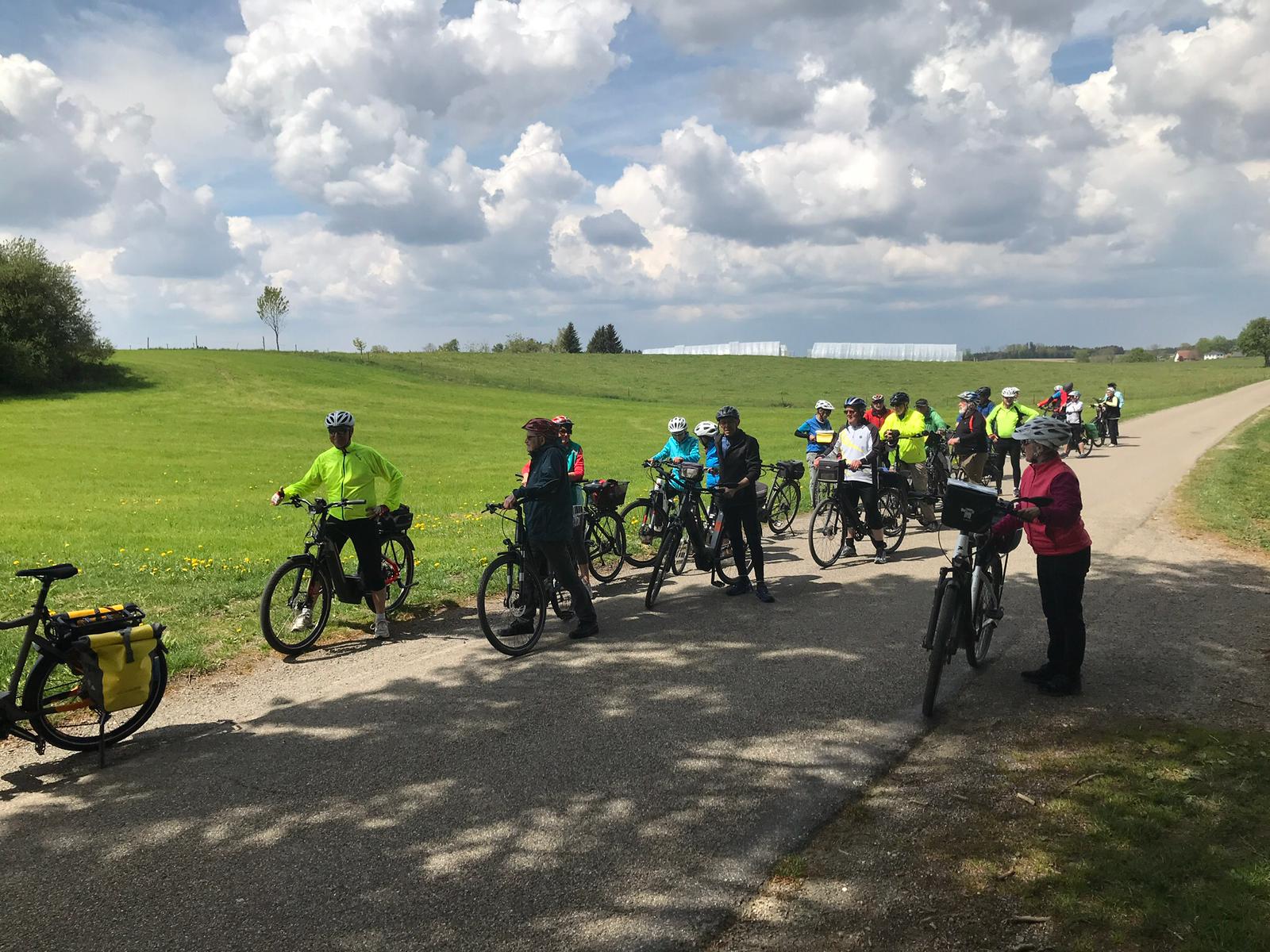 Mit einer Rundtour von Bad Waldsee nach Wolfegg wurde die diesjährige Radsaison eröffnet. Obwohl die Wetteraussichten etwas zweifelhaft waren, trafen sich 26 „Optimistinnen und Optimisten“ auf dem Parkplatz des Hymer-Museums (vielen Dank an die Firma Hymer!), um die Tour entlang des herrlich gelegenen Golfplatzes und vorbei an der 1889 von der Fürstin Sophie zu Waldburg-Wolfegg auf der Weltausstellung in Paris erworbenen Kapelle (Fürstin-Sophie-Kapelle) zu beginnen. Nachdem Bad Waldsee nur kurz tangiert worden war, radelte die Gruppe durch eine wunderschöne Allgäu-Landschaft über Arisheim und Ankenreute zur Kapelle St. Mauritius in Volkertshaus, die auf einem Moränenhügel liegt und schon von weitem sichtbar ist. Da der Besuch der Kapelle angekündigt war, war die Kapelle mit ihren mittelalterlichen Fresken offen und konnte von der Gruppe besichtigt werden, auch wurde das Ochsenhauser Friedensgebet gesprochen. Die Aussicht vom Kapellenhügel auf die umliegende Landschaft war beeindruckend! Danach fuhr die Gruppe weiter über Abetsweiler und Alttann nach Wolfegg, wo die Kaffee-Einkehr bei noch gutem Wetter im Garten des Cafés stattfinden konnte. Anschließend führte die Strecke bergab in Richtung Höll und Neutann (mit dem Alten- und Pflegeheim der Stiftung Liebenau) und anschließend gings steil bergauf nach Bergatreute. Der Blick am Ende des Aufstiegs reichte bis zum Kloster Reute und zum Bussen! Die Fahrt führte weiter über Bergatreute nach Gwigg. Da es nun zu regnen begann, wurde ein Unterstand gesucht und Gotteseidank auch schnell gefunden. Als der Regen etwas schwächer wurde, radelte die Gruppe eine Abkürzung nach Bad Waldsee zurück. Der Parkplatz wurde bei wieder gutem Wetter erreicht. Der zwischenzeitliche Regen tat der guten Stimmung der Teilnehmer keinen Abbruch!