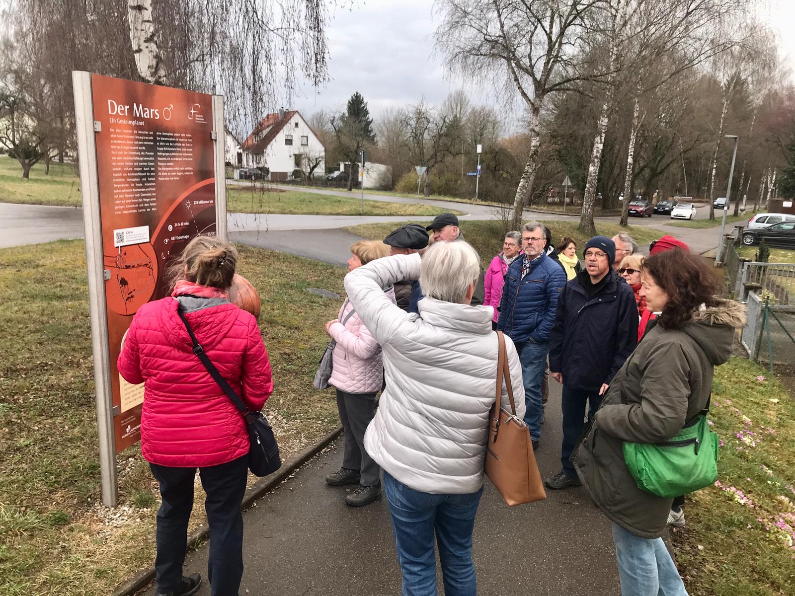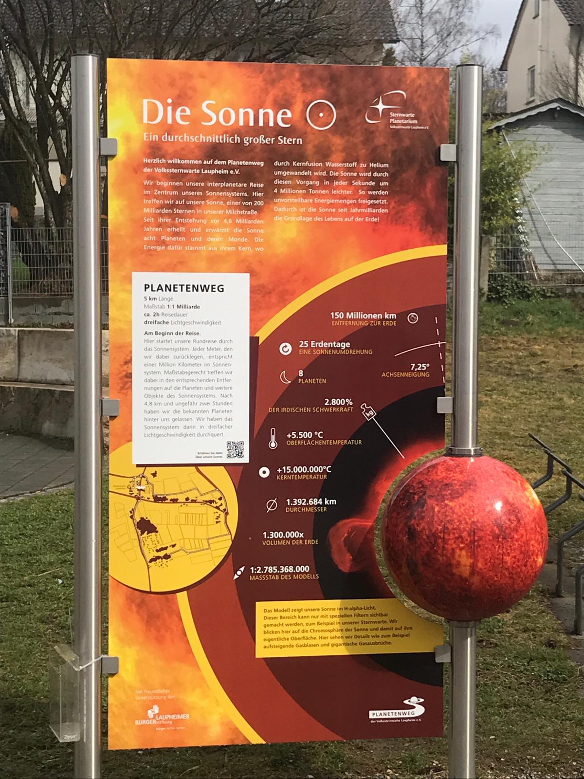 In unterschiedlichen Abständen sind Schautafeln mit Daten und Hinweisen zu den einzelnen Himmelskörpern aufgestellt. Ein Meter auf dem Planetenweg entspricht einer Million Kilometer im Weltall, die Wanderer waren also mit dreifacher Lichtgeschwindigkeit unterwegs.