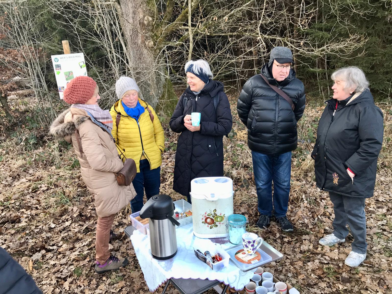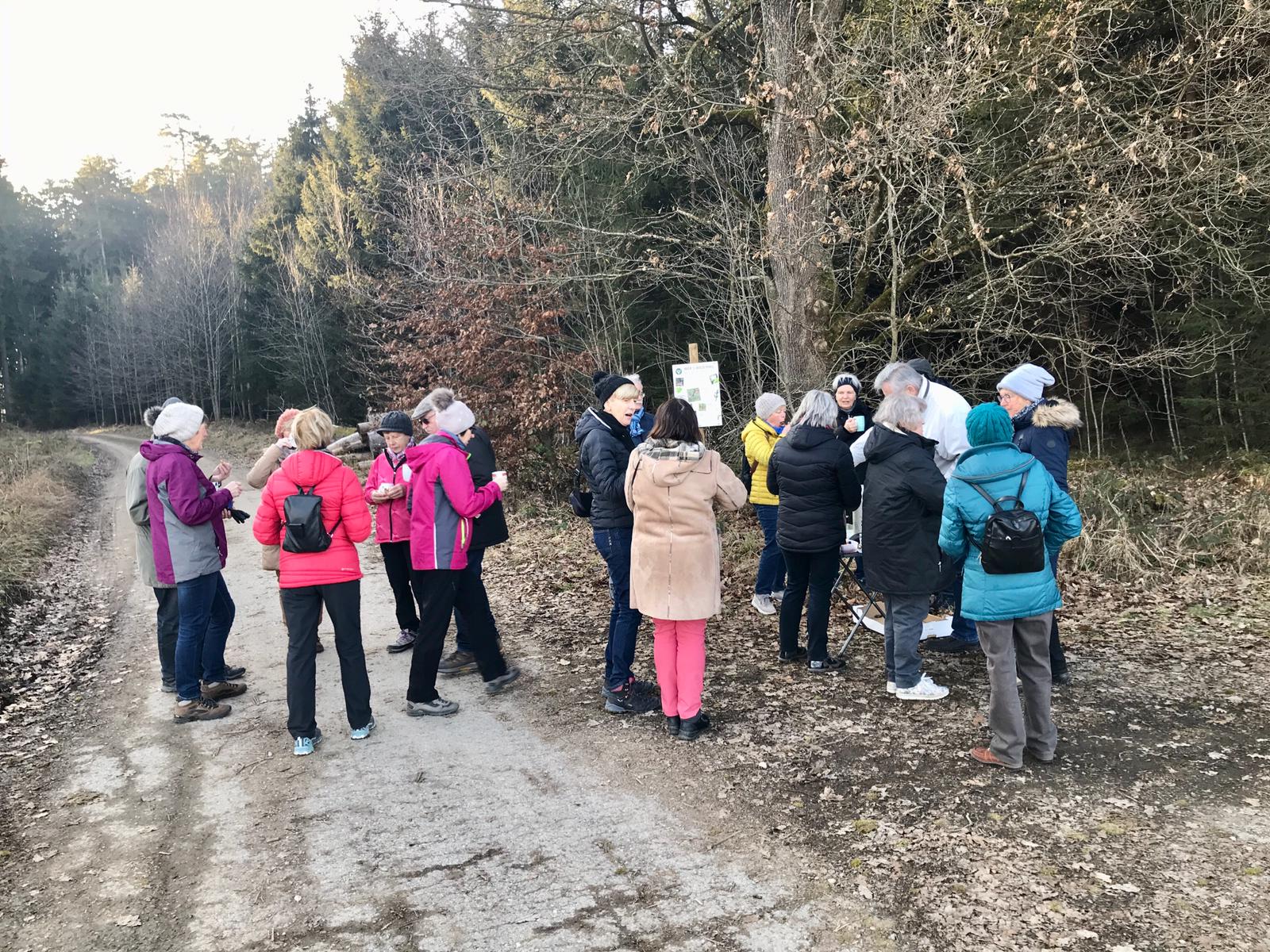 Für die Gruppe ging es zuerst einmal aufwärts durch das Neubaugebiet Burghalde und weiter in die „Säue“. Die Wandergruppe bog dann rechts in einen Feldweg ein. Über dem freien Gelände blies der Wind kräftigt. Auf der Ebene hatte man einen guten Überblick wie zukünftig die Ortsumfahrung von Ochsenhausen verlaufen wird. Bis es soweit ist, vergeht aber sicher noch einige Zeit. Der weitere Weg führte durch Waldabschnitte und freies Feld in stetigem auf und ab. Immer wieder gab es Ausblicke auf Wasenburg, Reinstetten, Goppertshofen und Ochsenhausen. Nach eineinhalb Stunden wurden die Wanderer am Waldrand von Martha und Fritz Weiß erwartet. Sie hatten zur Stärkung Glühwein, Teepunsch und süße Leckereien mitgebracht. Alles wurde von den Wanderern gerne angenommen. Nach der Pause ging es nur noch bergab ins Rottumtal und zurück nach Ochsenhausen.