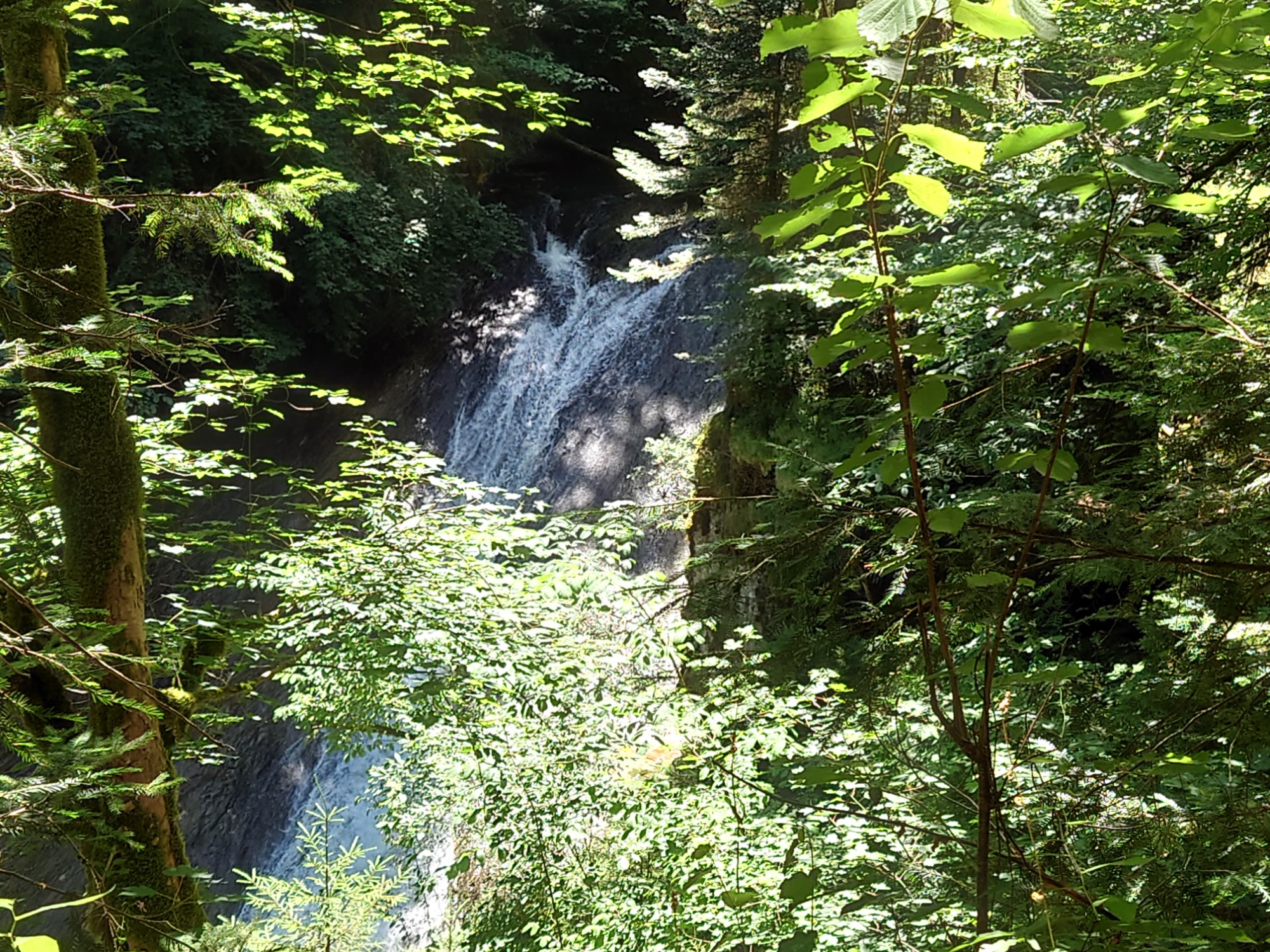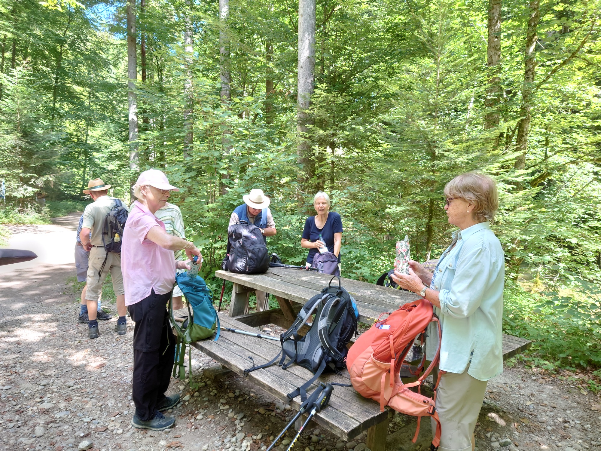 Am Ende des Tobels, nach einem wiederum steilen Aufstieg, erfreute uns im Schatten, ein kleiner Senioren-Kinder-Spielplatz mit einer Riesen-Holzschlange und anderen Attraktionen. Ein letzter Schluck aus der Pulle bereitete uns auf den heißen Rückweg zum Parkplatz hin. Wohlbehalten und verschwitzt kamen wir an und begaben uns sogleich in unser Terrassen-Kaffee im Schatten eines Landgasthofs und verwöhnten uns mit Eis, Kaffee und Kuchen.