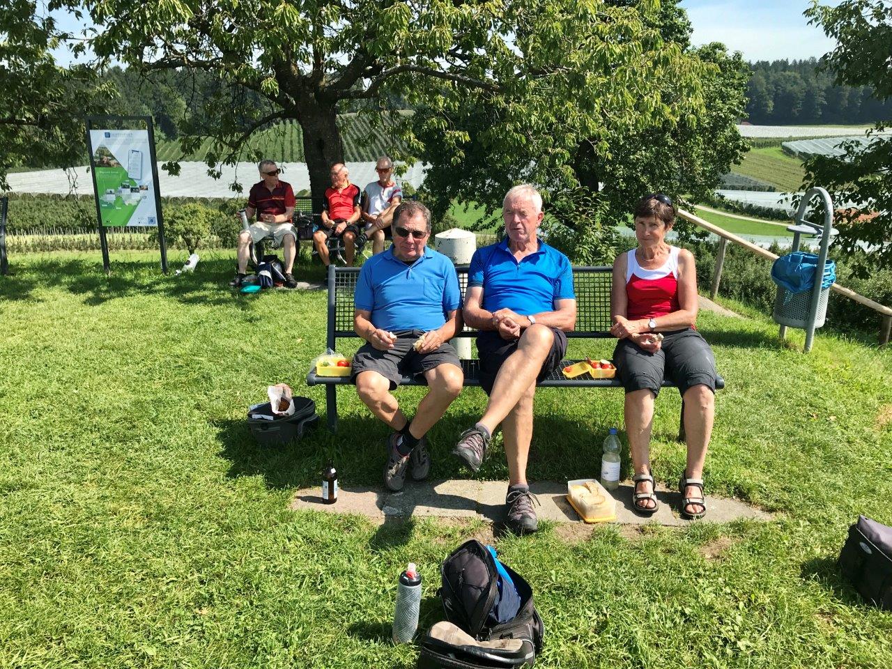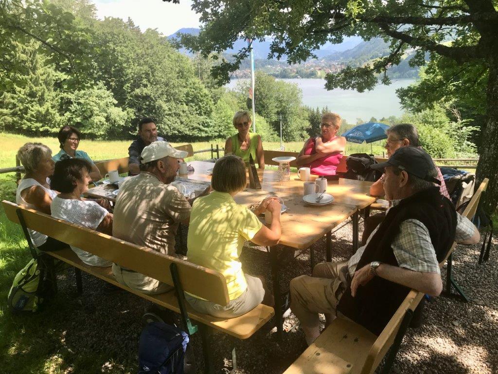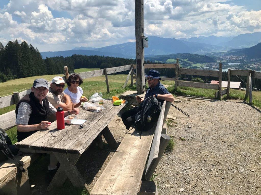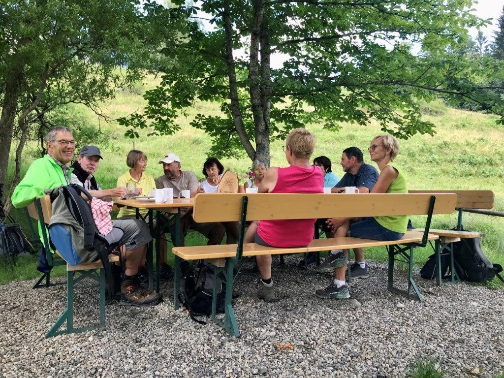 Weiter gings nun stetig leicht bergan, meist durch einen Wald, in Richtung Siedelalpe. Dort bog die Gruppe zum „Köpfle“ ab, mit 1024 m der höchste Punkt der Wanderung. Hier wurde eine längere Mittagspause eingelegt und die herrliche Aussicht über den Alpsee und die angrenzende Landschaft genossen. Anschließend wanderten die Spurwechsler immer bergab, zunächst entlang eines Panoramawegs und dann durch eine Kuhweide hindurch zur Alpe Schönesreuth, in der die Gruppe bei Kaffee und Kuchen, verbunden mit einer wunderschönen Aussicht, unter einer schattigen Eiche ebenfalls eine längere Pause einlegte.