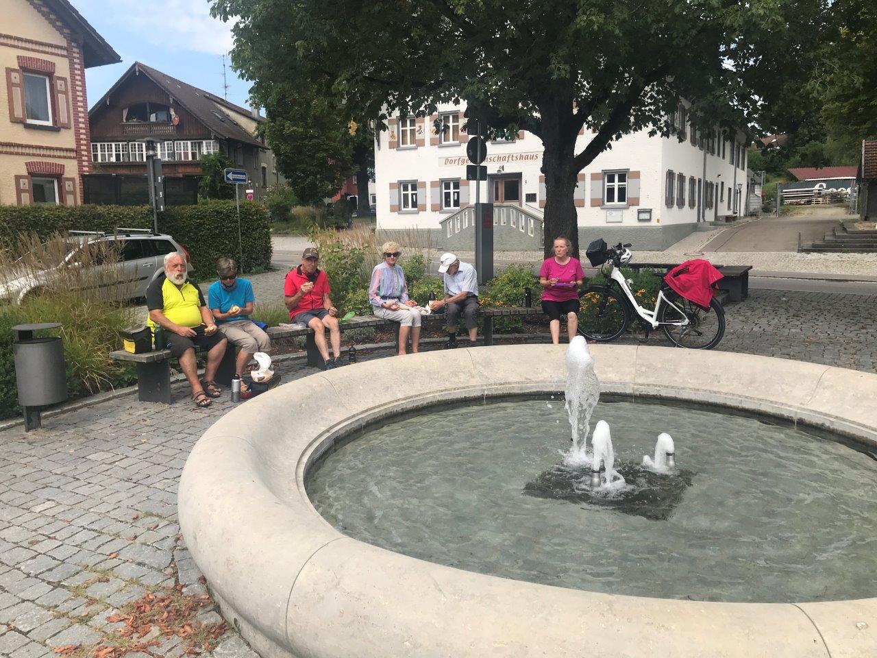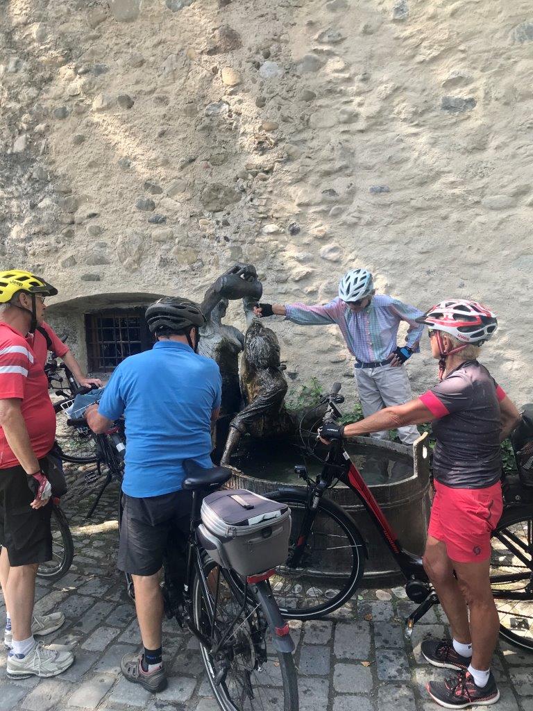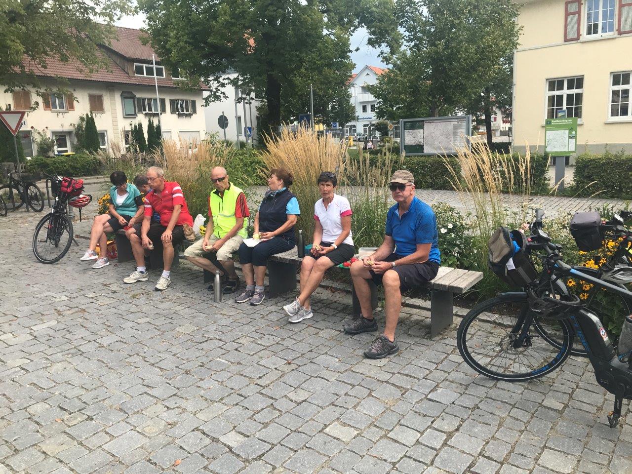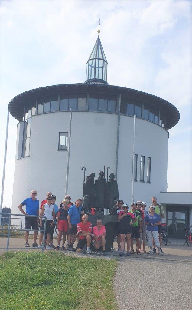 Nachdem die Fahrräder auf dem Parkplatz in Leutkirch, flächenmäßig die fünftgrößte Gemeinde Baden-Württembergs, abgeladen waren, gab es zunächst einige Hinweise für die Radtour. Dann fuhr die Gruppe auf einem schönen Radweg zum Hochwasserrückhaltebecken Urlau, das Urlau und Leutkirch vor Hochwasser schützt. Weiter ging es auf Radwegen und kleineren Straßen nach Isny. Hier gab es einige Erklärungen zum Schloss Isny, das der Kulturmittelpunkt der Stadt ist. Die dortige Kunsthalle wurde vom Isnyer Künstler Friedrich Hechelmann ausgestaltet und beinhaltet sein künstlerisches Werk (Wikipedia). Nach dem gemeinsamen Gang durch die Fußgängerzone wurde die Radtour über Neutrauchburg nach Argenbühl-Eisenharz fortgesetzt, das pünktlich zur Mittagszeit erreicht wurde. Auf dem Dorfplatz wurde gemütlich gevespert. Vor der Weiterfahrt gab es einige Ausführungen zur Geschichte Argenbühls. Danach führte die Tour auf guten Wegen über Eglofs nach Wangen, wobei die Gruppe schöne Aussichten auf die Voralpen- und Allgäulandschaft genießen konnte. In Wangen (kurzer Stopp am „Kopfwäsche-Brunnen“) wurde eine längere Kaffeepause eingelegt. Nachdem die Tour bisher meist bergab geführt hatte, begann nun auf einem Radweg der Anstieg in Richtung Leutkirch, der aber von der Gruppe trotz der hohen Temperaturen bravourös gemeistert wurde. In Tautenhofen wurde per Rad der steile Weg zur Autobahnkapelle Winterberg bewältigt. Die Gruppe genoss die herrliche Aussicht über Leutkirch und das Allgäu und besichtigte die im Jahre 2000 errichtete Kapelle, in der die Symbolik des Innenraums erklärt wurde. Anschließend waren es nur noch ein paar Kilometer zurück zum Parkplatz in Leutkirch, der von allen wohlbehalten, ohne Panne und in guter Stimmung erreicht wurde.