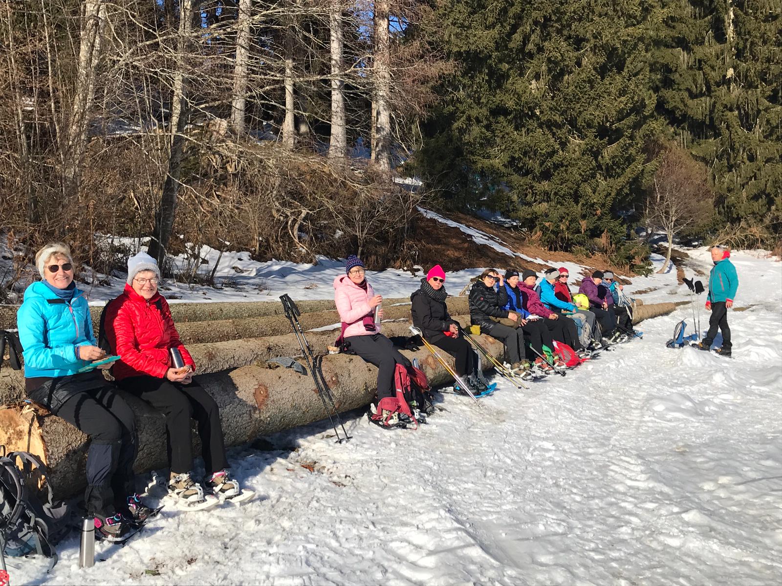 Bei frostigen Temperaturen machte sich eine Gruppe mit 14 TN auf den Weg ins Allgäu zum Schneeschuhlaufen am Eschacher Weiher. Die Sonne empfing uns bereits am Parkplatz. Da alle TN Anfänger waren, dauerte das Anlegen der Schuhschuhe geraume Zeit. Nach einer kurzen Einweisung machten sich alle mit ersten vorsichtigen Schritten auf den Weg. Unterwegs gab es immer wieder Hinweise und Tipps für sicheres und kräfteschonendes Gehen mit Schneeschuhen. Es ist faszinierend zu sehen, wie schnell alle mit mehr Sicherheit und Geschick in unterschiedlichen Schneequalitäten unterwegs sind und damit zurecht-kommen. Das herrliche Winterwetter mit strahlender Sonne begleitete uns den ganzen Tag. So konnten wir in aller Ruhe unsere Vesperpause, gemütlich auf Baumstämmen sitzend mit Blick auf die Allgäuer Berge, genießen. Den Rückweg legten wir schon zügiger zurück, indem zwei Männer die Spur vorlegten. Alle TN freuten sich über den gelungenen Start ins Schneeschuhlaufen und über die frohe Runde, die sich da getroffen hat. Zum Gelingen haben Christine und Uli tatkräftig mit beigetragen. Danke euch!