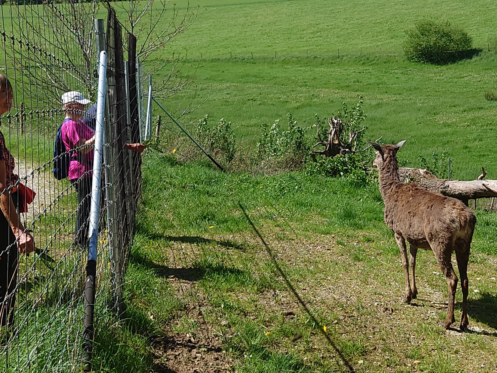 Über die Wiese gings auf den Weg, der zum St. Annahof führt, am Werdich-Haus vorbei. Hier waren zu unserer Überraschung die Hirsche mit ihren Hirschkühen im Schatten versammelt und wir konnten sie aus der Nähe bestaunen. Die Herren hatten vor ein paar Tagen ihre Geweihe abgeworfen und man sah schon das neue Geweih sprießen.