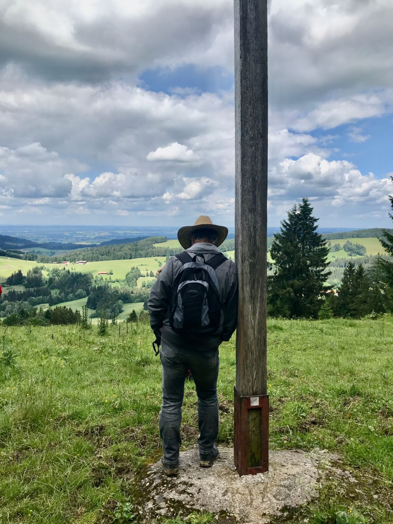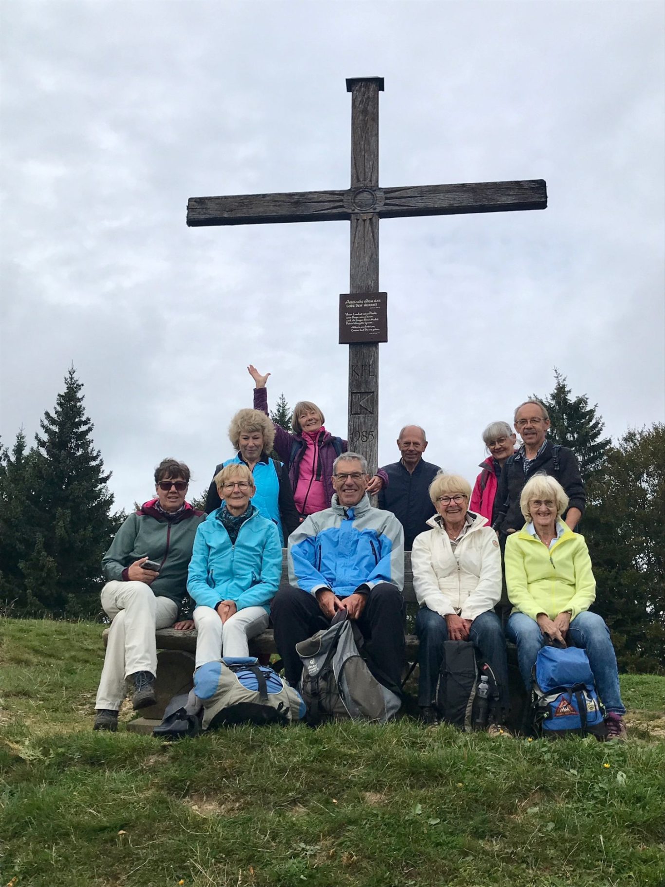 Am 5.10.2023 trafen sich 13 Spurwechsler zur Wandertour auf den Hauchenberg. Das Wetter war ideal, wenn auch noch etwas frisch. Der Himmel leider bedeckt, trotzdem eine gute Sicht. Man startete in Diepolz bei der Kirche und musste gleich eine Steigung von 21 Prozent bewältigen. Danach gings gemütlich bergan bis mir die Luft aus ging. Gottseidank hat Uli sich gleich bereit erklärt, die Gruppe zum Alpkönigblick und weiter zum Gipfelkreuz (siehe Bilder) zu führen. Dort genossen sie den schönen Rundblick übers Allgäu, nahmen ihr Vesper ein und wanderten zurück zur Einkehr auf die Höfle-Alpe.