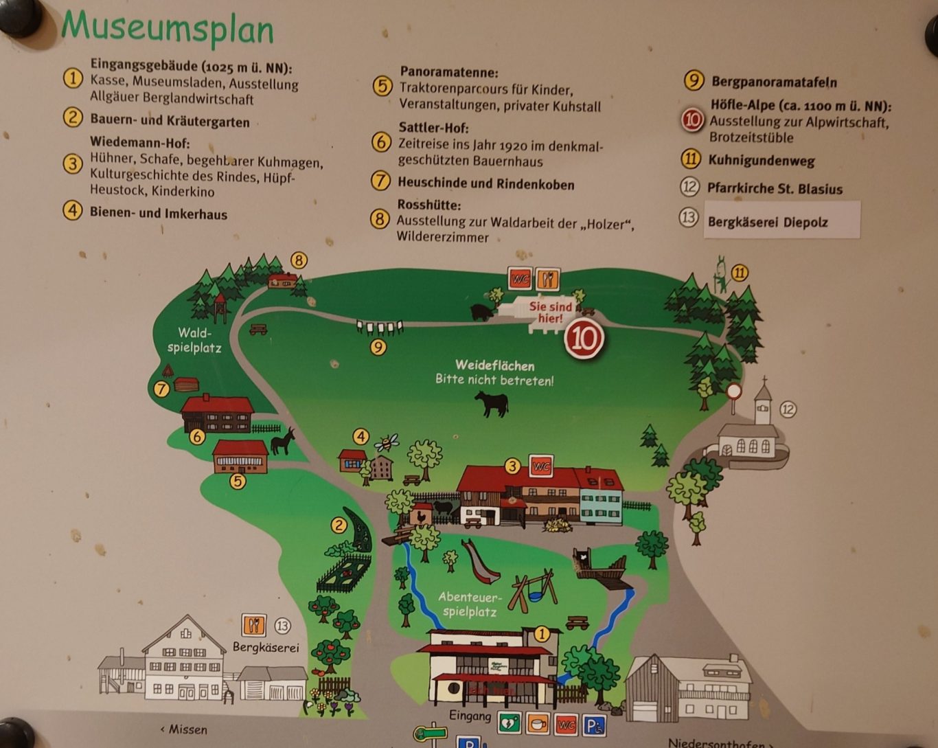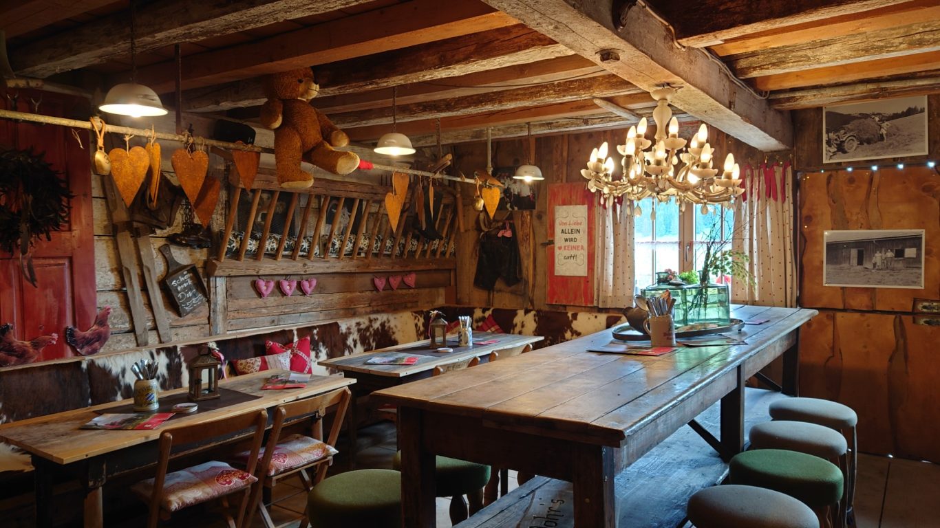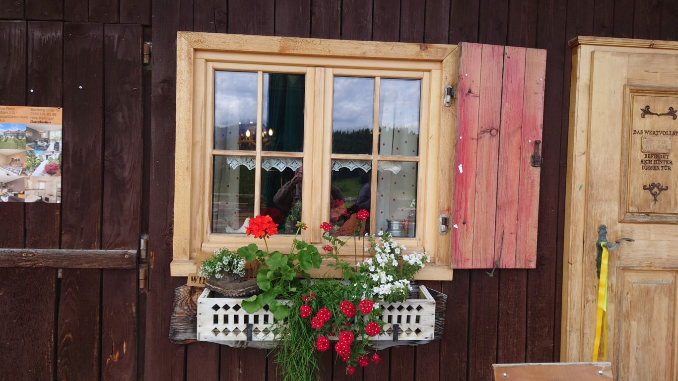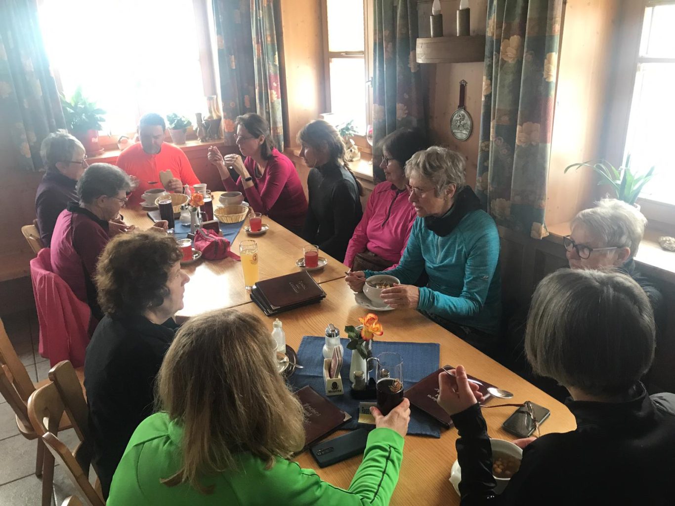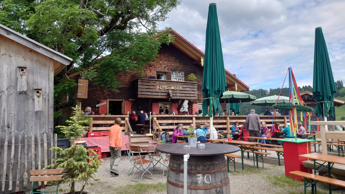 In Niedersonthofen angekommen, begaben wir uns in die am Fuße des Stoffelbergs gelegene spätgotische Kirche, die bedeutendste im Oberallgäu. Sie wurde vom Benediktiner Kloster in Ottobeuren gegründet. Hubert ließ sein neues, kleines Alphorn erklingen und wir sangen der Mutter Gottes zu Ehren ein schönes Lied. Danach begaben wir uns schnurstracks in das sehr nette und freundliche Gasthaus zur „Sonne“. Es war dort für uns reserviert und es störte nicht, dass wir drei Stunden früher kamen. Wir wurden hervorragend bedient und genossen das feine Mittagsmahl