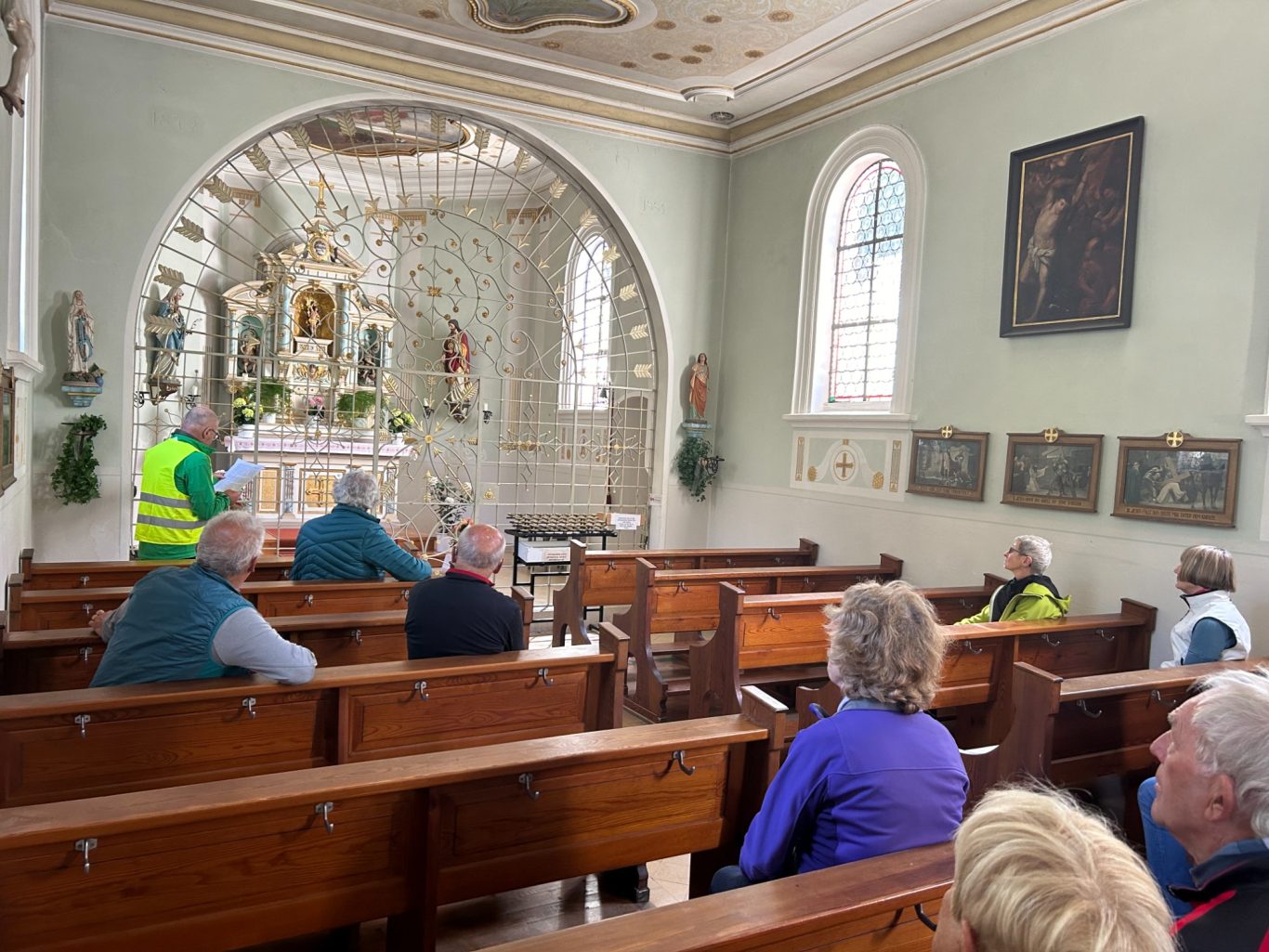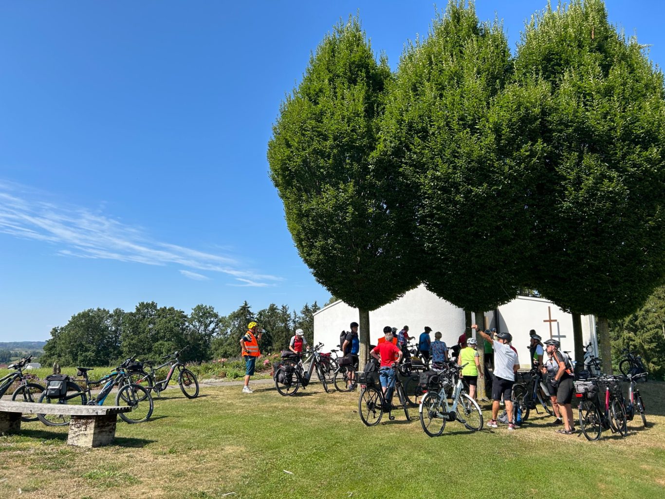 20 Spurwechselradler starteten am Mittwoch, dem 18. September 2024 zu einer Nachmittagstour in Richtung Grabener Höhe auf dem Haisterkircher Rücken. Erstes Etappenziel war die Sebastianskapelle. Es ging über‘s Badhaus, Füramoos, Hummertsried, den Bühlerhof oberhalb von Eggmannsried nach Graben. An der Wallfahrtskapelle Bastiani angekommen, war zu entscheiden: Erst Bildung oder erst Brotzeit. Den Bildungsteil übernahm Eberhard Lehmann. Er berichtete über die Ausstattung der Kapelle und, dass der Bastiani-Tag alljährlich am 20.Januar mit einer Fußwallfahrt mit Hunderten von Pilgern gefeiert wird. Der Heilige Sebastian ist der Schutzheilige der Bauern und genießt hohes Ansehen in der Volksfrömmigkeit Oberschwabens. Die Wallfahrtskapelle ist neben der Bussenkirche die bekannteste und meistbesuchte Pilgerstätte in Oberschwaben. Dies lässt sich durch Einträge ins Fürbittenbuch und gut 12.000 Kerzenstummel jährlich belegen.