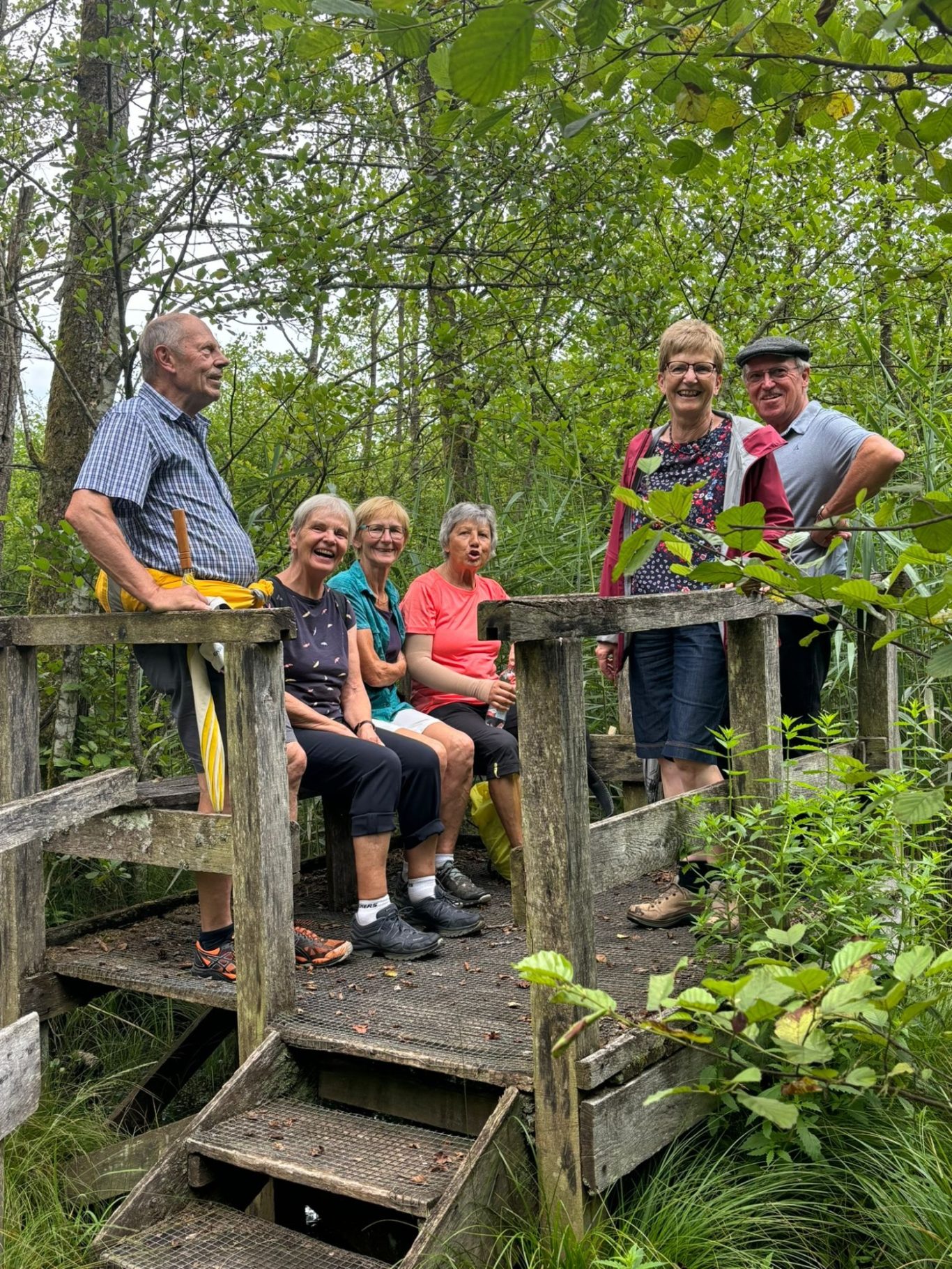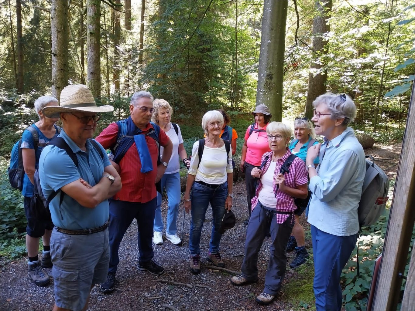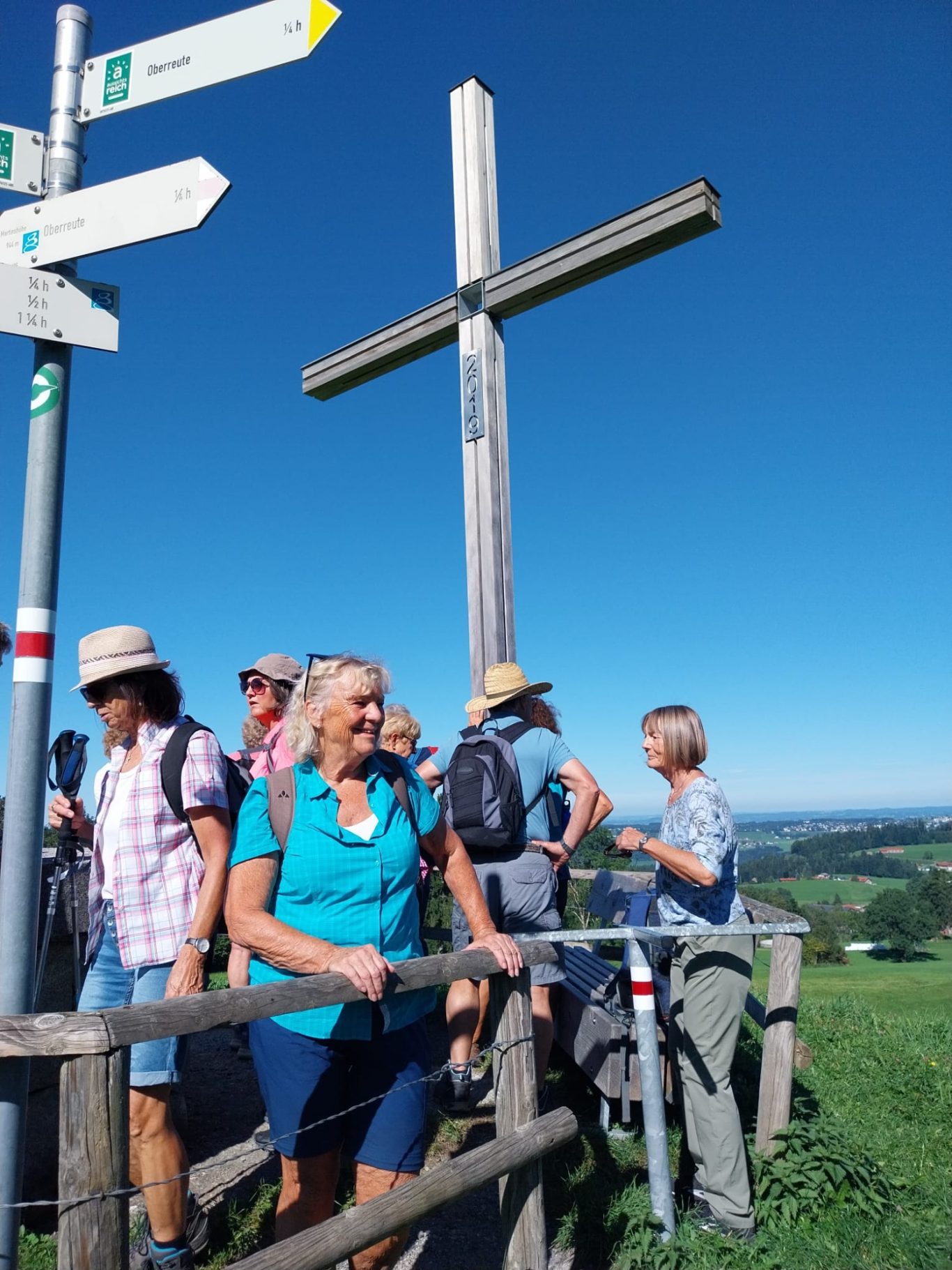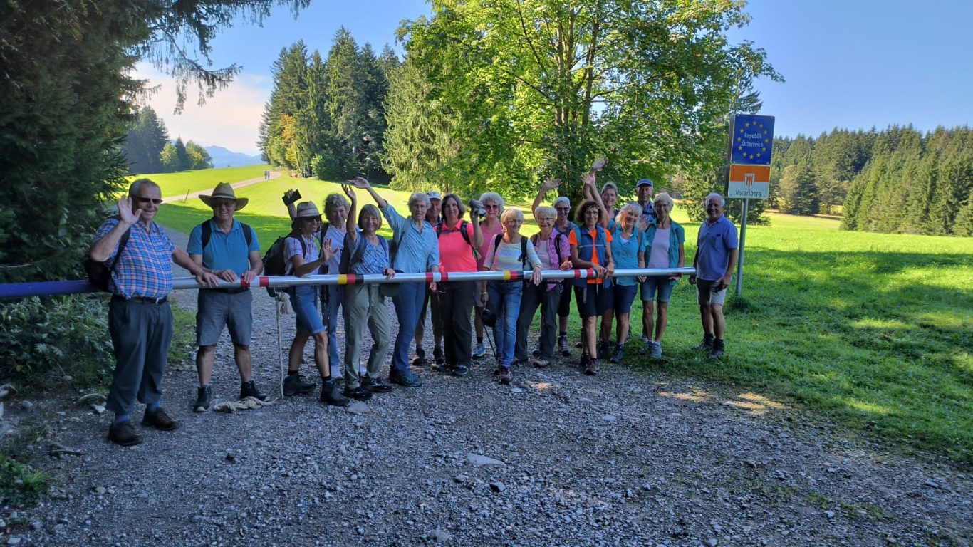 Am Mittwoch 20.09.23 fuhren 19 Spurwechsler nach Oberreute und machten sich auf den Weg nach Sulzberg. Das sonnige Wetter lud ein, den kurzen Anstieg zur Martinshöhe hochmotiviert anzugehen. Beim Gipfelkreuz angekommen, packten die ersten das Vesper aus und alle genossen den Blick hinunter nach Oberreute und weit hinaus Richtung Heimat. Der weitere Weg führte über Wiesen- und Waldwege. Die Sonne schien durch die lichten Waldstücke und gab angenehmen Schatten. Beim Kalten Brunnen trafen wir auf einen Ruheplatz mit Hütten, Bänken, Hängematten und Spielgeräten. Ganz Mutige wagten, im „Spinnenetz“ zu klettern. Kurze Zeit später kamen wir zum Grenzschild und zum „Schlagbaum“, der sofort mit dem angebrachten Seil heruntergeholt wurde. Ein seltenes Motiv für ein Gruppenfoto! Der Weiterweg führte auf dem Grenzerpfad durch ein Waldstück Richtung Sulzberg. Der Föneinfluss bescherte uns eine überwältigende Bergsicht, als wir auf dem Panoramaweg weiterwanderten. Die Berggipfel vom Säntis über den Bregenzer Wald, die Nagelfluhkette , der Hohe Ifen und der Widderstein standen klar und mächtig vor uns. In Sulzberg kehrten wir ein und freuten uns über die feinen Speisen und Kuchen. Selbst vom Restaurant aus konnten wir die Aussicht genießen. Nach dieser Erholungspause gingen wir auf dem Rückweg durchs Wildrosenmoos. Der Moorsee begeisterte alle und auch hier war ein guter Ort für ein Gruppenfoto. Am Grenzerhäuschen gab es viel zu bestaunen, denn die Ausstattung samt Zeitung von damals war sehenswert. Bis 1995 gab es hier Grenzposten, die nach festen Plänen auf Schmugglerjagd gingen. Der weitere Rückweg lag oft im Schatten, denn die Sonne begleitete uns den ganzen Tag. Die frohe und freudige Stimmung ist auf den Fotos zu sehen. Die angeregten Gespräche zeigten, dass sich alle wohl fühlten und den Wandertag in netter Gesellschaft bei strahlendem Sonnenschein genossen. Auch die fünf „Neuen“ lobten die angenehme und frohe Gesellschaft. Einen besonderen Dank möchte ich Sigrid Buhl aussprechen, die mich umsichtig und tatkräftig bei der Durchführung des Wandertages unterstützte. Herzlichen Dank auch denen, die fotografiert haben!