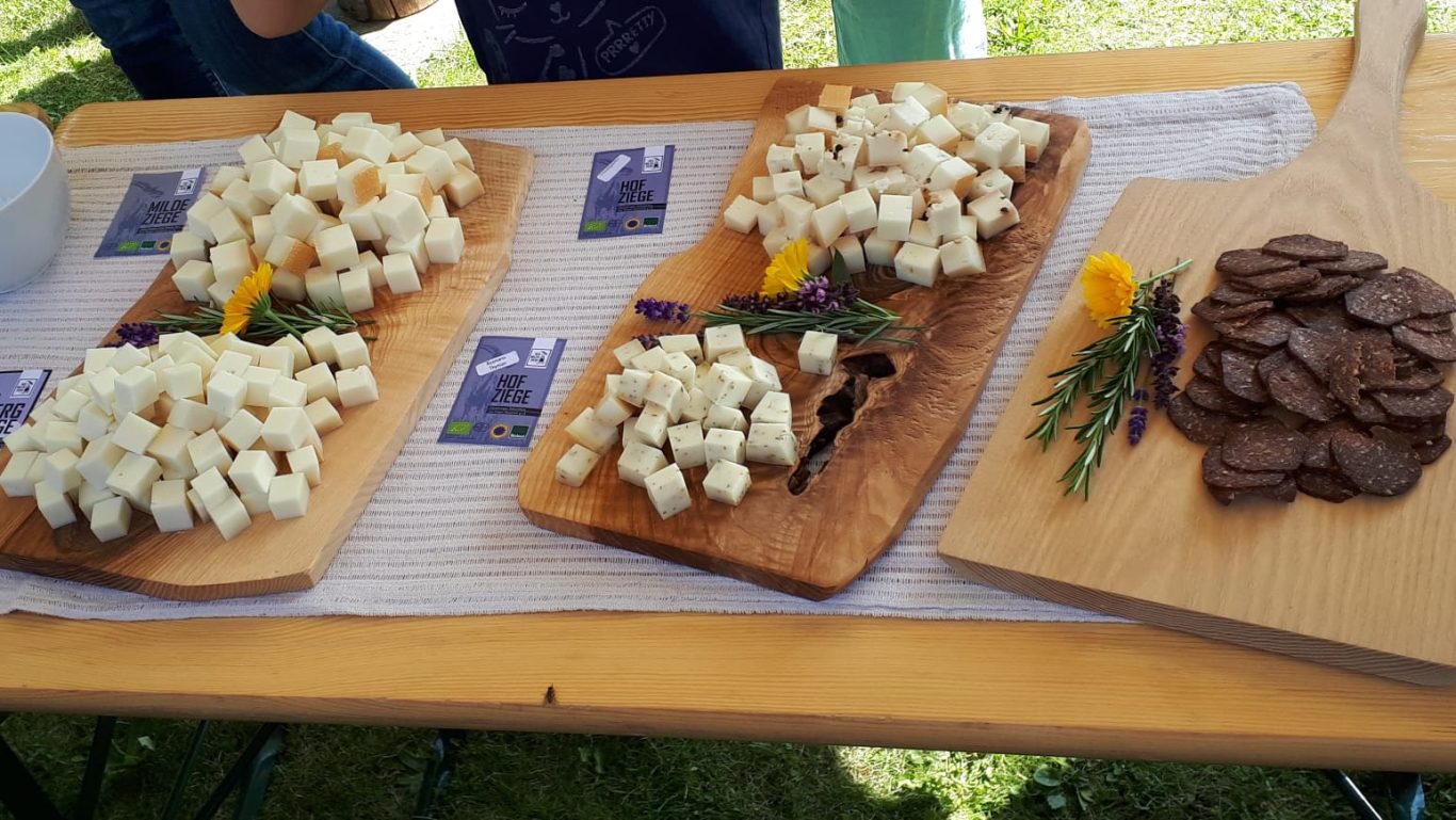 Nach viel Information über den Hof, die Ziegen, die Milch und die Käseherstellung durften wir die verschiedenen sehr leckeren und wunderhübsch präsentierten Käsesorten noch verkosten.
