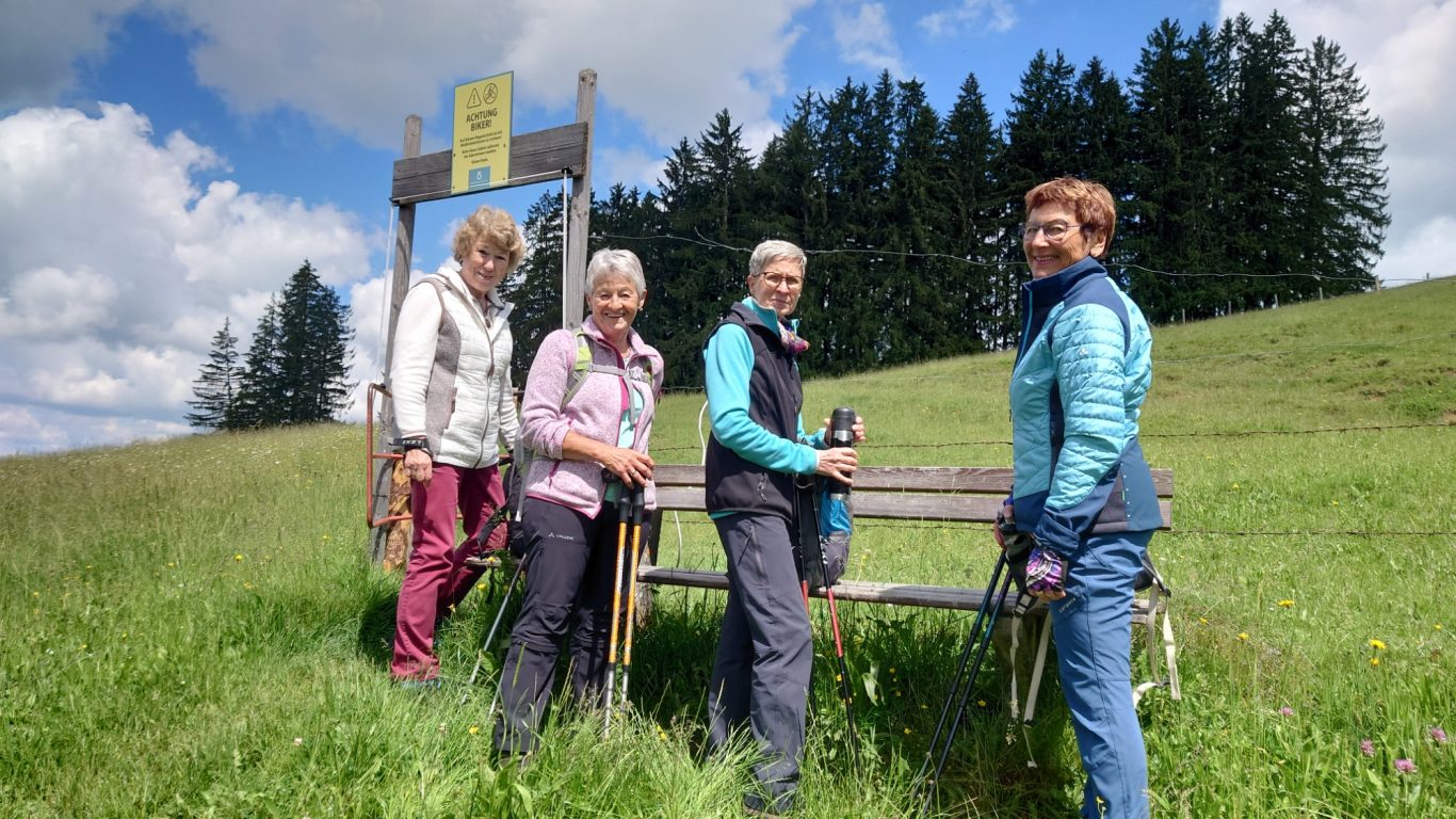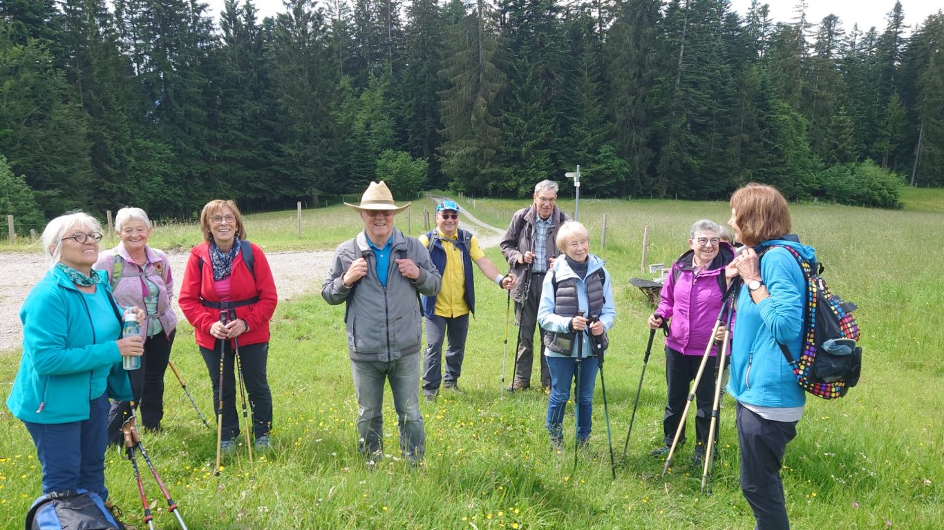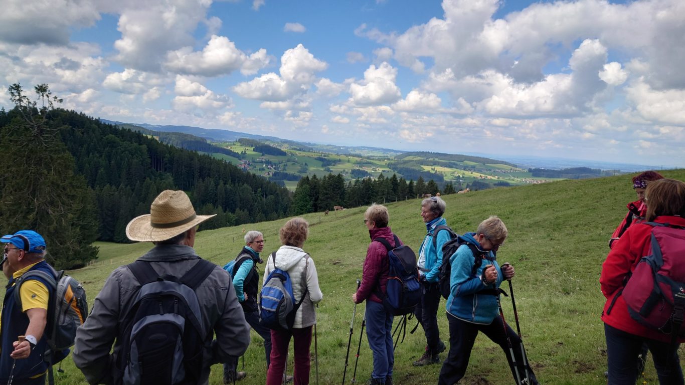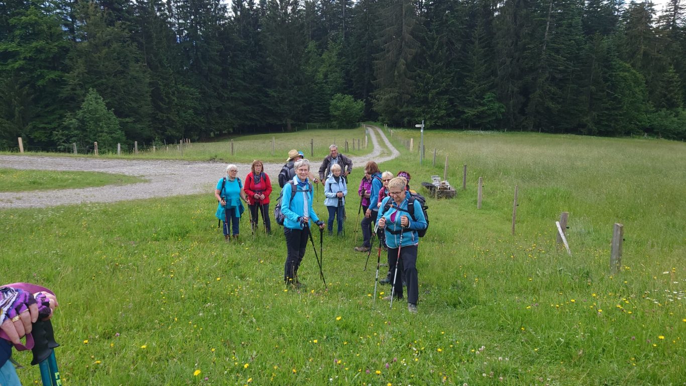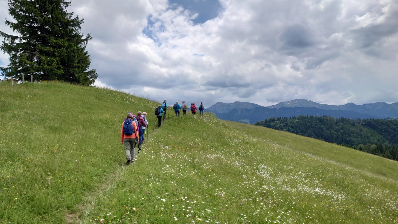 Am Mittwoch 12.06.24 trafen sich 17 Spurwechsler und fuhren nach Oberstaufen/Kalzhofen. Das seit Tagen unsichere Wetter konnte sie nicht abhalten. Die Entscheidung wurde belohnt, indem zunächst der kleine Wanderparkplatz ganz frei war und wir den ganzen Tag warme Temperaturen mit einem Sonne-Wolken-Mix hatten. Zunächst führte der Wanderweg stetig sanft bergauf und wir hatten eine gute Sicht auf die Nagelfluhkette. Wir freuten uns an den blühenden Wiesen, in denen wir sogar Orchideen entdeckten. Vor dem etwas steileren Anstieg gab es eine Pause zur Stärkung. Ich staunte, da manche Gespräche auch beim Aufstieg nicht verstummten und alle strahlend ankamen. Die Sicht reichte jetzt weit ins Land hinaus und auch der Bodensee war zu entdecken. Meine Vorahnung sollte sich bald bewahrheiten, denn der Kammweg war naß, rutschig, matschig und teilweise nicht zu begehen. Mutige fanden immer einen Ausweg, auch wenn die weidenden Jungrinder uns neugierig beäugten und uns nachstapften. Nach diesen Hindernissen war die Mittagspause mehr als verdient! Am Gipfelkreuz war die Freude über das herrliche Wetter und den jetzt trockenen Weg groß und wir sangen zum Dank ein Lied. Der Abstieg ging zügig und die Einkehr auf der Alpe lockte. In froher Runde genossen wir Kaffee und Kuchen, die tolle Aussicht und staunten über manche Dekoration und die Gestaltung der Alpe. Auf dem nahen Parkplatz angekommen, freuten wir uns über die gelungene Tour und vor allem über die lockere, freudige und herzliche Atmosphäre untereinander. Es waren vier „Neue“ dabei, die sich sichtlich wohl fühlten! Alle haben zum Gelingen der Tour beigetragen mit Gelassenheit, Mut und Humor. Danke euch allen!