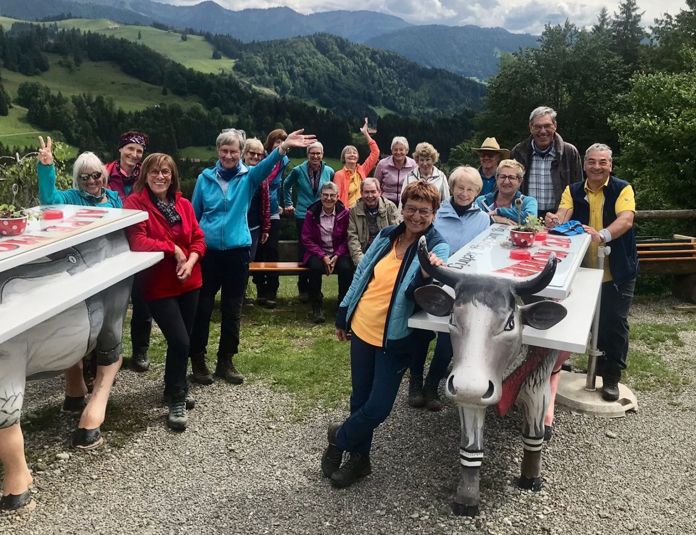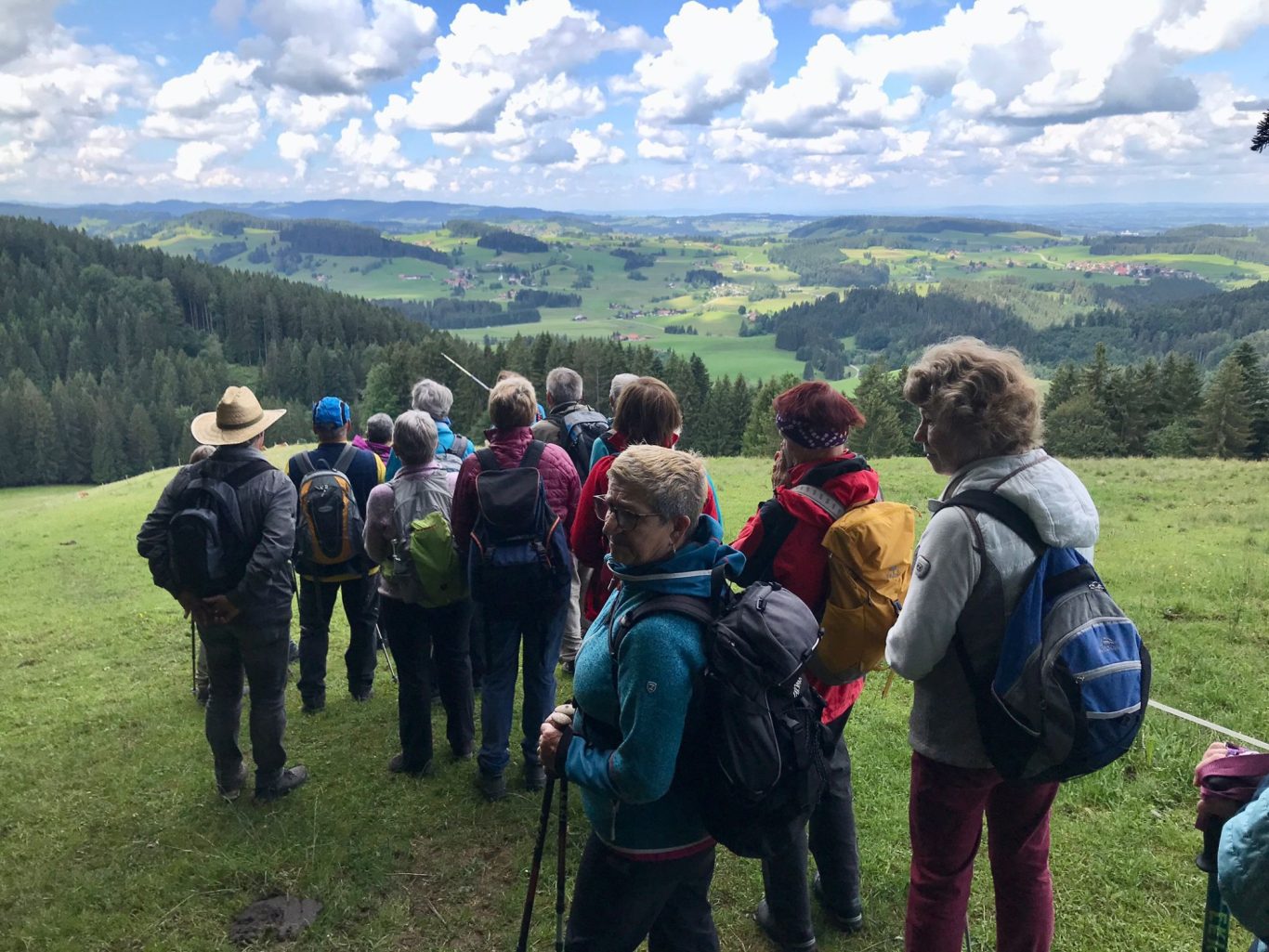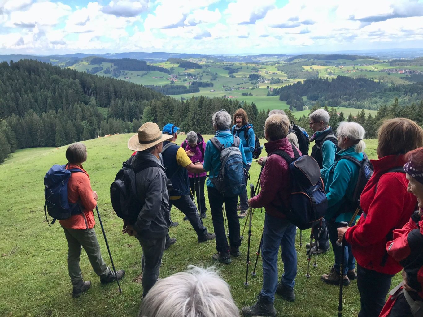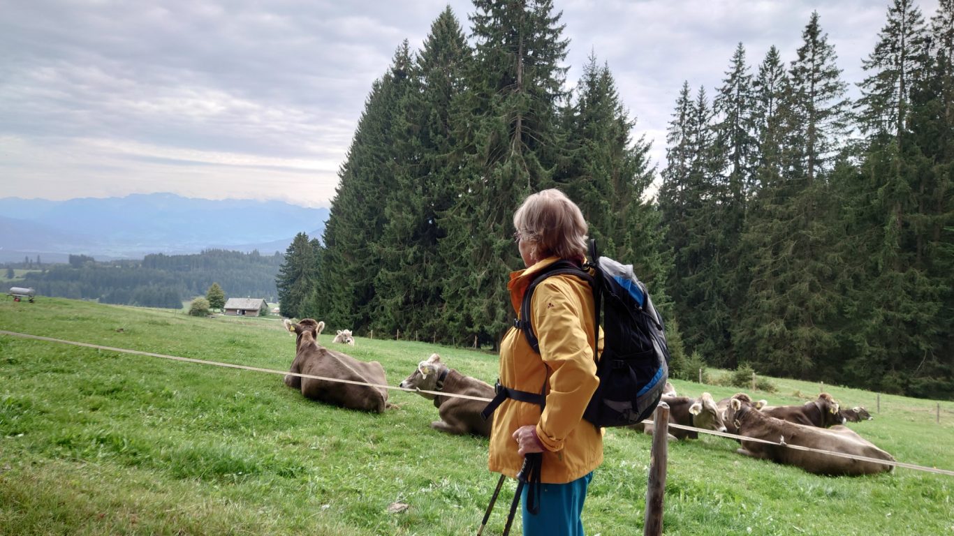 Am Mittwoch 12.06.24 trafen sich 17 Spurwechsler und fuhren nach Oberstaufen/Kalzhofen. Das seit Tagen unsichere Wetter konnte sie nicht abhalten. Die Entscheidung wurde belohnt, indem zunächst der kleine Wanderparkplatz ganz frei war und wir den ganzen Tag warme Temperaturen mit einem Sonne-Wolken-Mix hatten. Zunächst führte der Wanderweg stetig sanft bergauf und wir hatten eine gute Sicht auf die Nagelfluhkette. Wir freuten uns an den blühenden Wiesen, in denen wir sogar Orchideen entdeckten. Vor dem etwas steileren Anstieg gab es eine Pause zur Stärkung. Ich staunte, da manche Gespräche auch beim Aufstieg nicht verstummten und alle strahlend ankamen. Die Sicht reichte jetzt weit ins Land hinaus und auch der Bodensee war zu entdecken. Meine Vorahnung sollte sich bald bewahrheiten, denn der Kammweg war naß, rutschig, matschig und teilweise nicht zu begehen. Mutige fanden immer einen Ausweg, auch wenn die weidenden Jungrinder uns neugierig beäugten und uns nachstapften. Nach diesen Hindernissen war die Mittagspause mehr als verdient! Am Gipfelkreuz war die Freude über das herrliche Wetter und den jetzt trockenen Weg groß und wir sangen zum Dank ein Lied. Der Abstieg ging zügig und die Einkehr auf der Alpe lockte. In froher Runde genossen wir Kaffee und Kuchen, die tolle Aussicht und staunten über manche Dekoration und die Gestaltung der Alpe. Auf dem nahen Parkplatz angekommen, freuten wir uns über die gelungene Tour und vor allem über die lockere, freudige und herzliche Atmosphäre untereinander. Es waren vier „Neue“ dabei, die sich sichtlich wohl fühlten! Alle haben zum Gelingen der Tour beigetragen mit Gelassenheit, Mut und Humor. Danke euch allen!