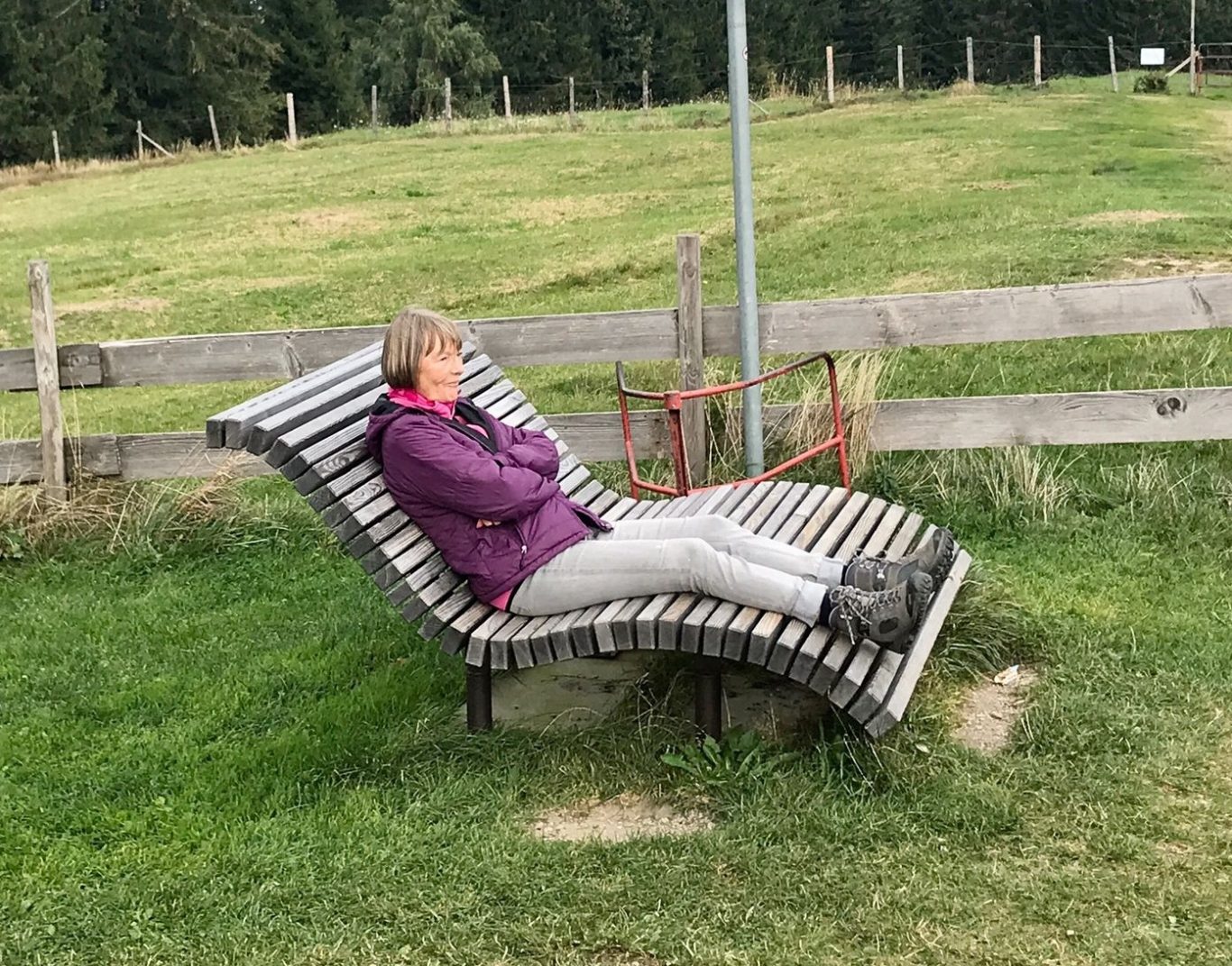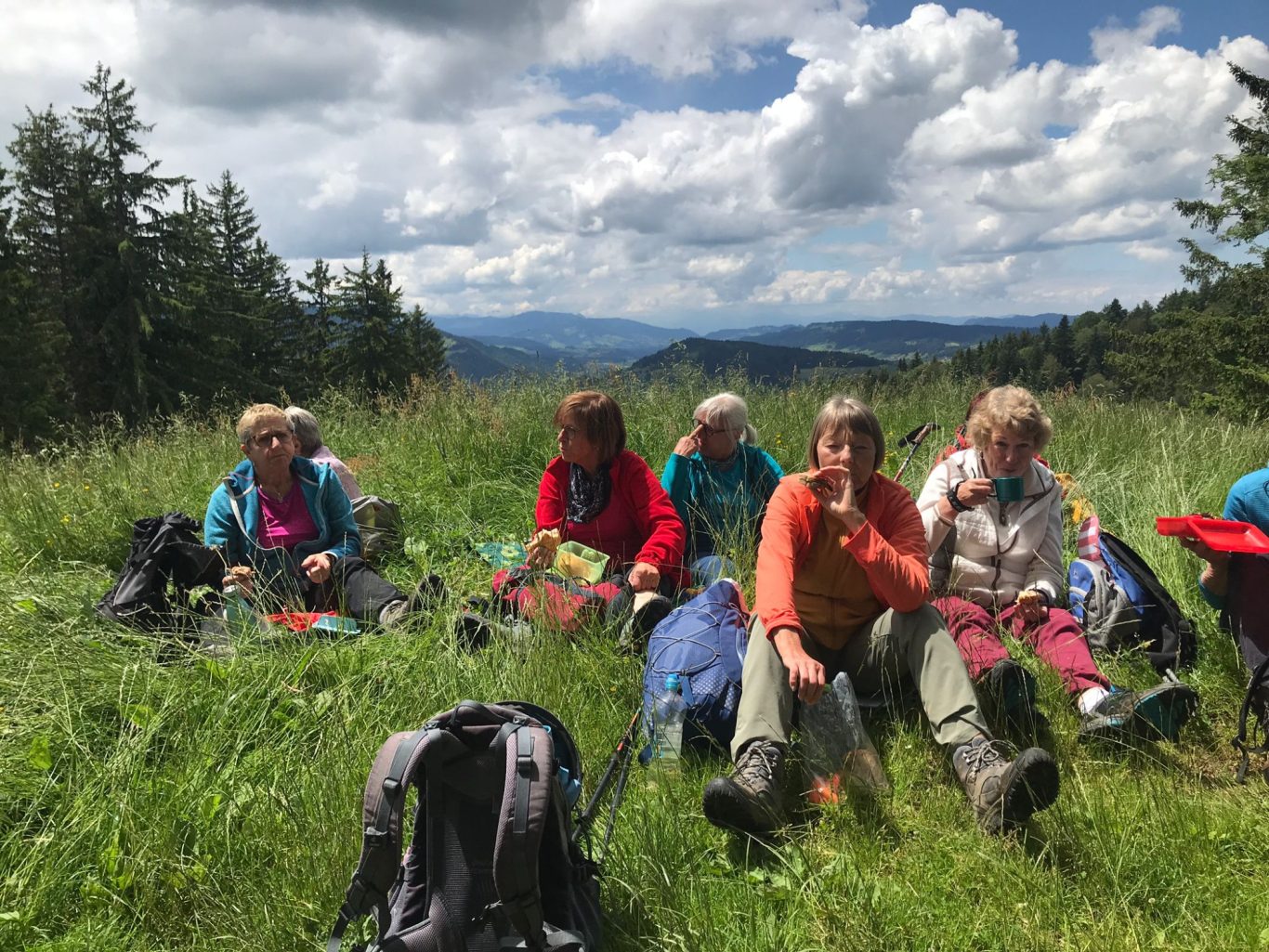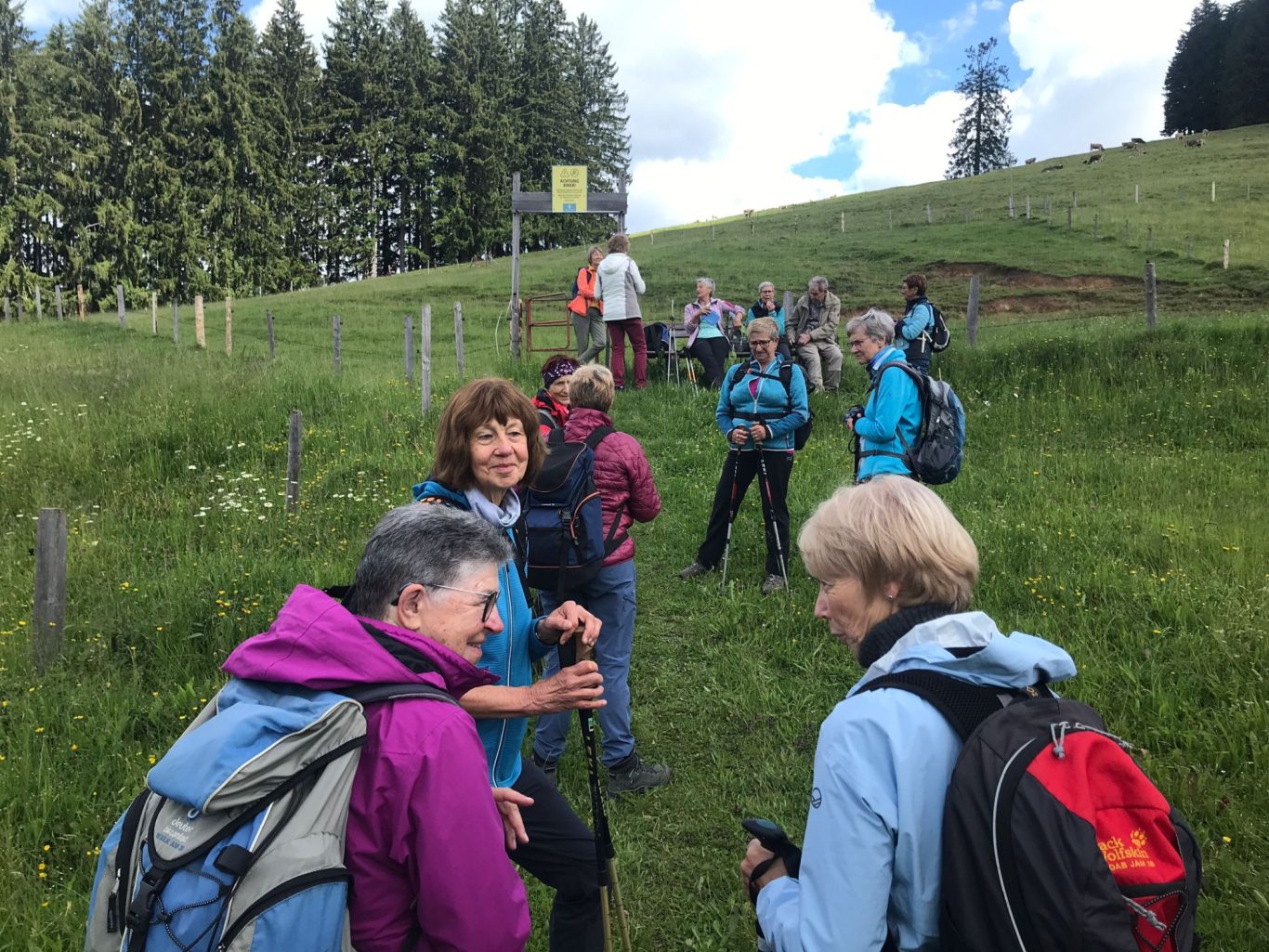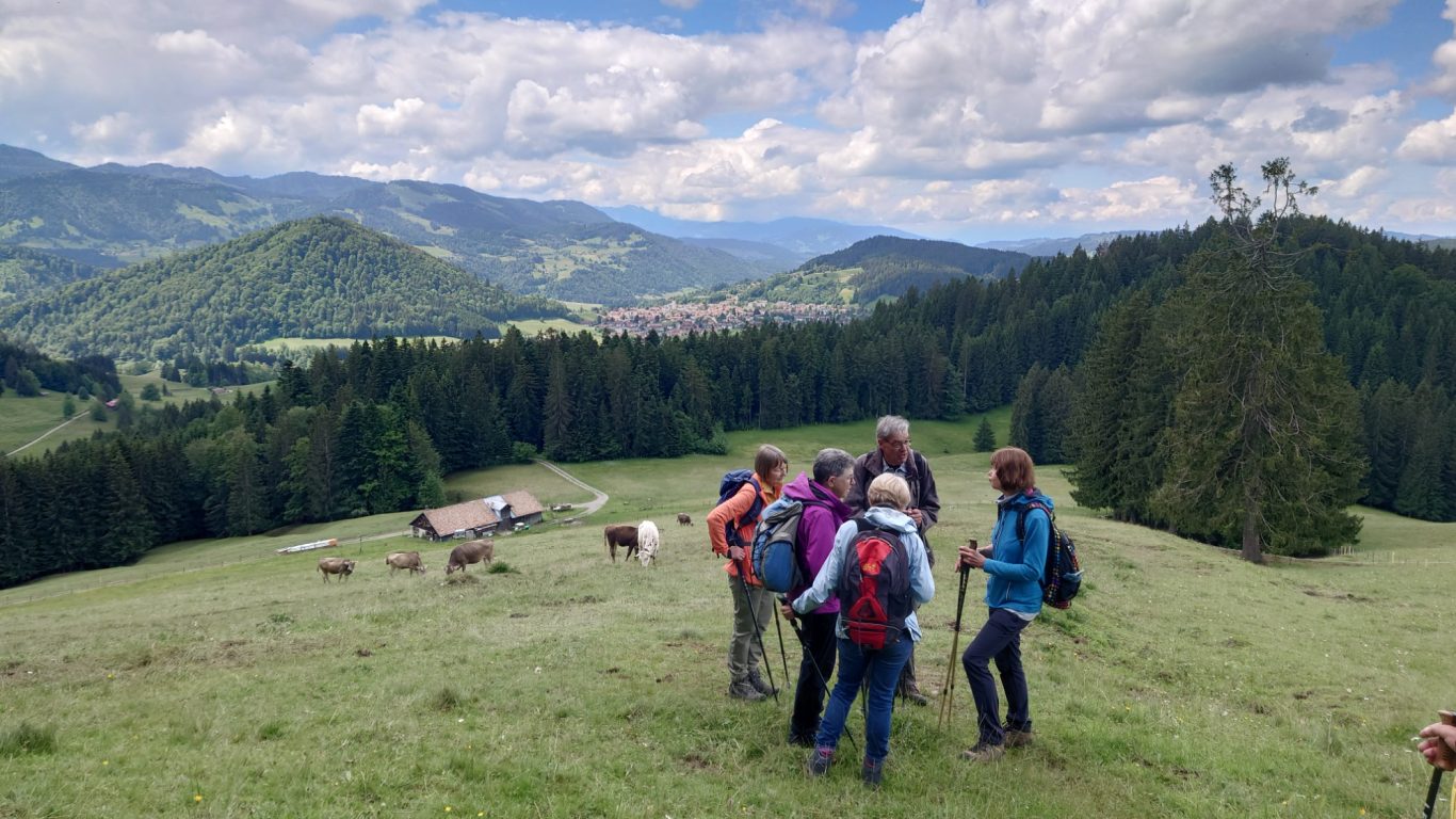 Am Mittwoch 12.06.24 trafen sich 17 Spurwechsler und fuhren nach Oberstaufen/Kalzhofen. Das seit Tagen unsichere Wetter konnte sie nicht abhalten. Die Entscheidung wurde belohnt, indem zunächst der kleine Wanderparkplatz ganz frei war und wir den ganzen Tag warme Temperaturen mit einem Sonne-Wolken-Mix hatten. Zunächst führte der Wanderweg stetig sanft bergauf und wir hatten eine gute Sicht auf die Nagelfluhkette. Wir freuten uns an den blühenden Wiesen, in denen wir sogar Orchideen entdeckten. Vor dem etwas steileren Anstieg gab es eine Pause zur Stärkung. Ich staunte, da manche Gespräche auch beim Aufstieg nicht verstummten und alle strahlend ankamen. Die Sicht reichte jetzt weit ins Land hinaus und auch der Bodensee war zu entdecken. Meine Vorahnung sollte sich bald bewahrheiten, denn der Kammweg war naß, rutschig, matschig und teilweise nicht zu begehen. Mutige fanden immer einen Ausweg, auch wenn die weidenden Jungrinder uns neugierig beäugten und uns nachstapften. Nach diesen Hindernissen war die Mittagspause mehr als verdient! Am Gipfelkreuz war die Freude über das herrliche Wetter und den jetzt trockenen Weg groß und wir sangen zum Dank ein Lied. Der Abstieg ging zügig und die Einkehr auf der Alpe lockte. In froher Runde genossen wir Kaffee und Kuchen, die tolle Aussicht und staunten über manche Dekoration und die Gestaltung der Alpe. Auf dem nahen Parkplatz angekommen, freuten wir uns über die gelungene Tour und vor allem über die lockere, freudige und herzliche Atmosphäre untereinander. Es waren vier „Neue“ dabei, die sich sichtlich wohl fühlten! Alle haben zum Gelingen der Tour beigetragen mit Gelassenheit, Mut und Humor. Danke euch allen!