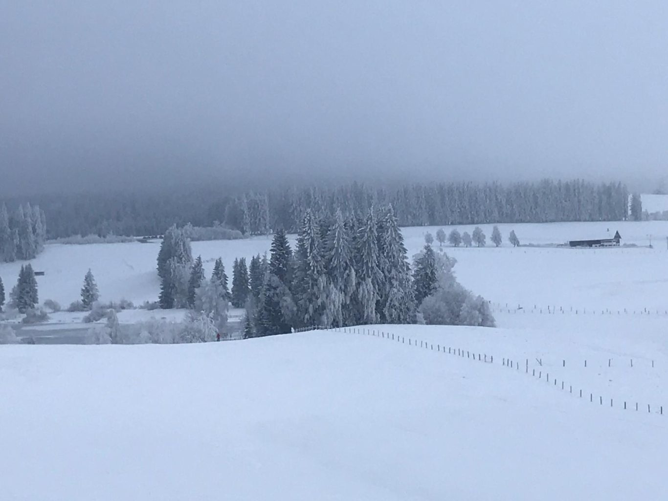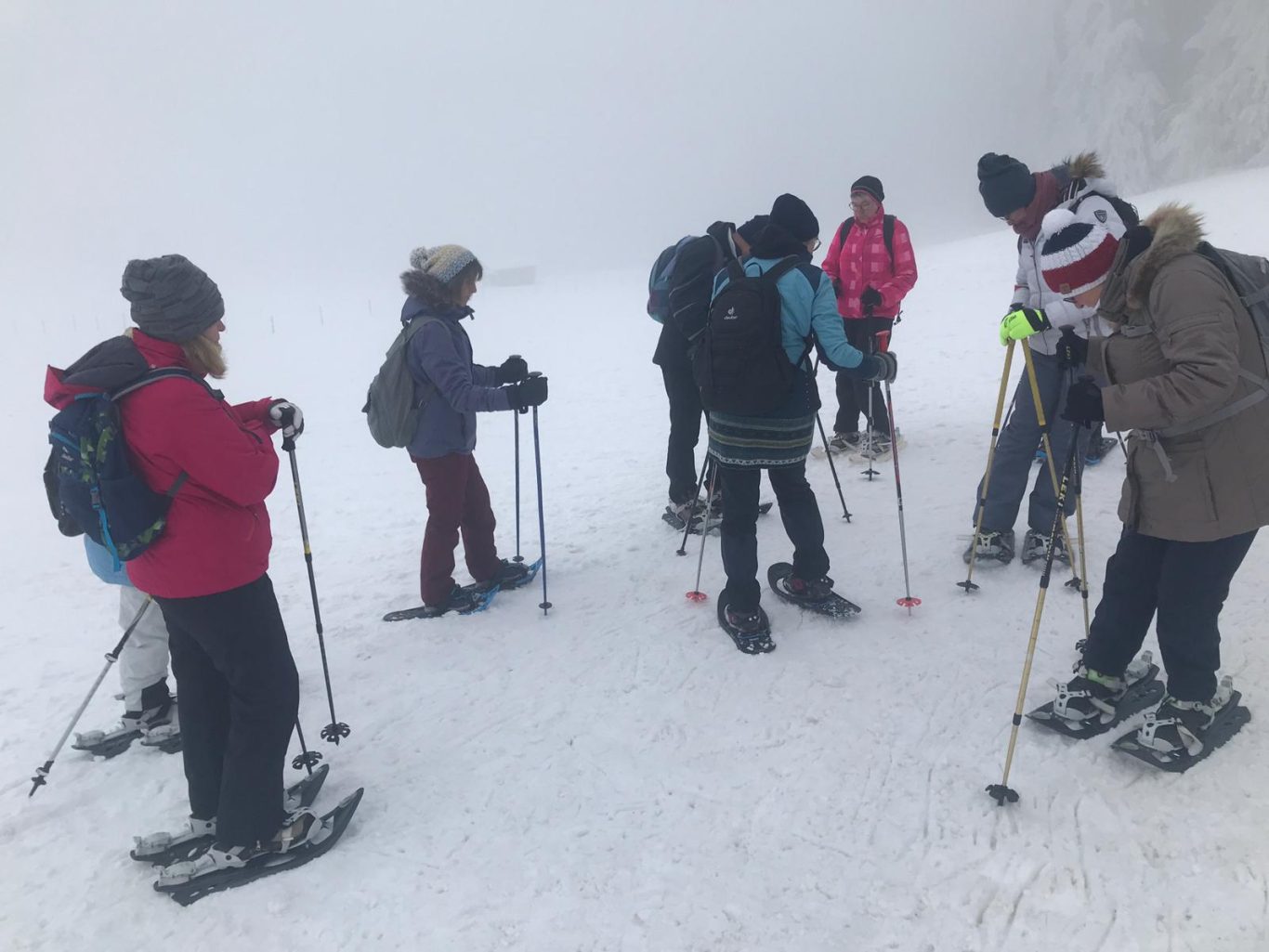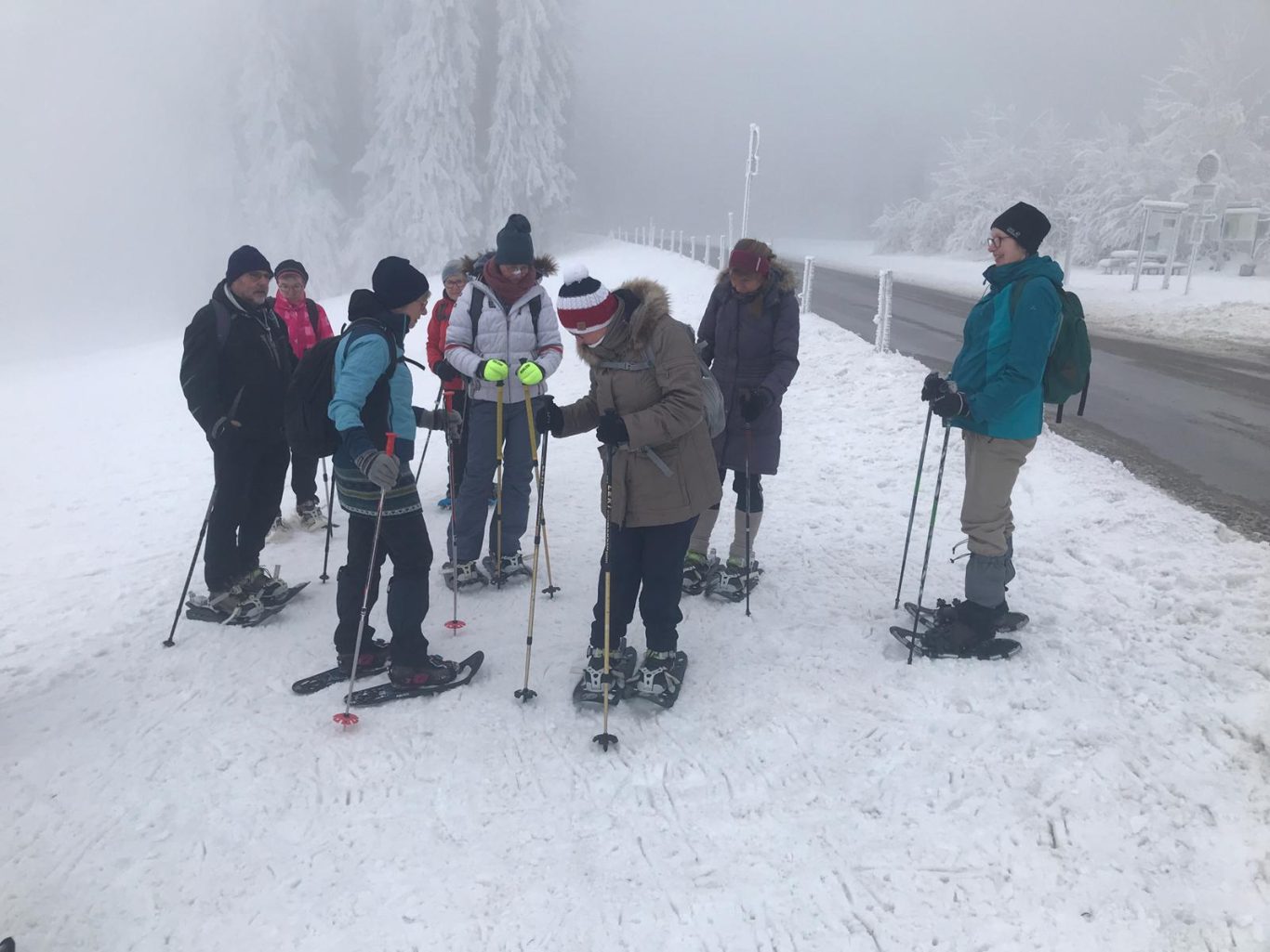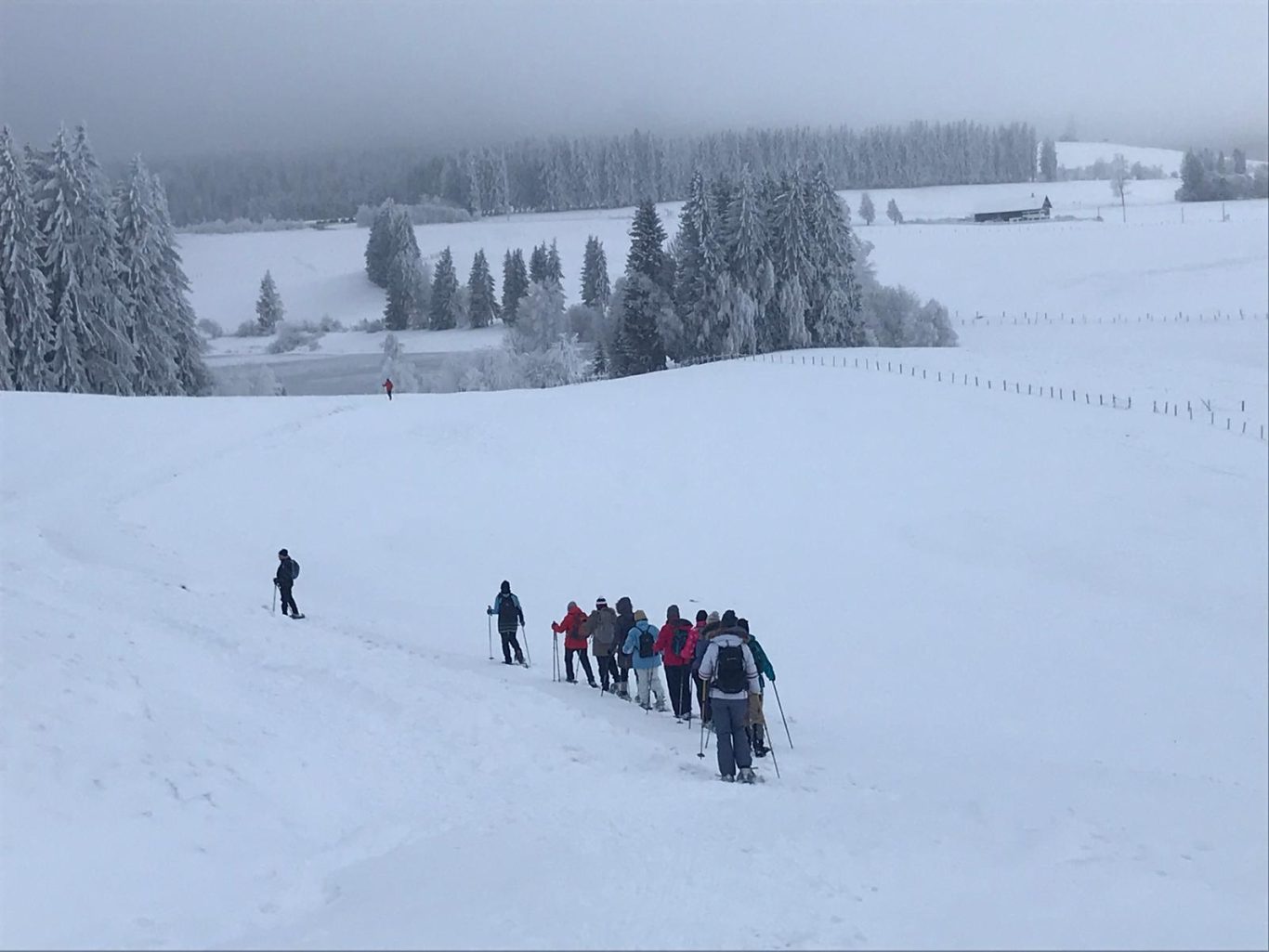 Nach einem fast schneelosen Januar starteten wir bei grauem und nebligen Wetter und fanden am Eschacher Weiher reichlich Schnee. 9 Neulinge im Schneeschuhwandern und drei „Betreuer/innen“ (Gertrud, Christine, Uli) erwartete zunächst dichter Nebel. Da wir drei uns dort bestens auskennen - kein Problem. Nachdem alle Schneeschuhe mit Unterstützung und Anleitung festgeschnallt waren, ging es mit vorsichtigen Schritten los. Langsam und umsichtig gewöhnten sich die Neuen bald an das ungewohnte, etwas breitere Gehen mit Schneeschuhen. Erschwerend war zunächst der leicht verharschte, verblasene Schnee. Das änderte sich bald und griffiger Neuschnee erleichterte das kräfteschonende, leicht gleitende Gehen. Tipps und Anregungen zum Gehen in unterschiedlichem Gelände wurden willig angenommen und sofort umgesetzt. So hatten alle bald Vertrauen in die ungewohnten Schneeschuhe gefasst und bewältigten leichte Steigungen oder Abstiege problemlos. Peter übernahm bald für mich das Vorspuren im tieferen Schnee. Danke! Da wir donnerstags unterwegs waren, konnten wir im Brotzeitstüble einkehren. Wir genossen die wohlige Wärme aus dem Kachelofen, die feinen Suppen und Kuchen und auch die gesellige Runde. Fast mussten wir zum Aufbruch drängen, da der Rückweg noch bevorstand. Letzte Hinweise zum Umgang mit den Schneeschuhen (Steighilfe, Stockeinsatz, Verhalten bei steileren Auf- und Abstiegen) begleiteten den Rückweg. Unterwegs war auch Zeit zum Fotografieren der unglaublichen Winterlandschaft. So kamen alle zufrieden und voller Stolz am Parkplatz an. Ein unvergesslicher Schneeschuhtag! Dank an Christine und Uli für die wertvolle Unterstützung!