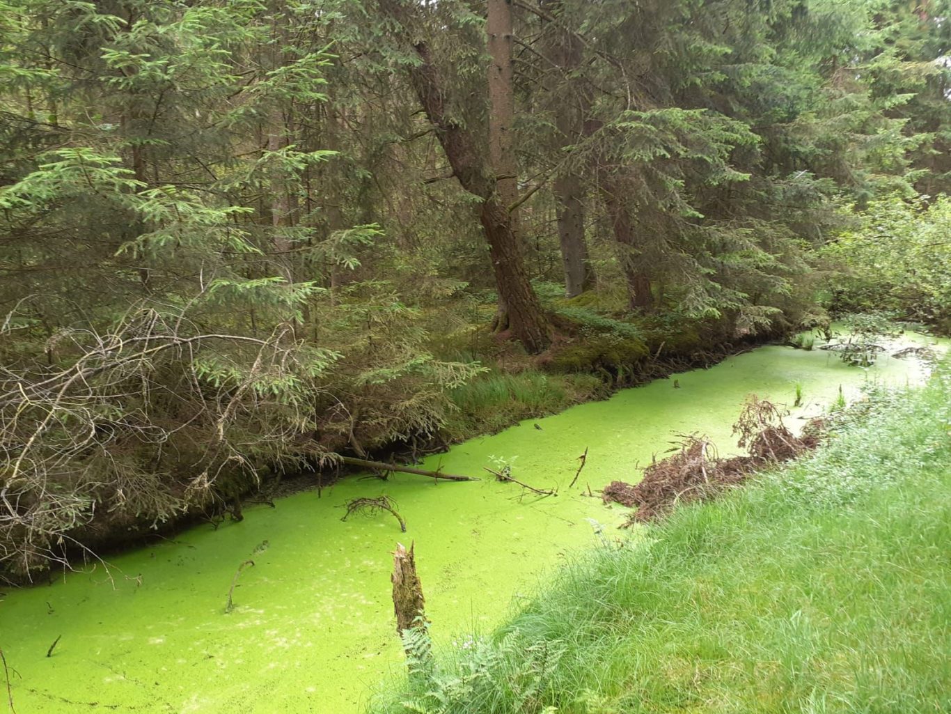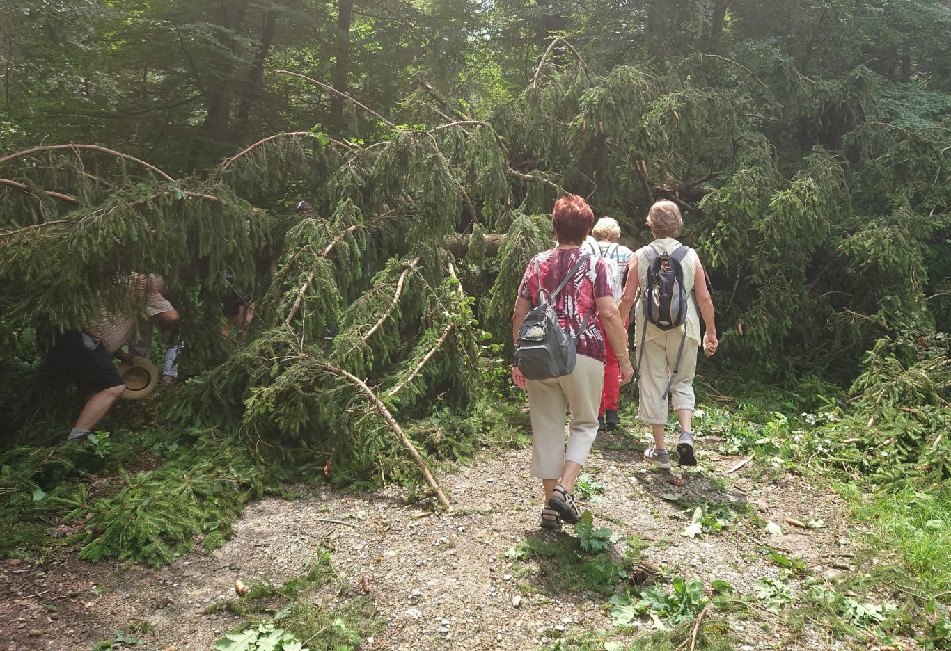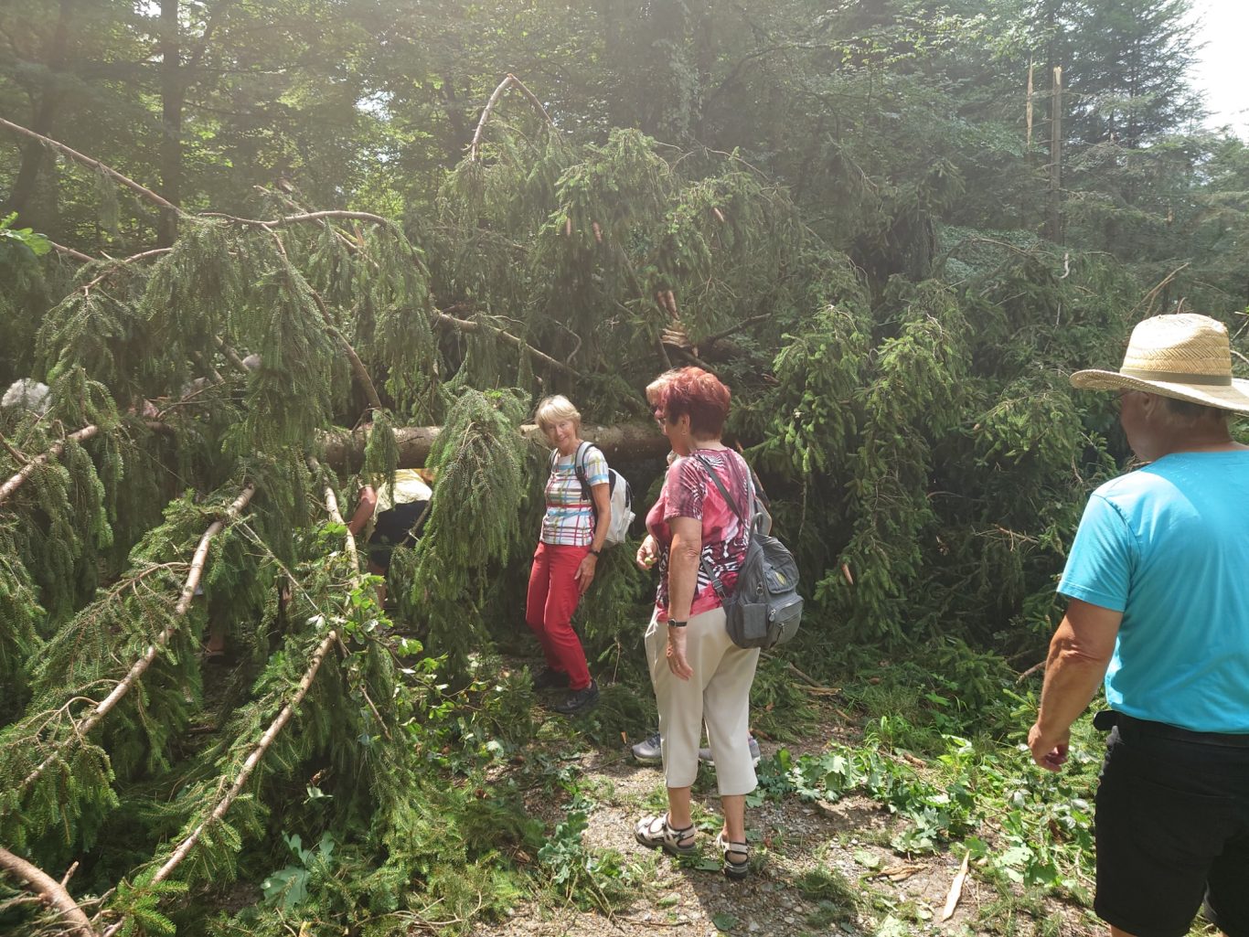 Schon bald wurde der Weg durch umgefallene Bäume etwas abenteuerlich, es mussten einige auf der Straße liegende Bäume überstiegen werden.