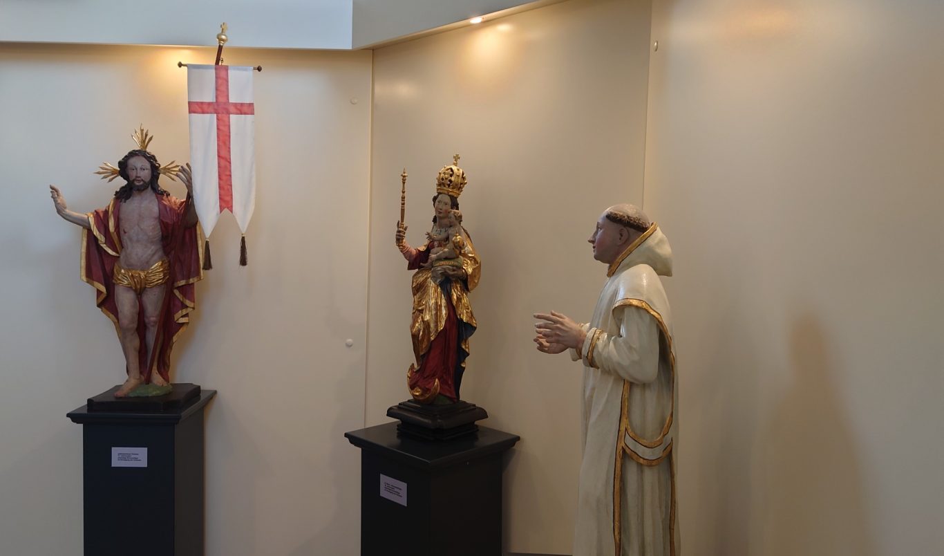 Die Strecke führte zunächst nach Unterschwarzach, wo die Gruppe einige Informationen über Bad Wurzach (flächenmäßig die drittgrößte Gemeinde Baden-Württembergs) und die Bedeutung des Wurzacher Rieds (größtes zusammenhängendes Hochmoor Mitteleuropas) erhielt. Danach ging es auf dem Radweg nach Bad Wurzach, welches ohne Aufenthalt durchquert wurde. Über Reichenhofen gelangte die Radlergruppe auf ruhigen, kleineren Sträßchen nach Tautenhofen (bei Leutkirch). Von dort führte der Weg steil nach oben zur im Jahre 2000 eingeweihten, 742 m hoch gelegenen Autobahnkapelle Winterberg („Galluskapelle“). Nachdem die schönen Ausblicke auf das Allgäu und die Stadt Leutkirch sowie das Vesper genossen waren, begab sich die Gruppe in die Kapelle, wo sie ausführliche Informationen über die Baugeschichte, die Symbolik des Innenraums und die Allgäuheiligen Columban, Gallus und Magnus erhielten, die zwischen dem 7. und 8. Jahrhundert das Allgäu christianisiert hatten. Vor der Autobahnkapelle befindet sich eine Bronze-Skulptur von ihnen mit ihren Attributen: Sonne (Columban), Bär / Holz (Gallus) und Drache (Magnus). Die Galluskapelle an der A 96 ist eine von vier Autobahnkapellen in Baden-Württemberg.