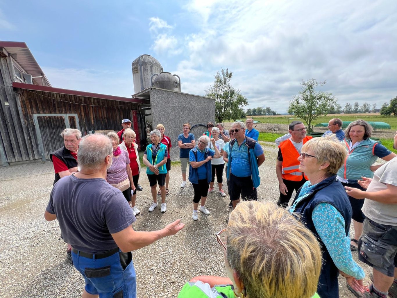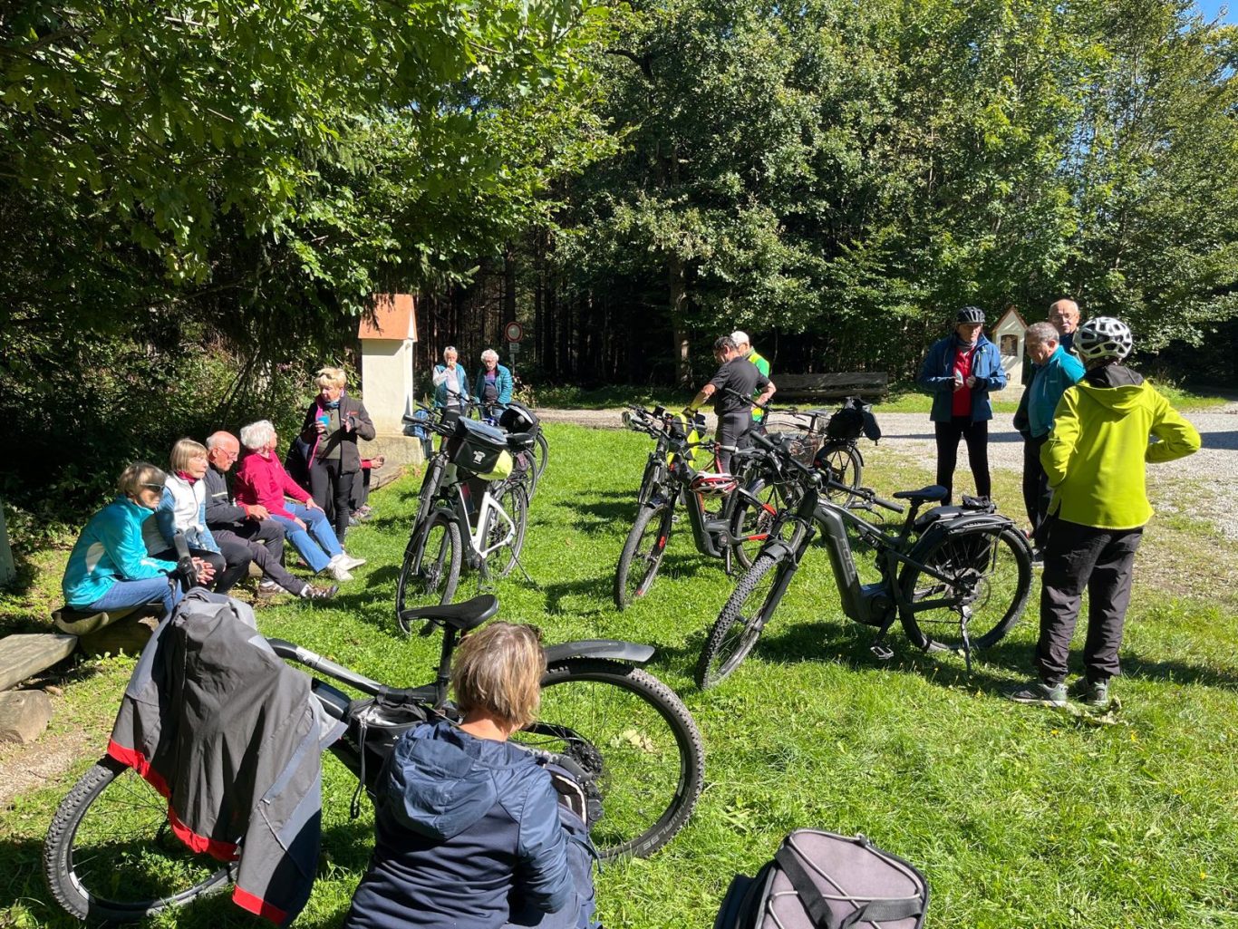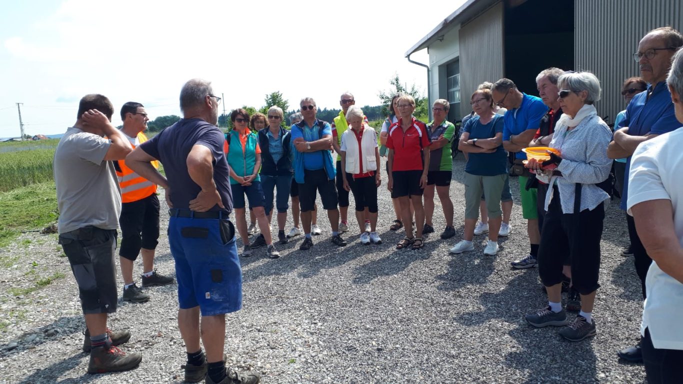 Die „Premierentour“, von Eberhard Lehmann als Tourleiter, ging am 17.Juli 2024 zum Aussichtspunkt Wachbühl oberhalb von Starkenhofen. Bei bestem Radlwetter starteten die 25 Spurwechselradler um 11 Uhr am Ziegelweiherparkplatz. Am St.Annaweiher vorbei ging es über Steinhausen, das Eulental zum ersten Aussichtspunkt oberhalb von Tristolz. Nach einer kurzen Trinkpause ( leider ohne Alpenfernsicht ) ging es weiter über Pfaffenried, Ruprechts und Hauerz auf Nebenstraßen nach Seibranz und zum Wachbühl. Auch dort blieb den Radlern der Blick auf die Alpengipfel leider verborgen. Stattdessen lauschten sie interessiert den Ausführungen von Uli Mebus, wie aus der Franzosenlinde dort eine Friedenslinde wurde. Ebenfalls auf Interesse stieß die Schautafel zur Entstehung Ober-schwäbischen Moränenlandschaft. Nach einem kurzen Stopp an einer Besenkapelle mit verschiedenen sachkundigen Ausführungen zu Eigenarten des Allgäuer Volksglaubens ging es in die Mittagspause zum „Steinhauser“ in Diepoldshofen.