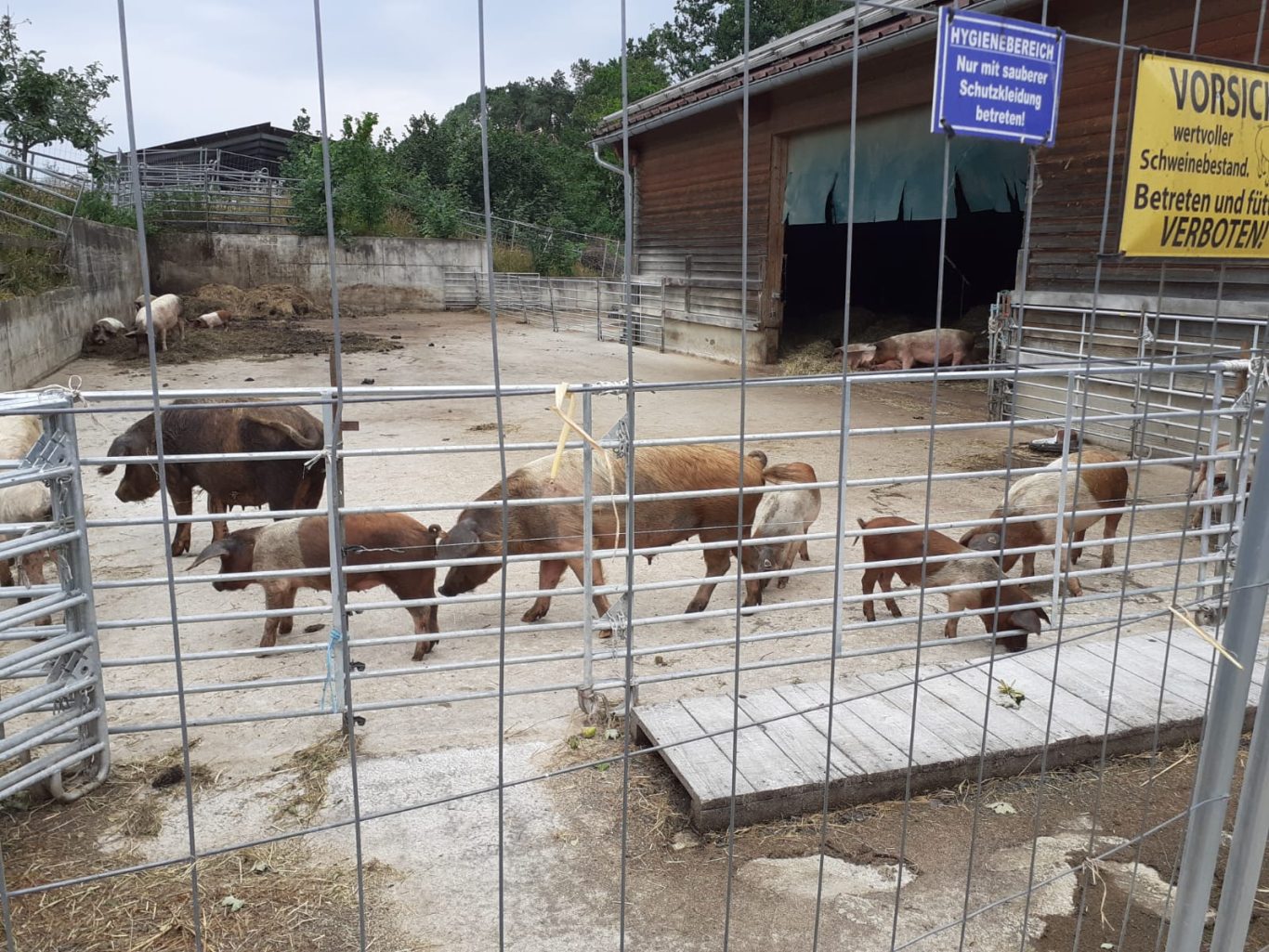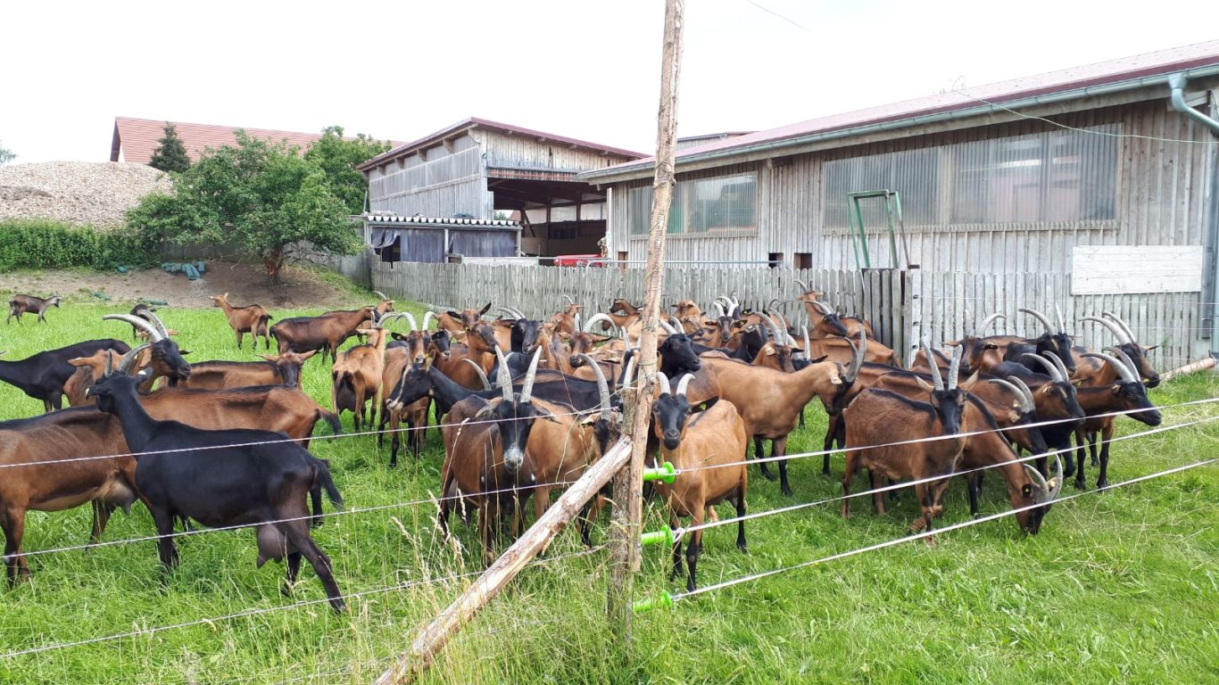 Auf dem Hof leben derzeit 56 neugierige und äußerst zutrauliche weibliche Jungziegen vom Frühjahr, die hauptsächlich als Zuchtziegen verkauft werden sollen; die männlichen Ziegen sind leider schon im Kochtopf gelandet. Milchziegen sind es 75. Diese werden täglich zweimal im Melkstand gemolken und geben dabei jede bis zu 4 l Milch am Tag, womit in der hofeigenen Käserei erstaunliche 800 kg Käse im Monat produziert werden. Dann gibt es auf dem Hof noch den stattlichen Ziegenbock und zwei Versuchsschweine. Versucht wird deren Mast mit Molke, was augenscheinlich bestens gelingt. Zu guter Letzt ist da noch ein Hühnerstall auf grüner Wiese für 280 Hühner.