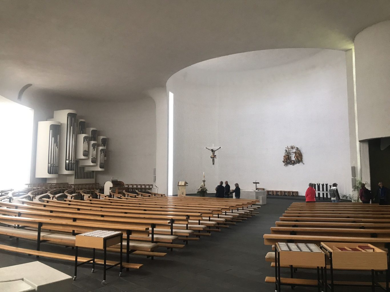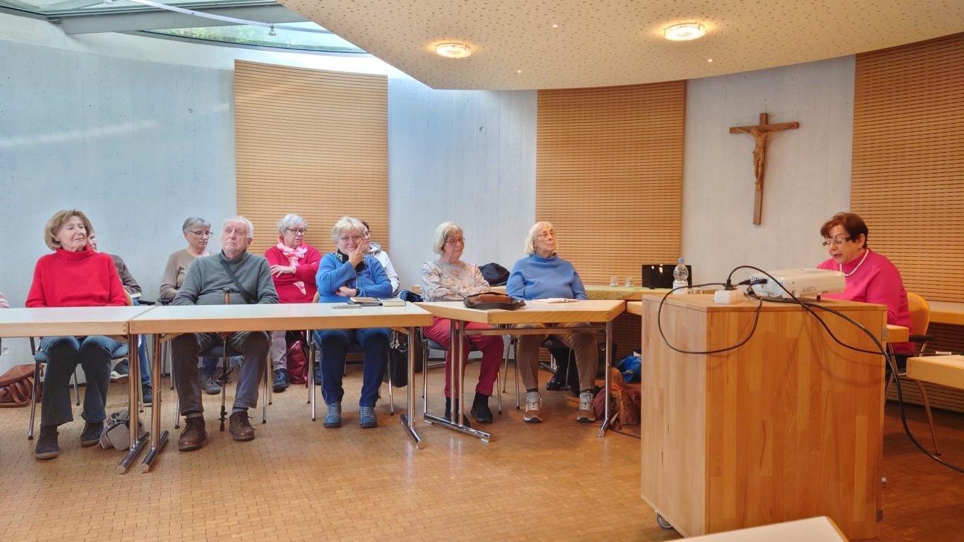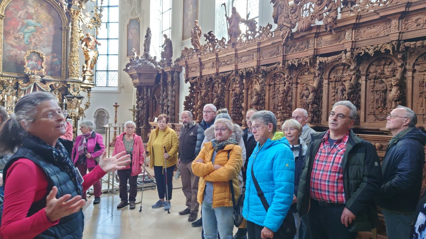Am Ausweichtermin Montag, 29.04.2024 fuhren 17 Spurwechsler/innen zunächst nach Untermarchtal. Bei manchen löste die Außenansicht der modernen Klosterkirche Verwunderung, Staunen oder zumindest Überraschung aus. In Sichtbeton sind zwei mächtige Rundtürme und ein halbrunder Mittelbau gestaltet. Die Begriffe „Burg“ und „Festung“ waren zu hören. Die Kirche wurde im Jahr 1972 eingeweiht. Vorbereitet mit einigen Erläuterungen gingen alle gespannt ins Innere der Kirche. Die Größe, Weite und Höhe überraschte noch einmal. Die Farbe weiß überwiegt; Lichtschächte und Oberlichter sorgen für strahlende Helligkeit. Die Bänke sind im Halbrund aufgestellt und bieten Platz für 750 Personen. Altar, Ambo und Tabernakel stehen an der tiefsten Stelle der Kirche: symbolisch für den in Jesus Christus „herunter“ gekommenen Gott. Die moderne Orgel mit 3000 Pfeifen steht frei im Raum. Die Architektur vermittelt spirituelle Inhalte.