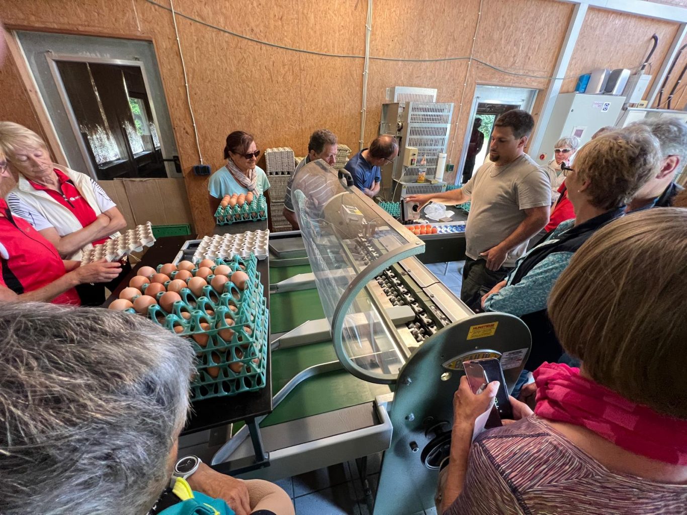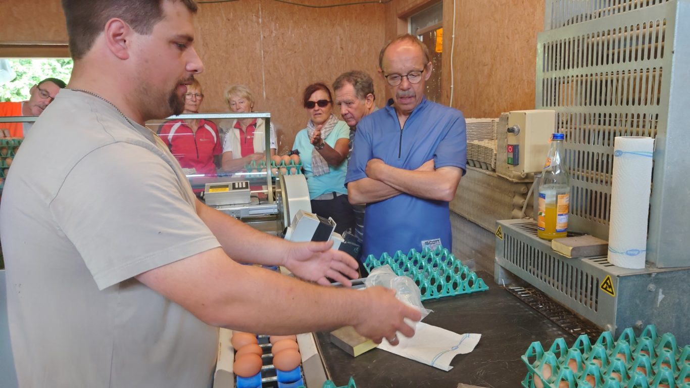 In Tannheim auf dem Demeter Geflügelhof Reisch ( AnGa Reisch GbR) haben uns Vater und Sohn Reisch ihren Betrieb, die Ställe und die Eiersortieranlage gezeigt und erläutert, wie gewirtschaftet wird und welche Bedürfnisse die Hühner haben. Geduldig und umfassend wurden alle unsere Fragen beantwortet.