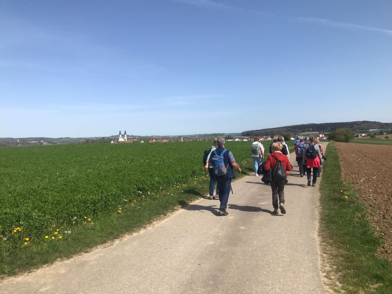 Auf einem Panoramasträßchen nach Eglofs wurden die wunderschönen Ausblicke auf das Alpenvorland und die Alpenkette genossen. Bald wurde Wangen erreicht und dort fand eine längere Kaffee- und Eispause statt. Frisch gestärkt machten sich die Teilnehmer auf den Rückweg nach Leutkirch. Am Hofgut Farny vorbei radelte die Gruppe auf einem schönen Radweg über Waltershofen und Gebrazhofen nach Tautenhofen und hinauf zur im Jahre 2000 geweihte Autobahnkapelle „Galluskapelle Winterberg“. Nachdem die tolle Aussicht auf die Allgäulandschaft und die Stadt Leutkirch genossen worden war, begab sich die Gruppe in die am höchsten gelegene Autobahnkapelle Deutschlands und erhielt Informationen über die Entstehungsgeschichte und die Symbolik sowie über die Allgäuheiligen Kolumban, Gallus und Magnus. Als Dank für den schönen Radltag sang die Gruppe ein Marienlied.