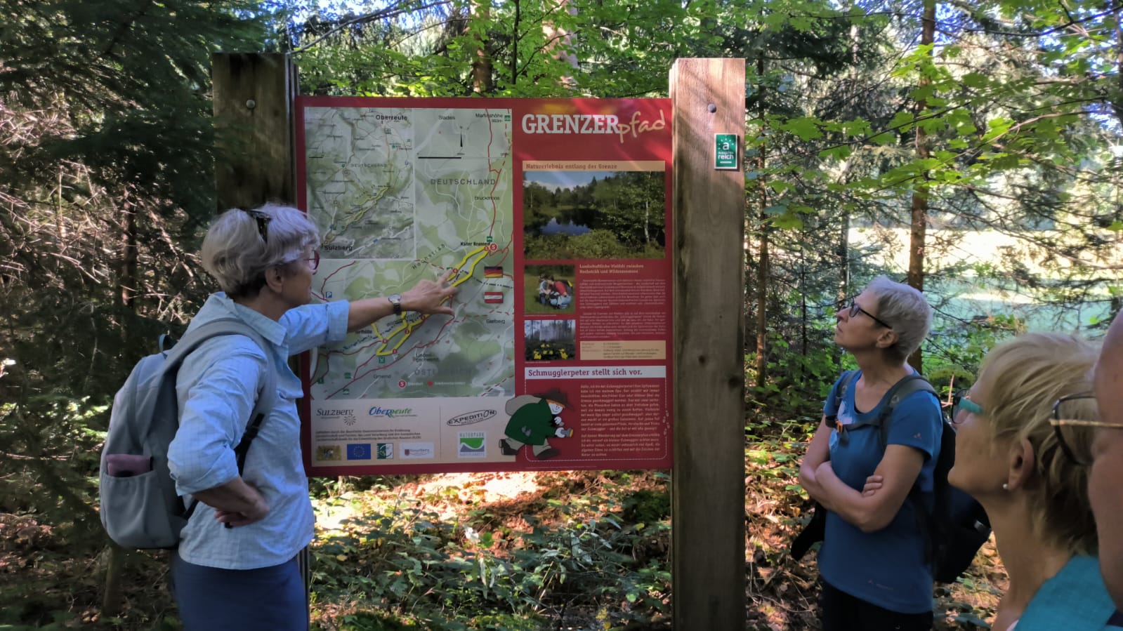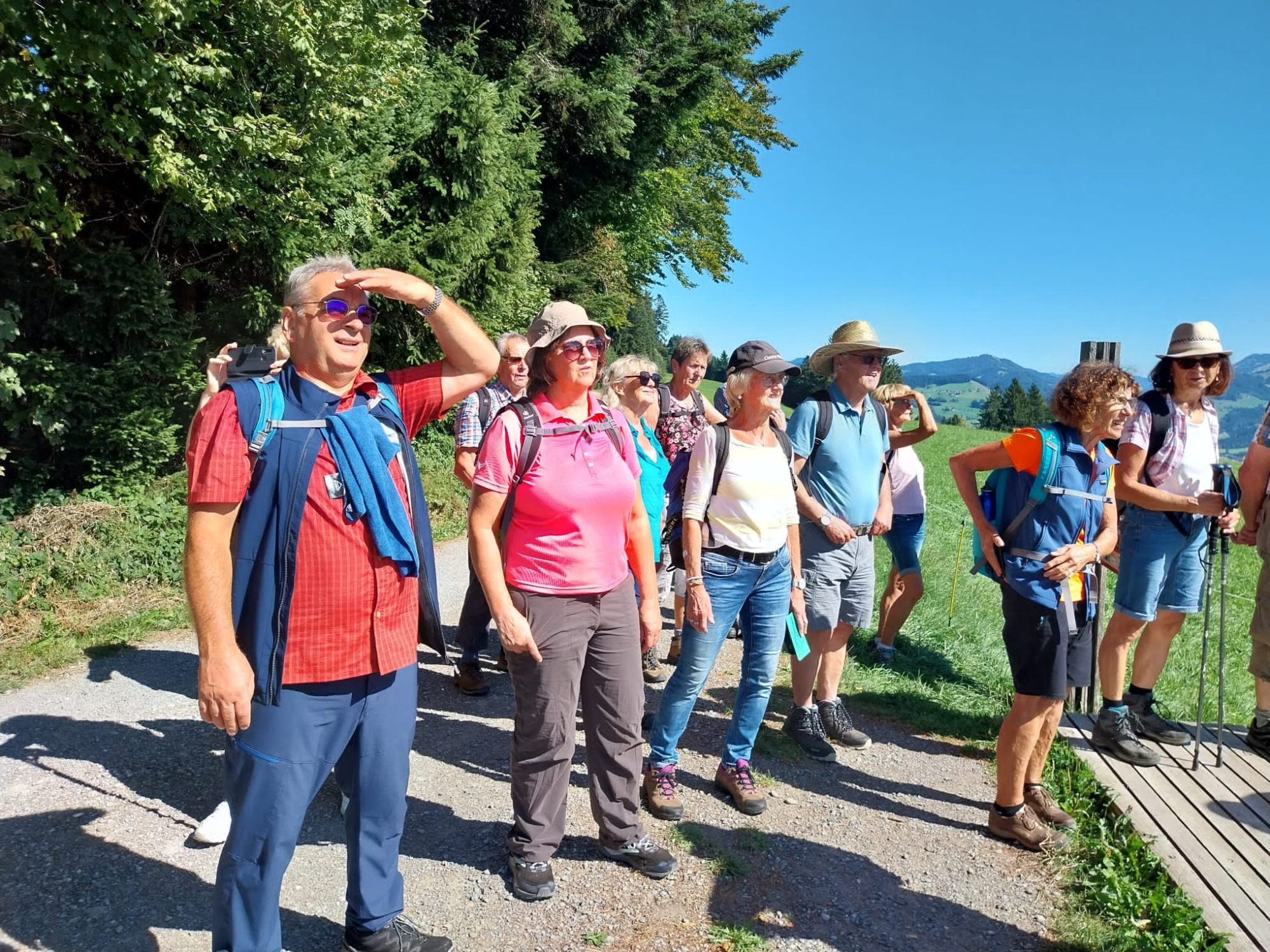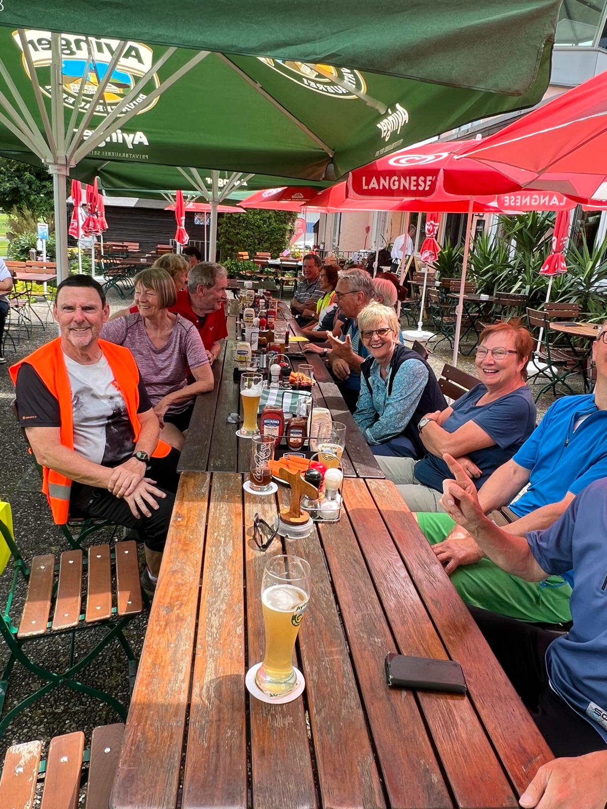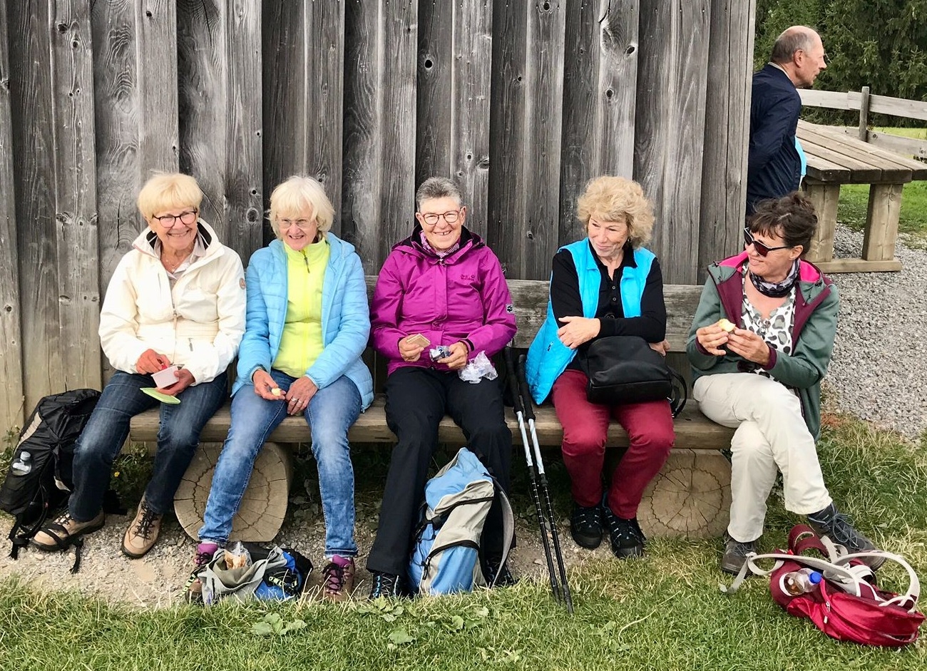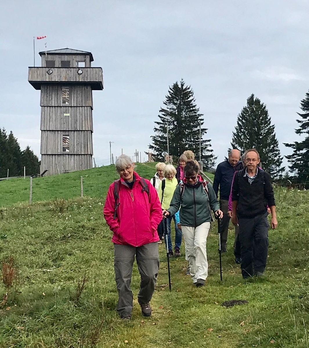 Am Mittwoch 20.09.23 fuhren 19 Spurwechsler nach Oberreute und machten sich auf den Weg nach Sulzberg. Das sonnige Wetter lud ein, den kurzen Anstieg zur Martinshöhe hochmotiviert anzugehen. Beim Gipfelkreuz angekommen, packten die ersten das Vesper aus und alle genossen den Blick hinunter nach Oberreute und weit hinaus Richtung Heimat. Der weitere Weg führte über Wiesen- und Waldwege. Die Sonne schien durch die lichten Waldstücke und gab angenehmen Schatten. Beim Kalten Brunnen trafen wir auf einen Ruheplatz mit Hütten, Bänken, Hängematten und Spielgeräten. Ganz Mutige wagten, im „Spinnenetz“ zu klettern. Kurze Zeit später kamen wir zum Grenzschild und zum „Schlagbaum“, der sofort mit dem angebrachten Seil heruntergeholt wurde. Ein seltenes Motiv für ein Gruppenfoto! Der Weiterweg führte auf dem Grenzerpfad durch ein Waldstück Richtung Sulzberg. Der Föneinfluss bescherte uns eine überwältigende Bergsicht, als wir auf dem Panoramaweg weiterwanderten. Die Berggipfel vom Säntis über den Bregenzer Wald, die Nagelfluhkette , der Hohe Ifen und der Widderstein standen klar und mächtig vor uns. In Sulzberg kehrten wir ein und freuten uns über die feinen Speisen und Kuchen. Selbst vom Restaurant aus konnten wir die Aussicht genießen. Nach dieser Erholungspause gingen wir auf dem Rückweg durchs Wildrosenmoos. Der Moorsee begeisterte alle und auch hier war ein guter Ort für ein Gruppenfoto. Am Grenzerhäuschen gab es viel zu bestaunen, denn die Ausstattung samt Zeitung von damals war sehenswert. Bis 1995 gab es hier Grenzposten, die nach festen Plänen auf Schmugglerjagd gingen. Der weitere Rückweg lag oft im Schatten, denn die Sonne begleitete uns den ganzen Tag. Die frohe und freudige Stimmung ist auf den Fotos zu sehen. Die angeregten Gespräche zeigten, dass sich alle wohl fühlten und den Wandertag in netter Gesellschaft bei strahlendem Sonnenschein genossen. Auch die fünf „Neuen“ lobten die angenehme und frohe Gesellschaft. Einen besonderen Dank möchte ich Sigrid Buhl aussprechen, die mich umsichtig und tatkräftig bei der Durchführung des Wandertages unterstützte. Herzlichen Dank auch denen, die fotografiert haben!